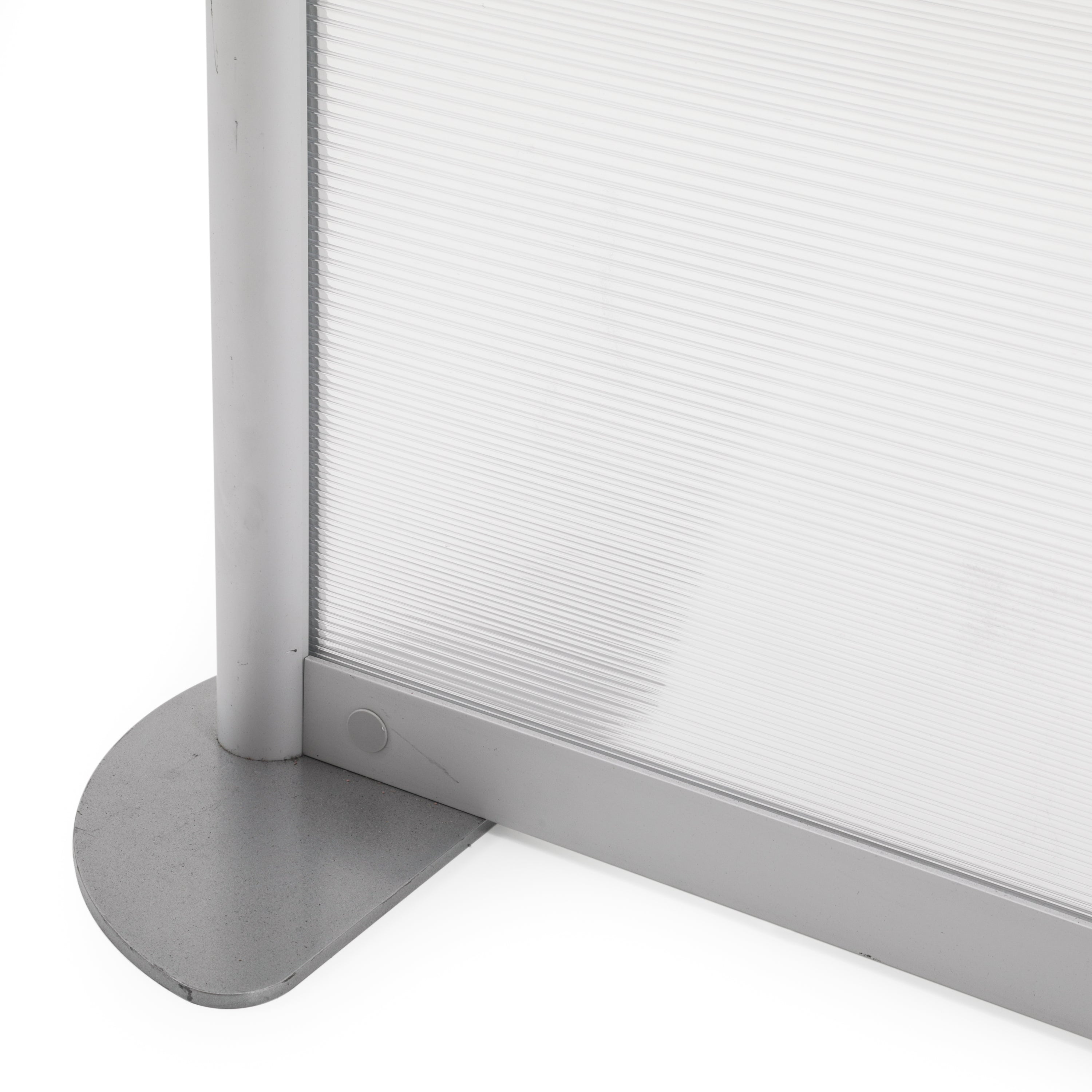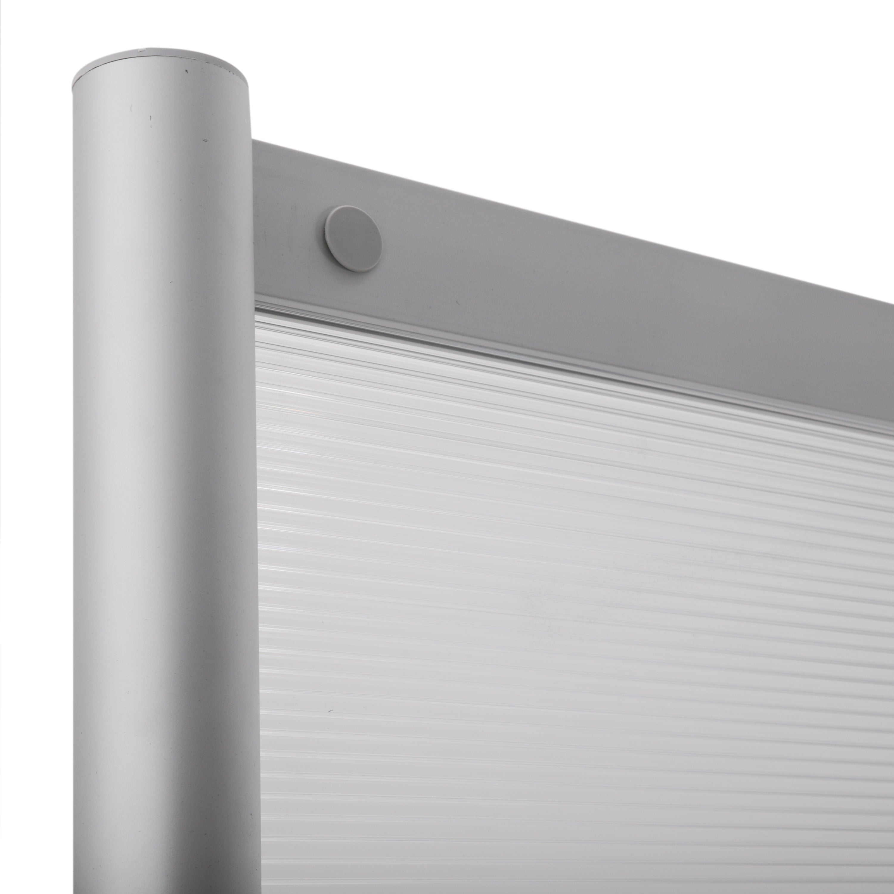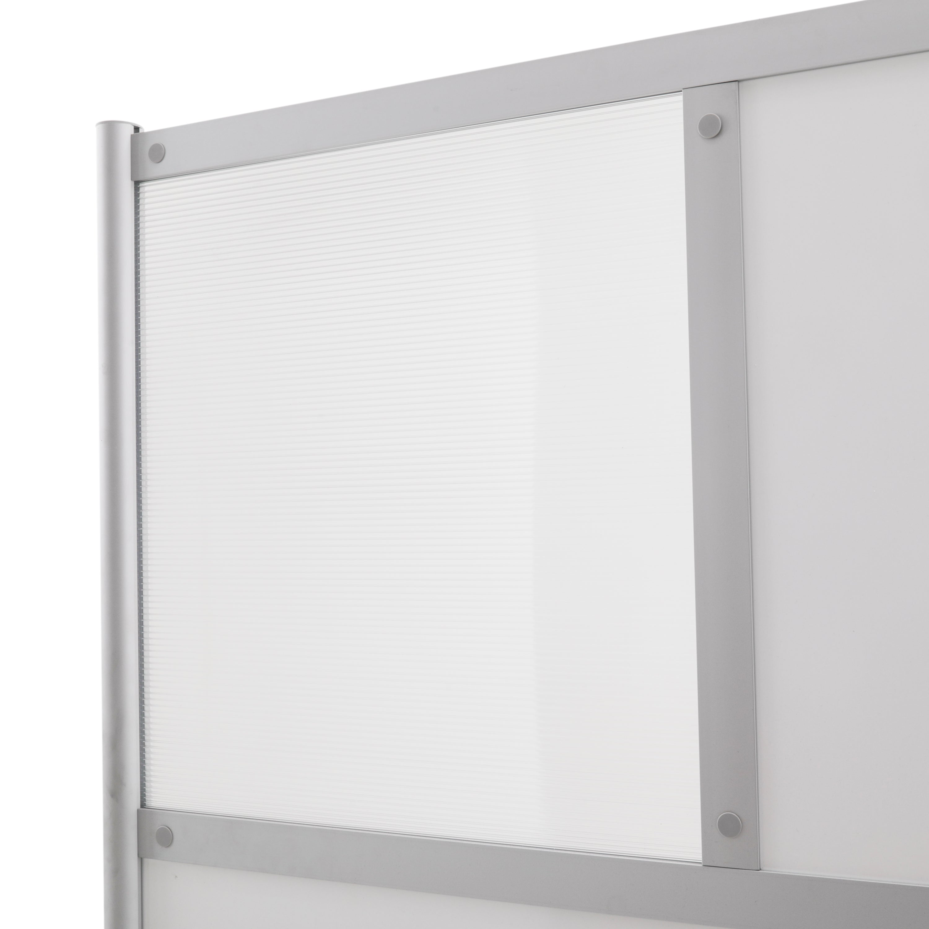 Details: Silver partition with opaque acrylic windows and white board panels. Dimensions: 77.5" H x 100" W x 13" D