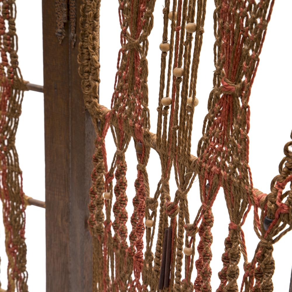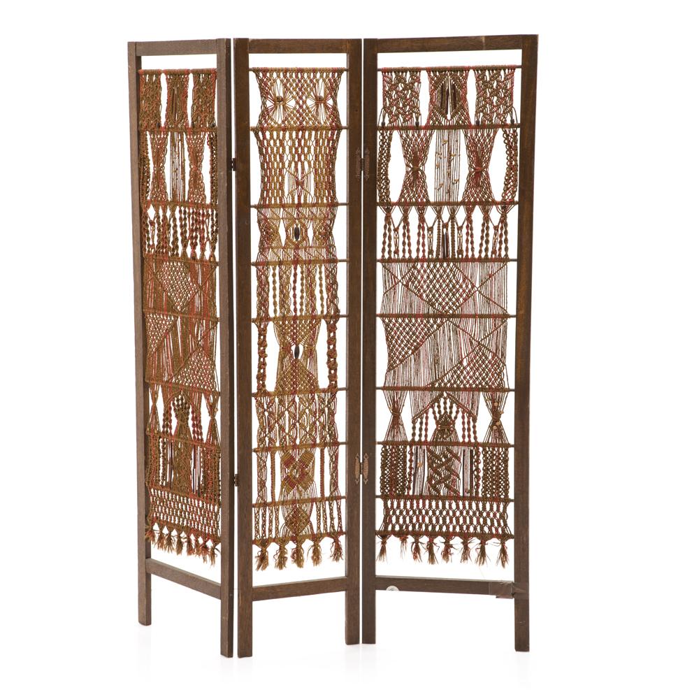 Details: Folding three-panel brown and orange woven macrame fabric bohemian room dividerDimensions: 65.75" H x 50.5" W