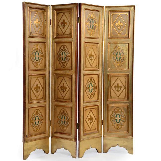 Description: Brown and gold painted foldable screen room divider with vintage French details. Dimensions: 79" H x 64" W x 1.5" D