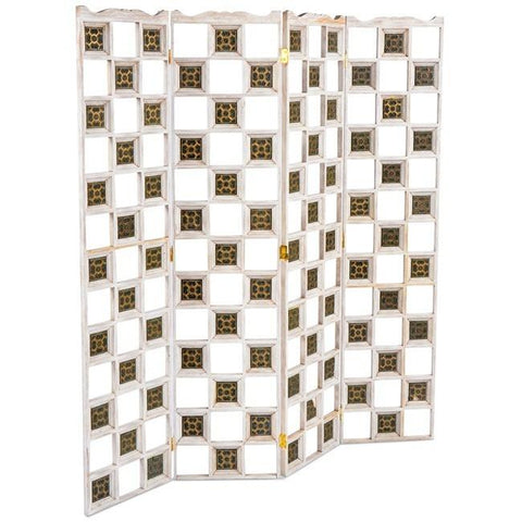 Details: White 5-panel room divider screen with cross hatch cutouts (some wear) Dimensions: 72" H x 54" W x 1"D Quantity: 1