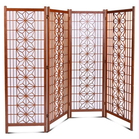 Details: Wooden screen with floral star patterns and 4 panels of the white & brown varietyDimensions: 71" H x 96" W