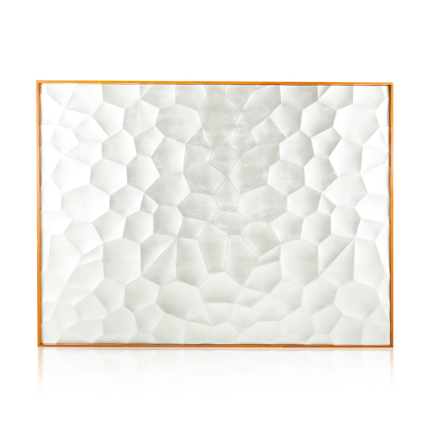 Details: White leather strap divider with cutout squares. Dimensions: 70" H x 48" L x 1" W