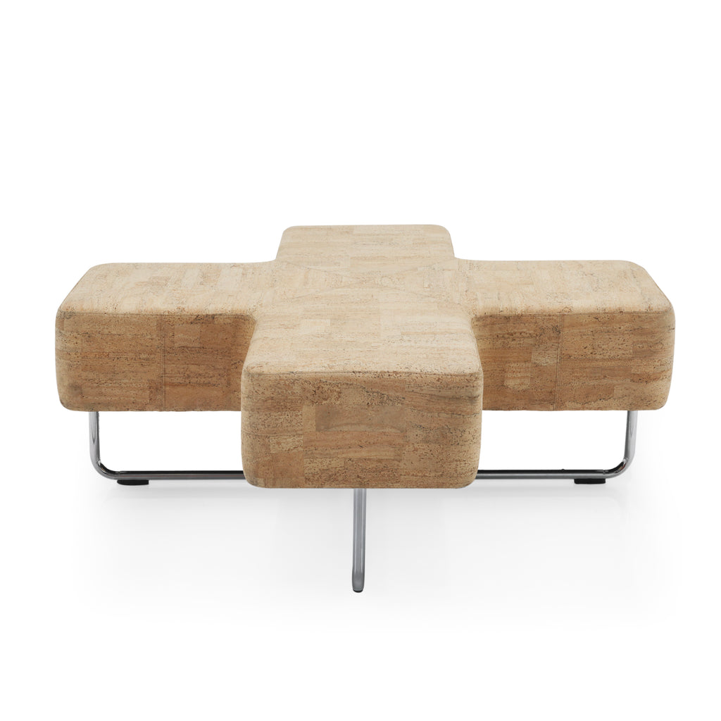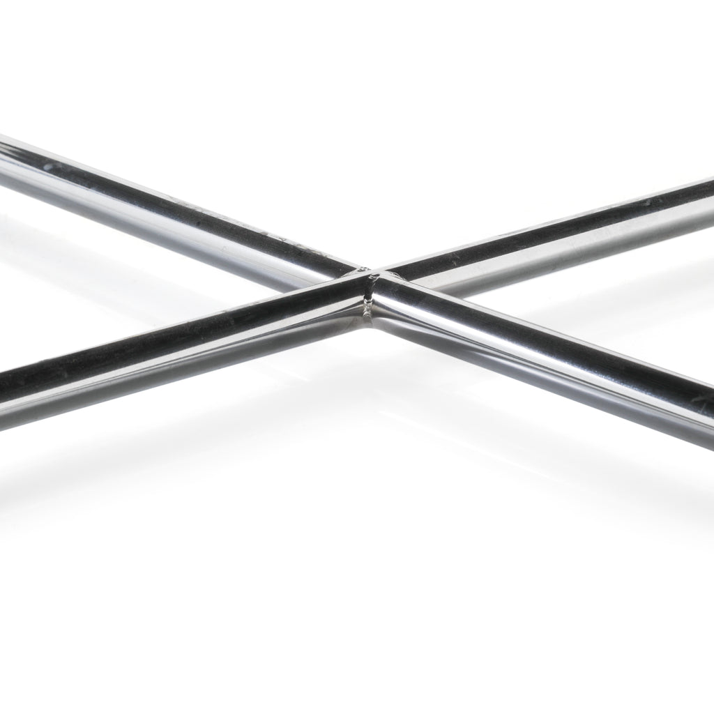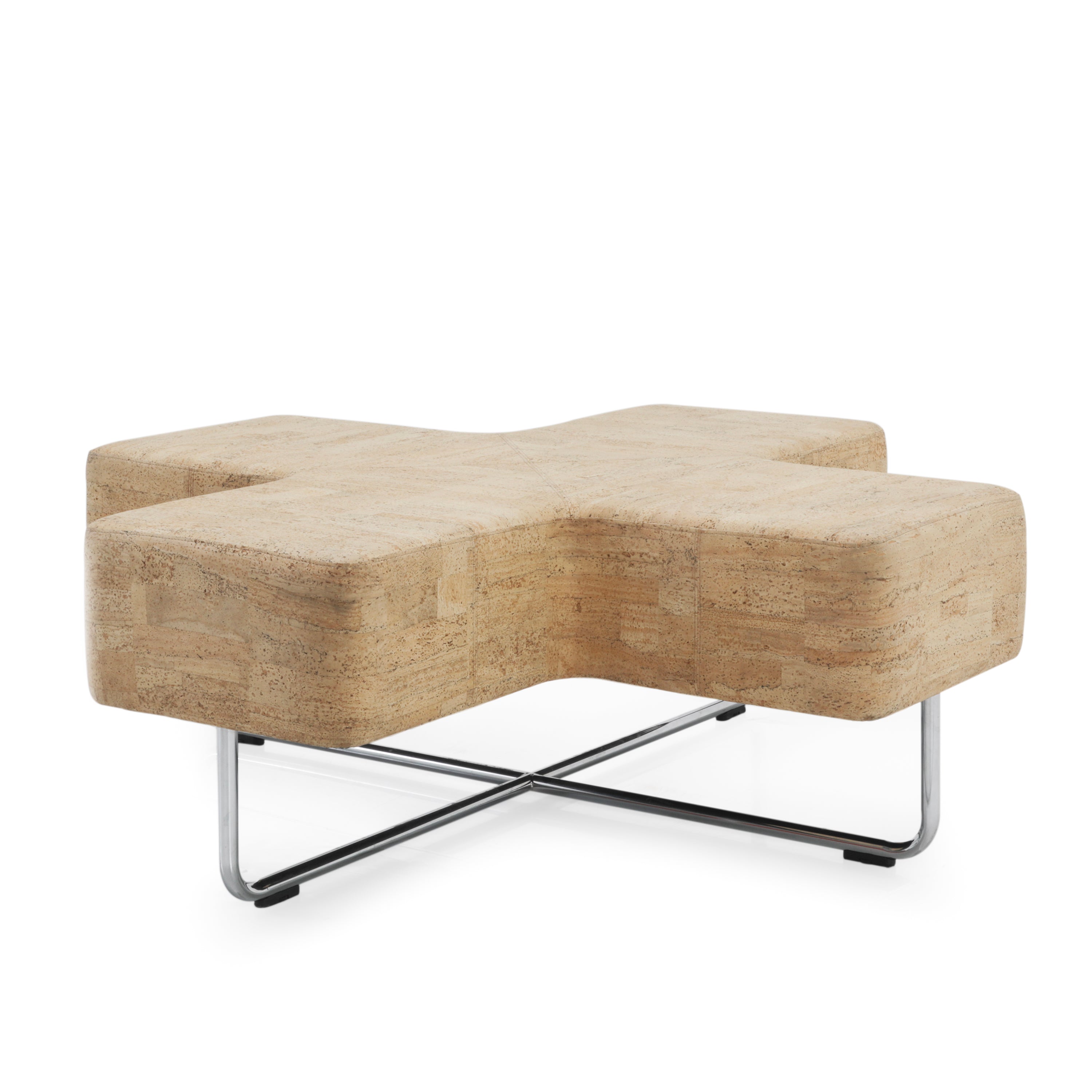 Details: Beige X-shaped vinyl bench with chrome base. Dimensions: 19" H x 52" W x 52" D