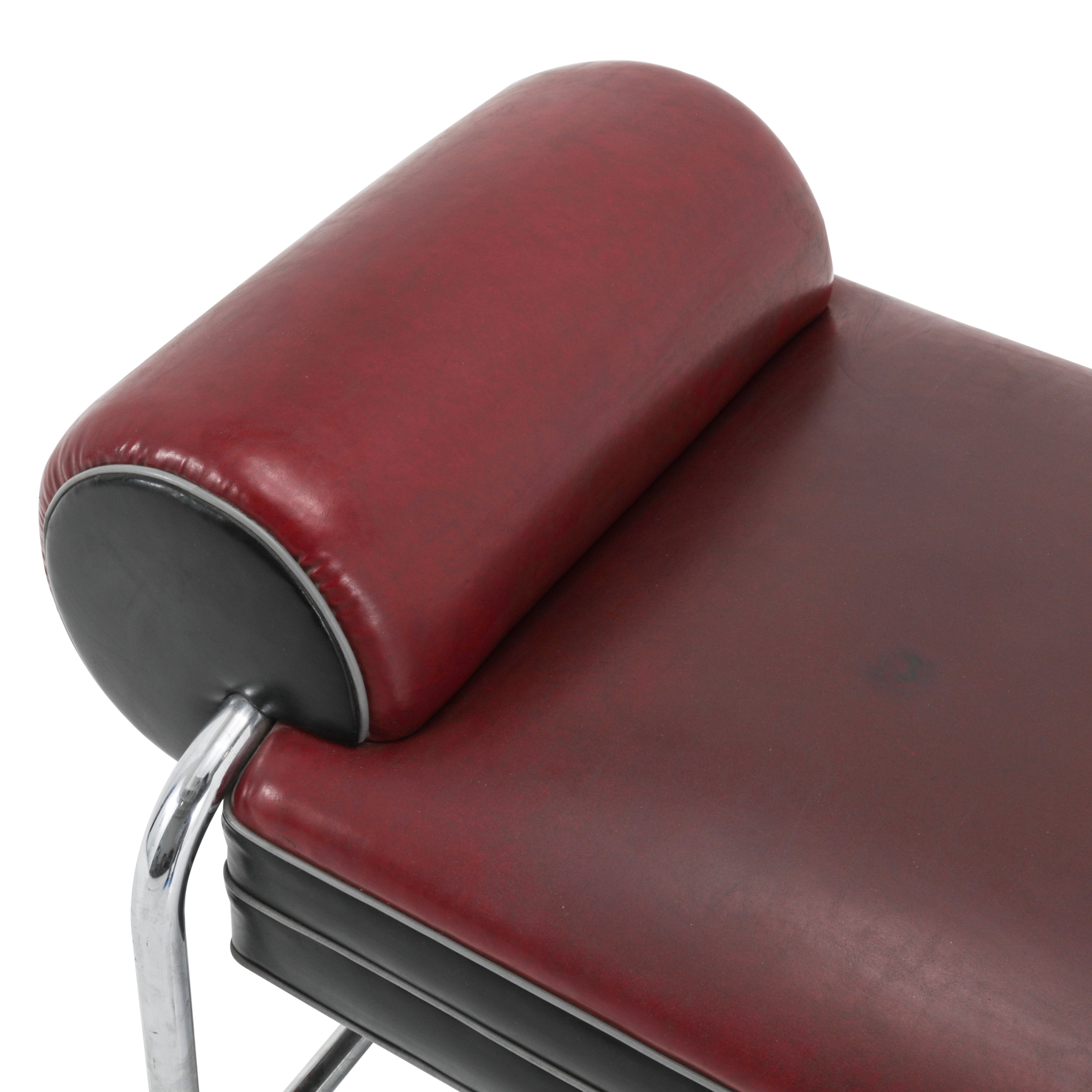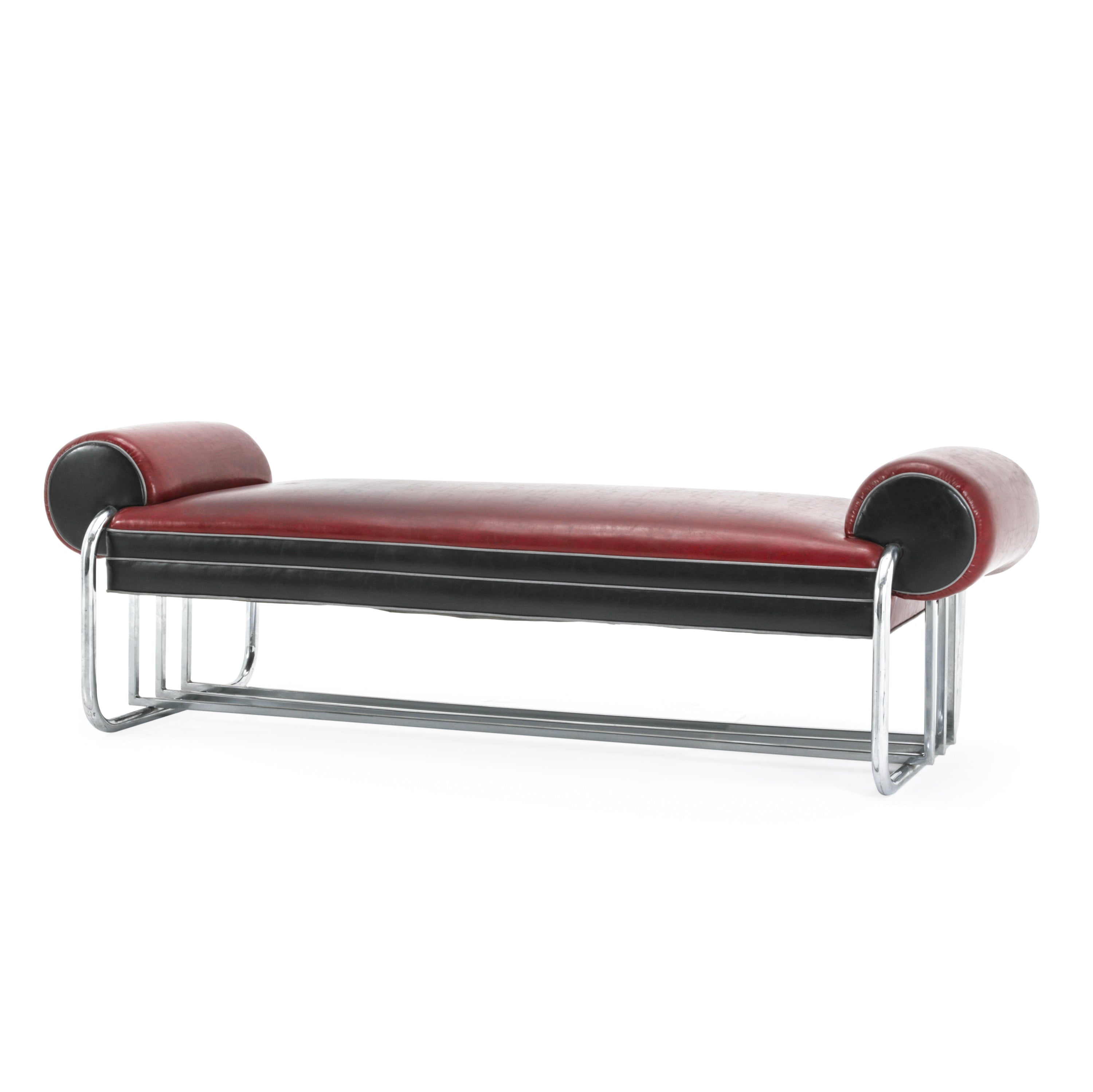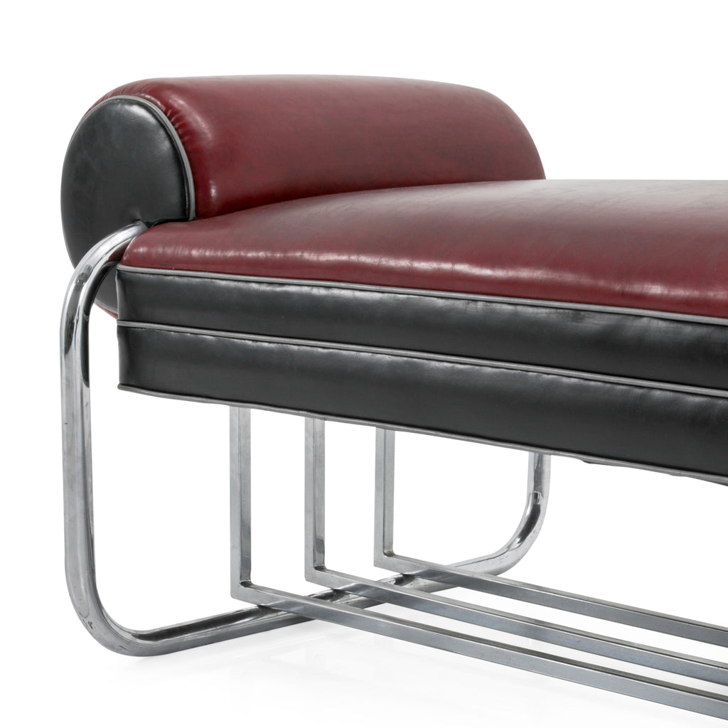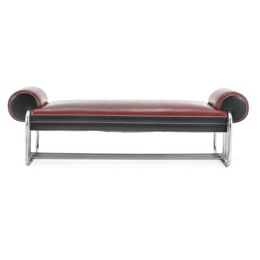 Details: Upholstered deco bench with red leather top and black side panels. Rounded sides and chrome base. Dimensions: 26" H x 77" W x 30"...