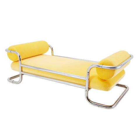 Details: Yellow velvet daybed / sofa / bench with chrome tubular structure design Dimensions: 30" H x 85" W x 45" D Quantity: 1