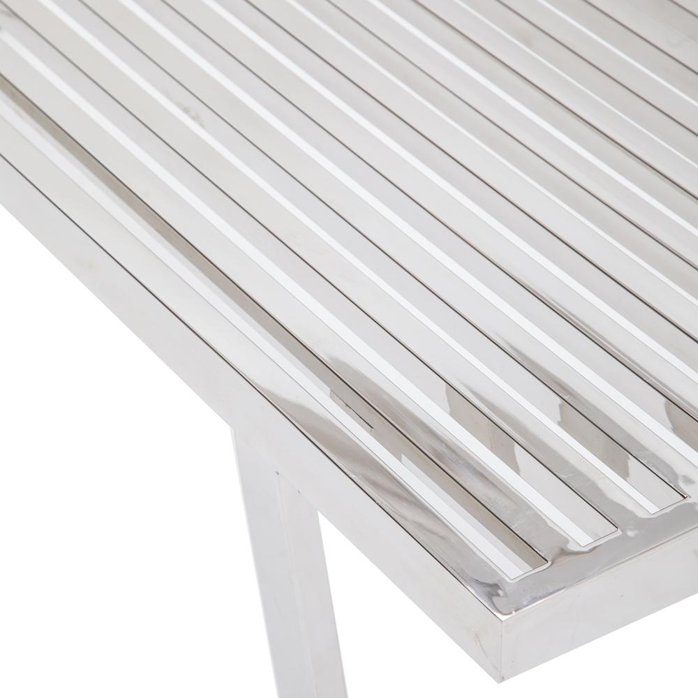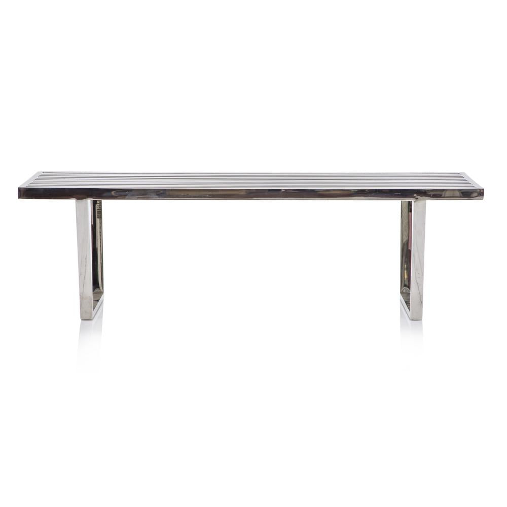 Details: Chrome Slatted Bench, Shiny, Silver, Metal Dimensions: 17" H x 60" W x 16.5" D Quantity: 1