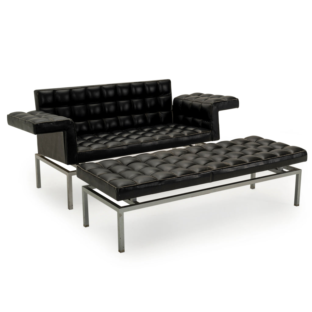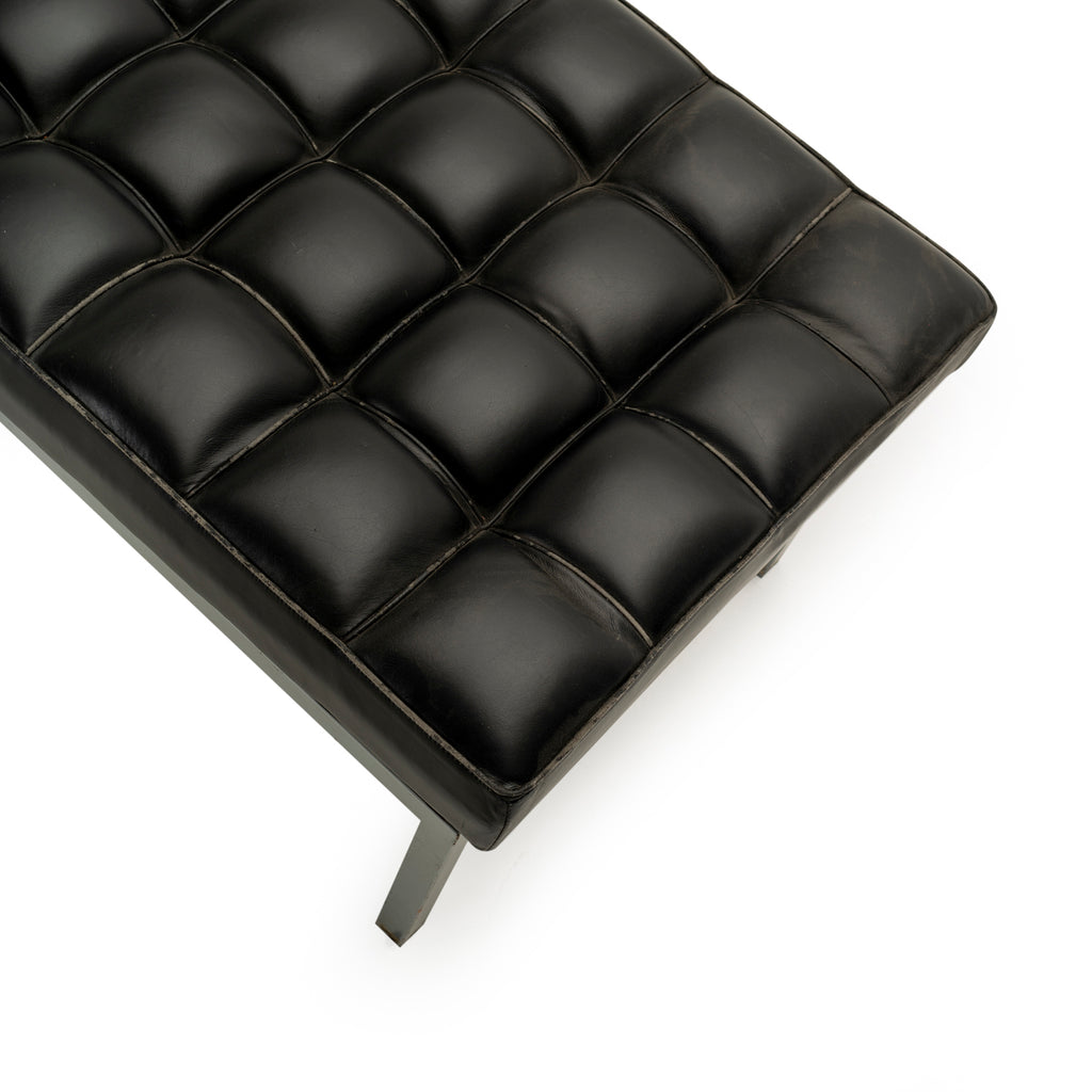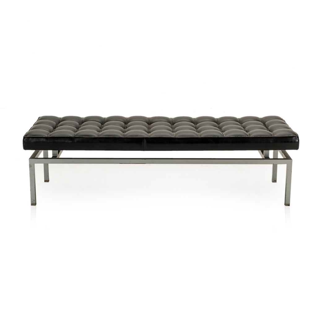 Details: Tufted black leather ottoman with chrome base, with matching loveseat available Dimensions: 18" H x 64" W x 23" D