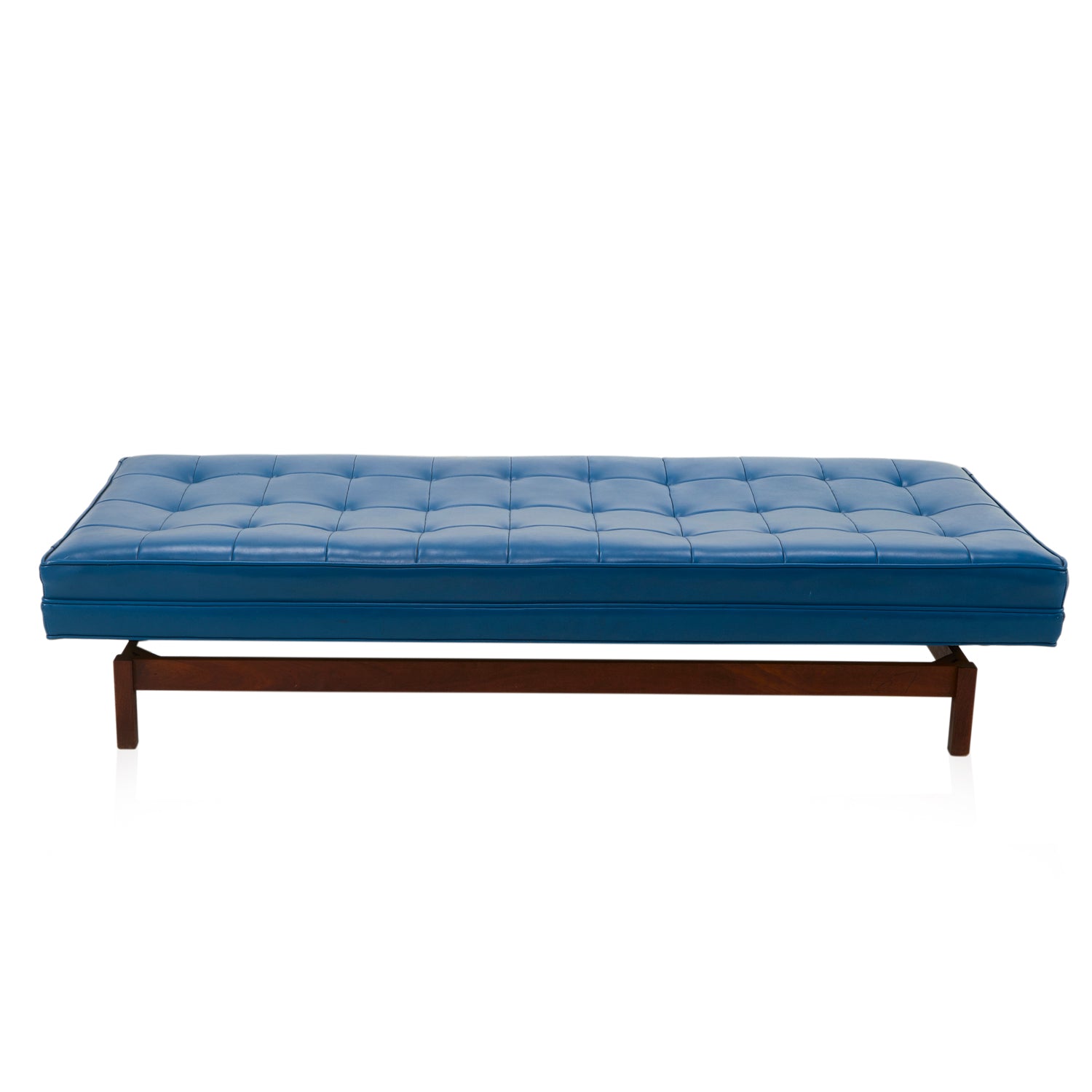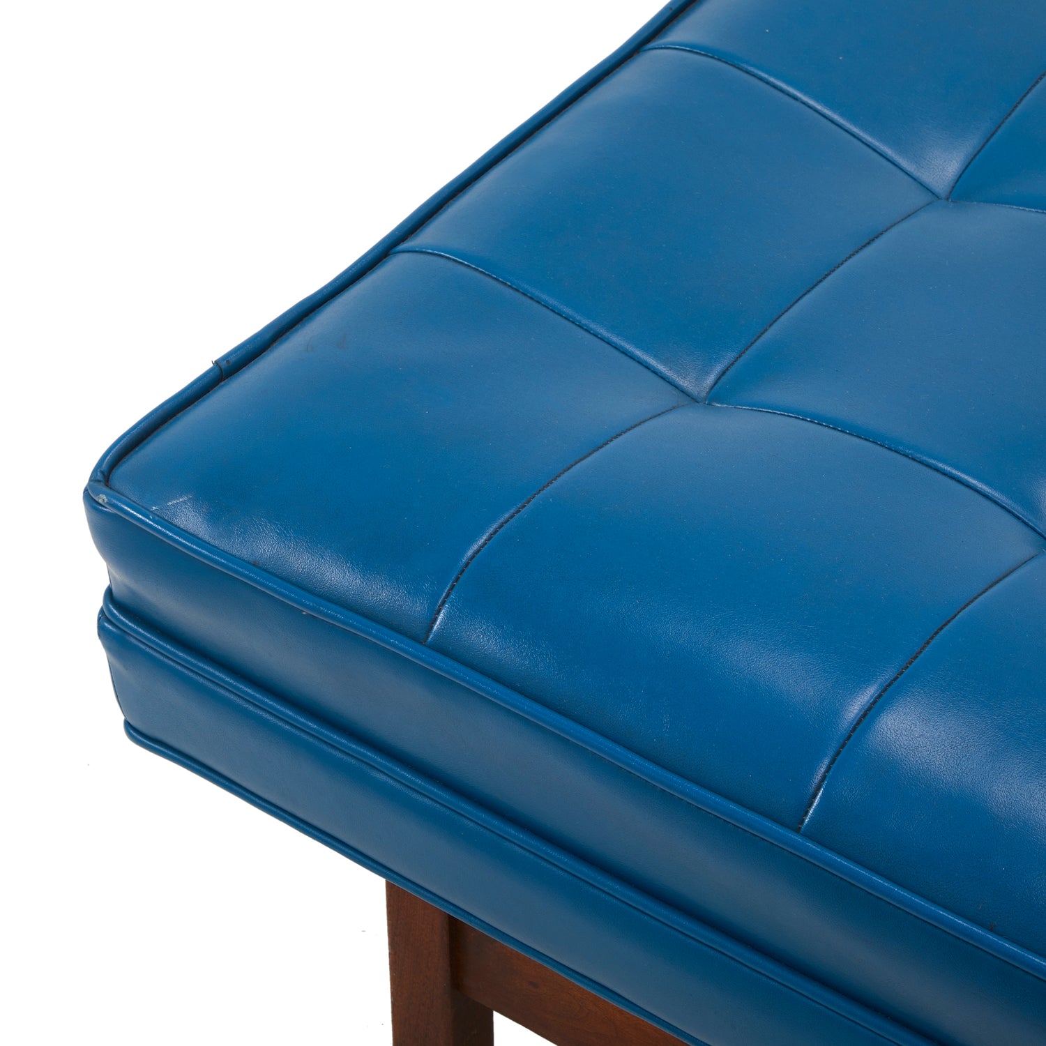 Details: Blue vinyl floating bench with flat tufted seat and a dark wood frame Dimensions: 16" H x 72.5" L x 30" D