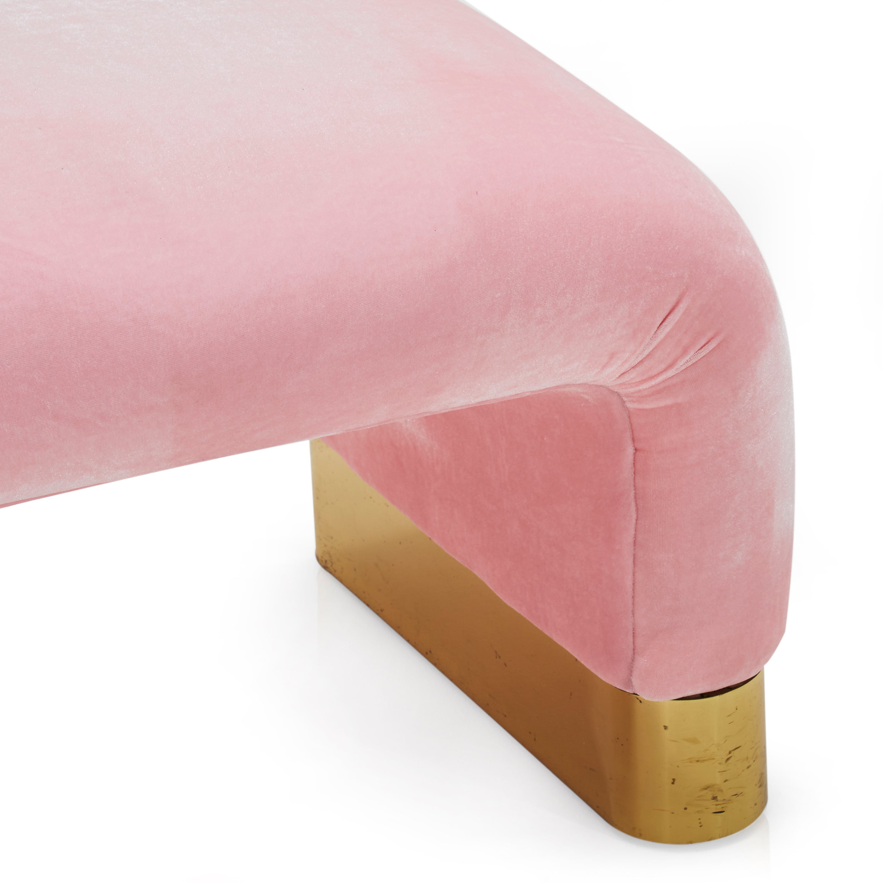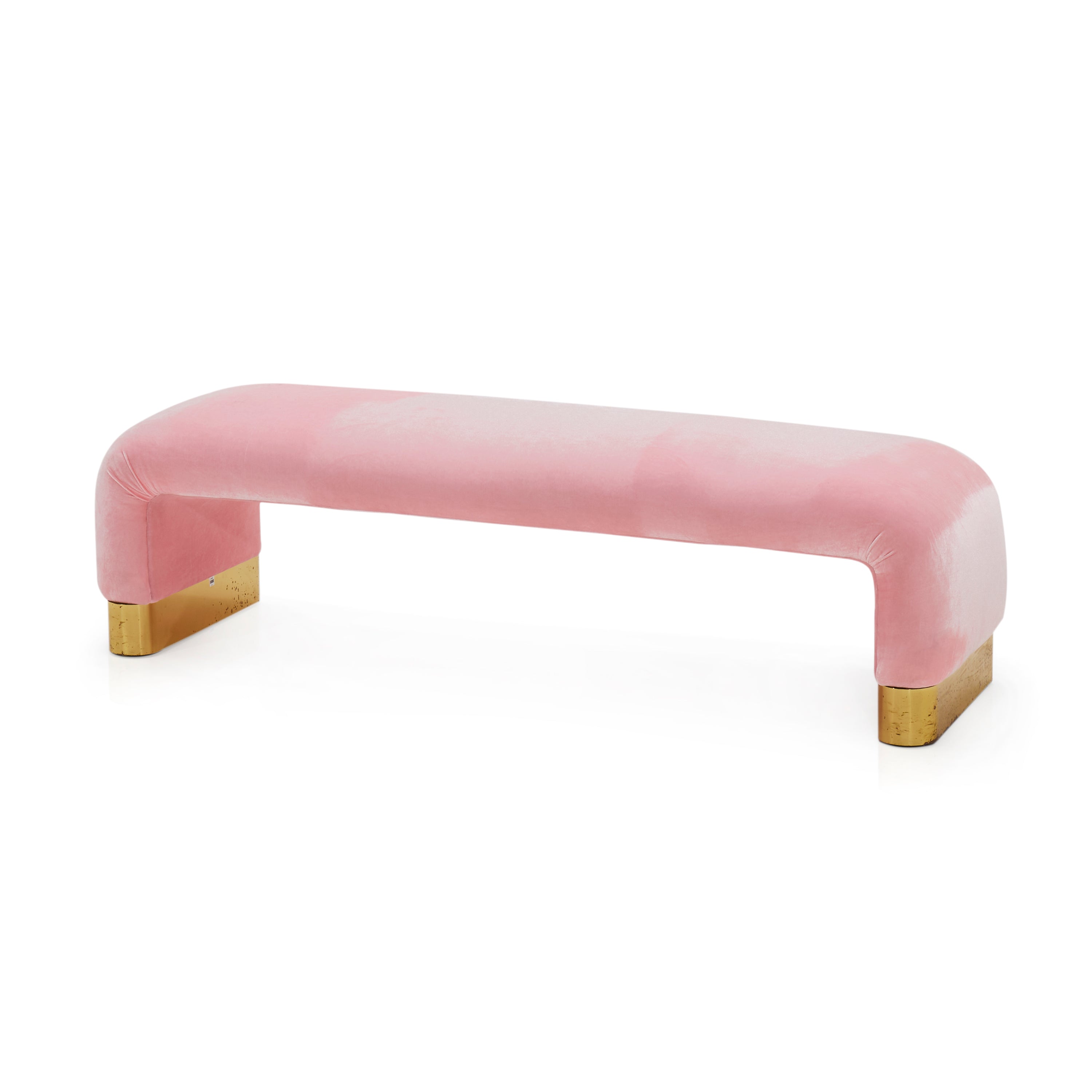 Details: Gold regency bench with pink velvet cushion Dimensions: 22" H x 60" W x 18" D Quantity: 1