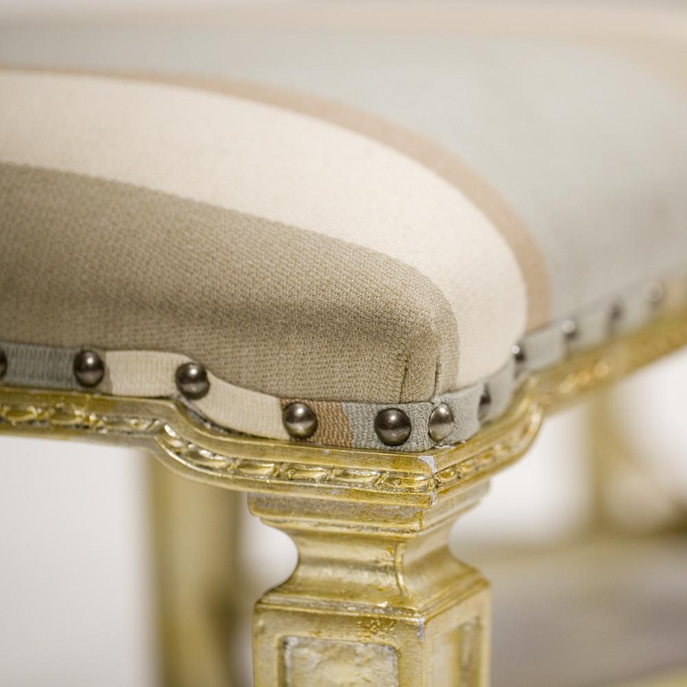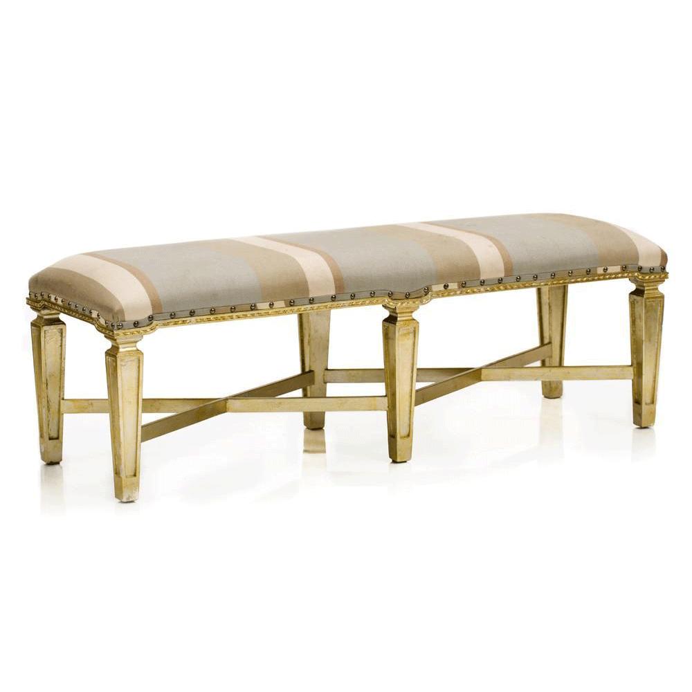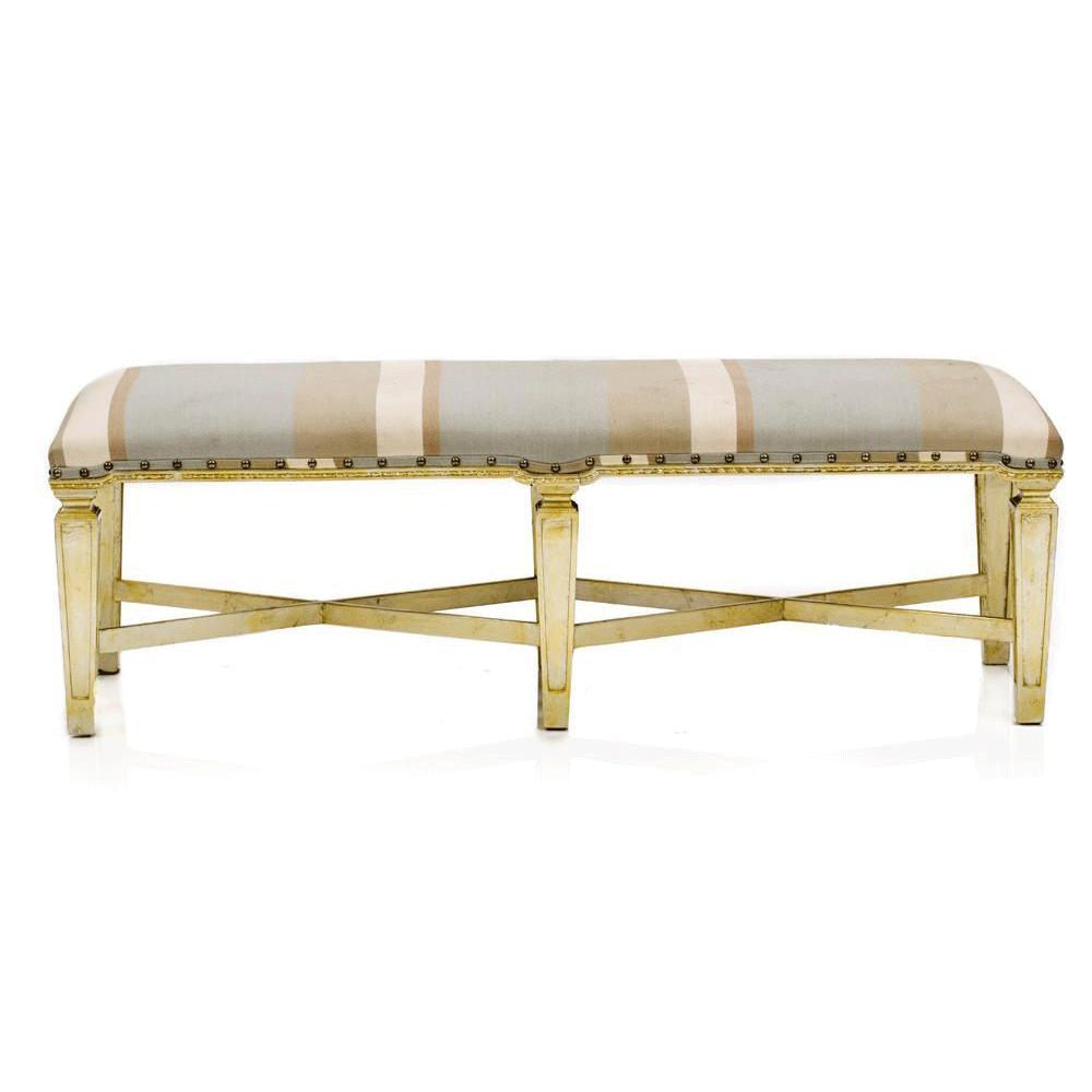 Details: Bench with gold painted wood legs and a grey striped cushion Dimensions: 30.5" H x 14.5" W x 15.5" D Quantity: 1