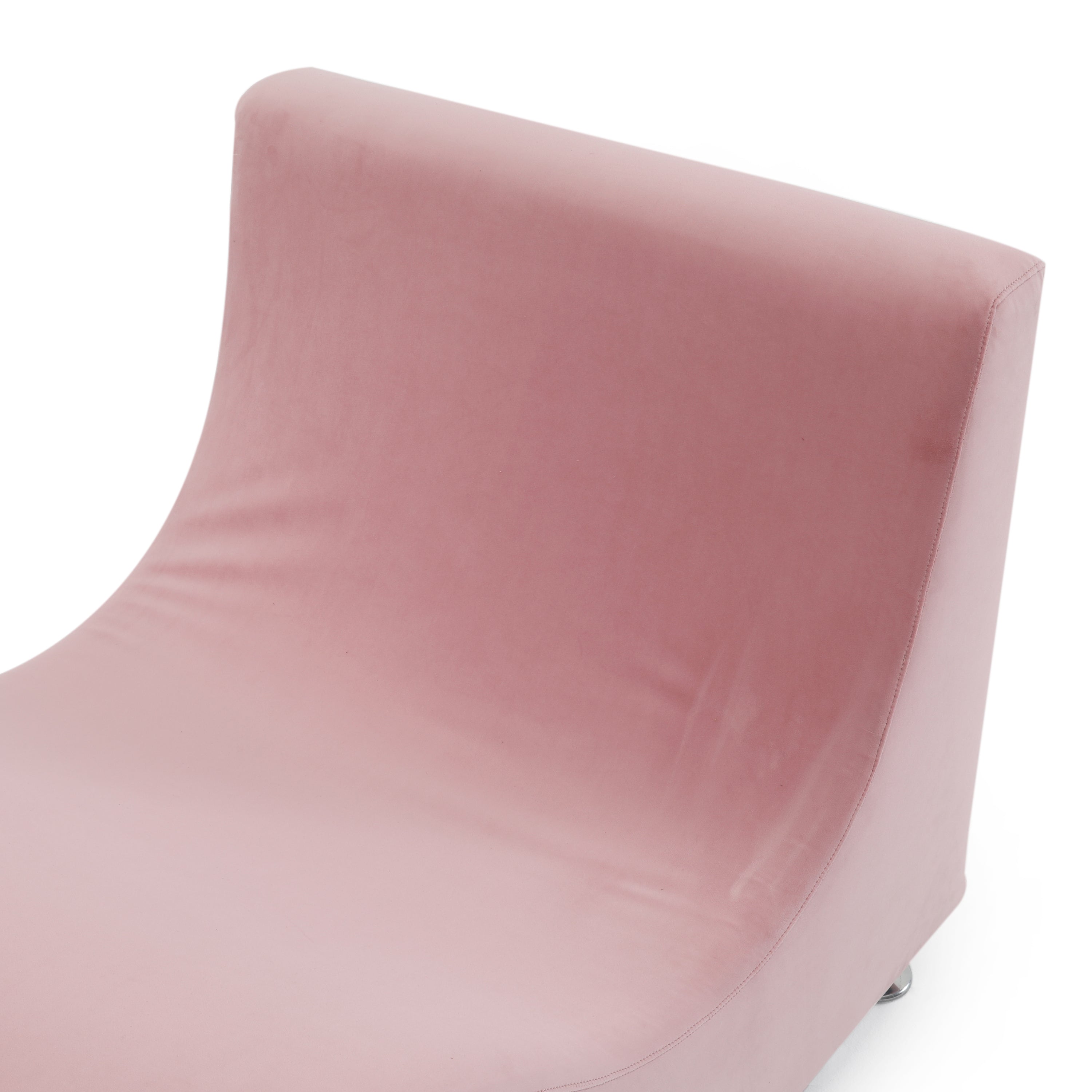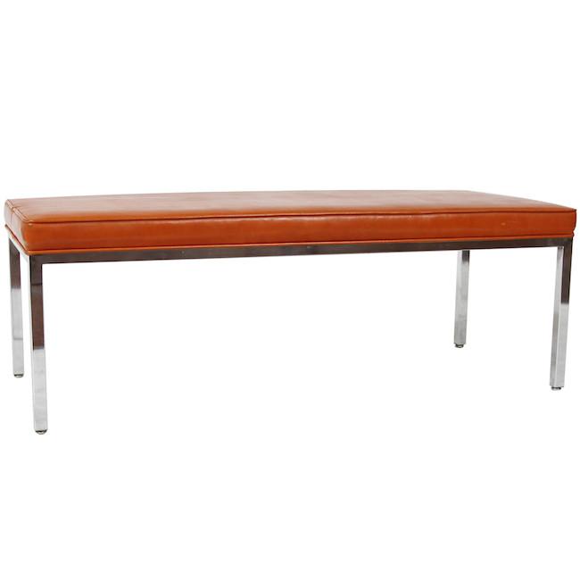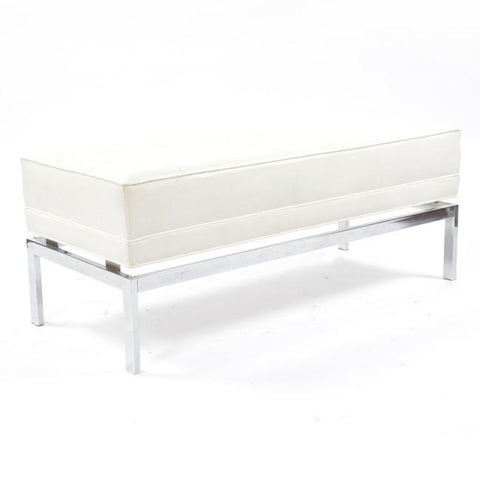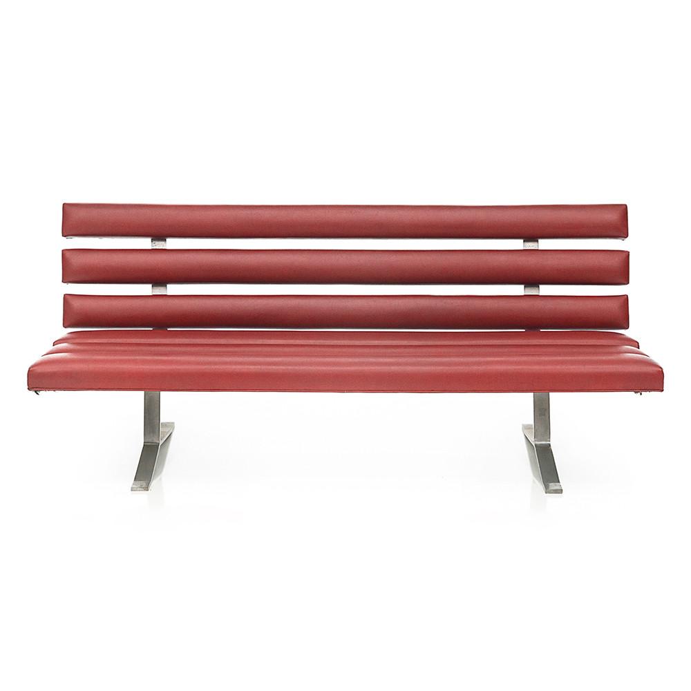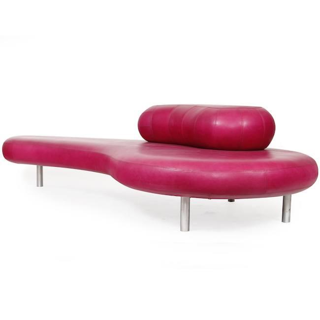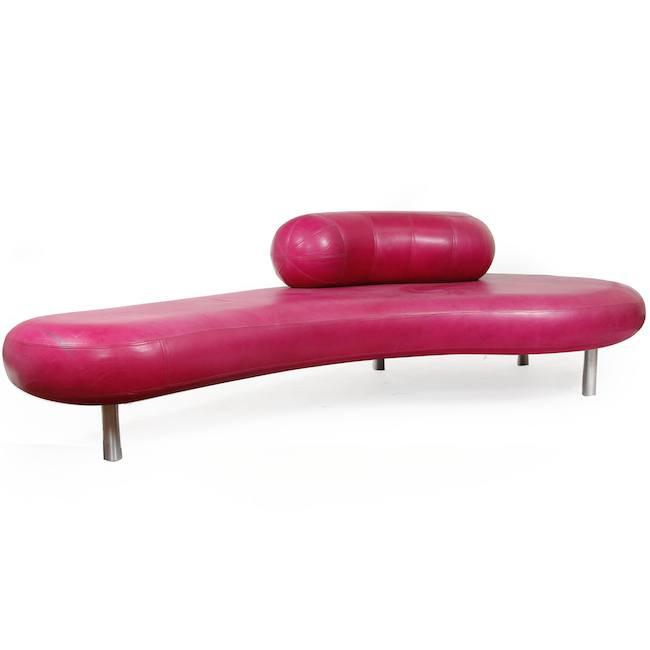 Details: Oblong fuschia leather "pearl" sofa with small backrest, and chrome legs LEATHER IS HEAVILY WORN AND DISCOLORED - PLEASE VIEW IN PERSON PRIOR TO...