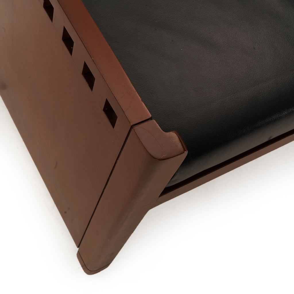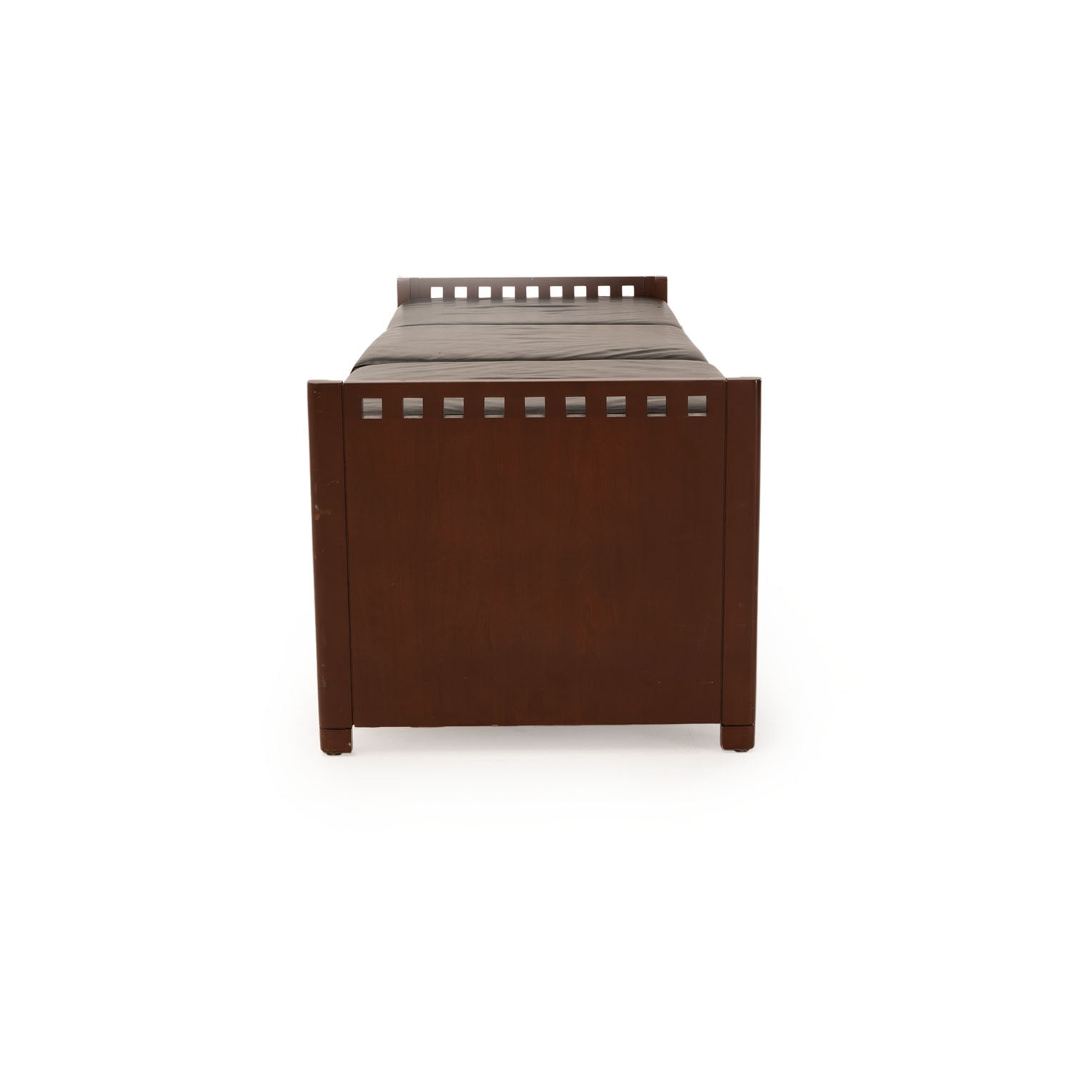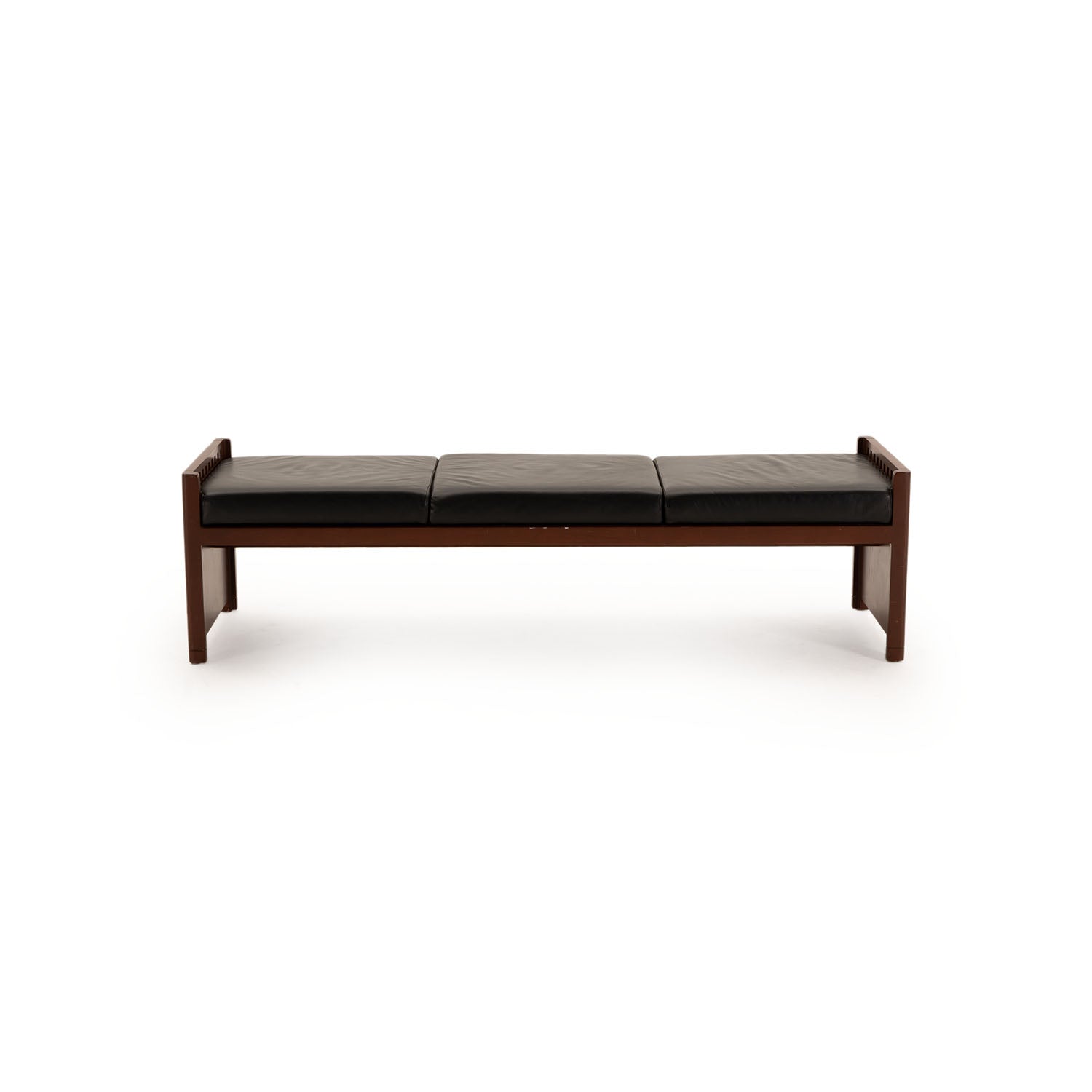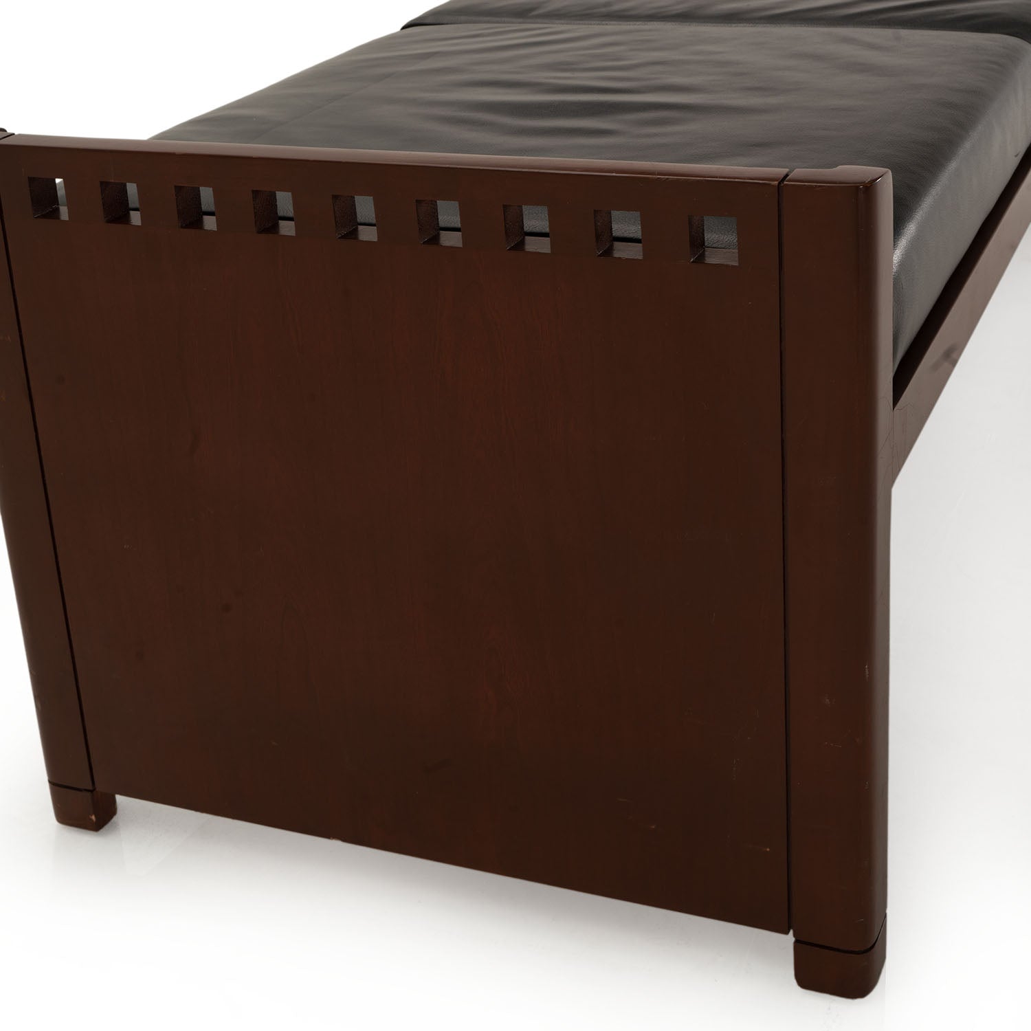 Details: Mahogany platform bench with three black leather cushions and square perforation pattern Dimensions: 13" H x 71" L x 22.5" D Quantity: 1