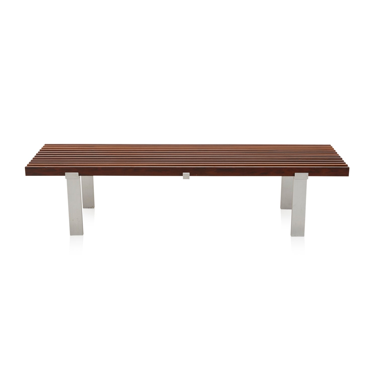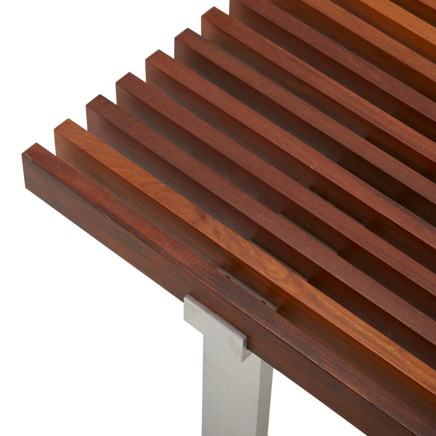 Details: Slatted walnut museum bench with silver metal legs Dimensions: 14" H x 17.75" W x 60" D