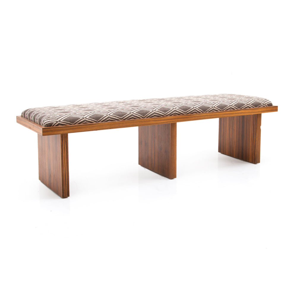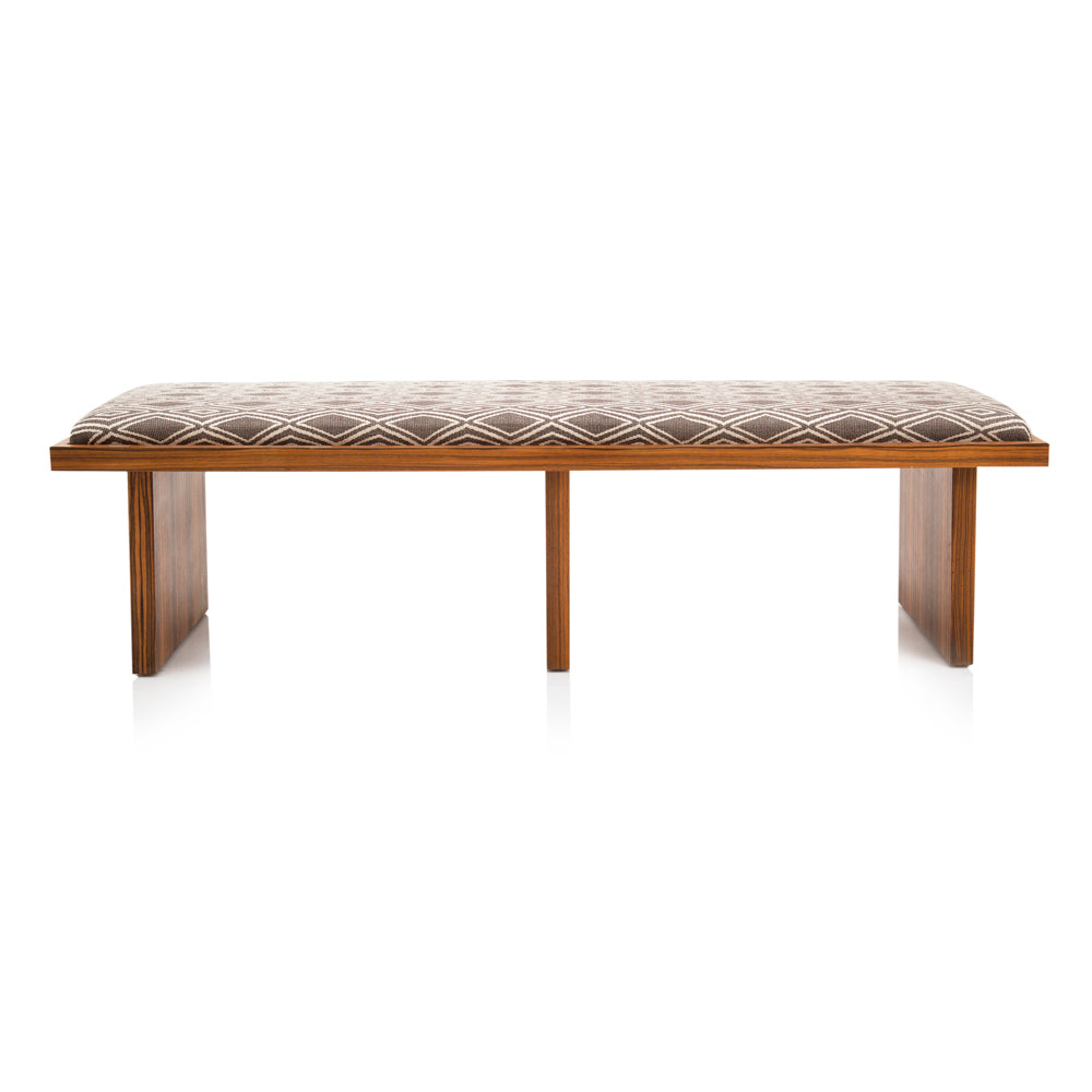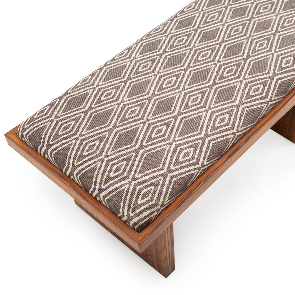 Details: Wood bench with padded top cushion, grey white diamond patterns Dimensions: 18" H x 59" W x 18" D Quantity: 1
