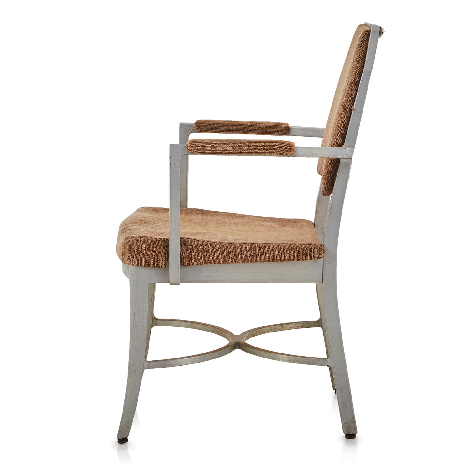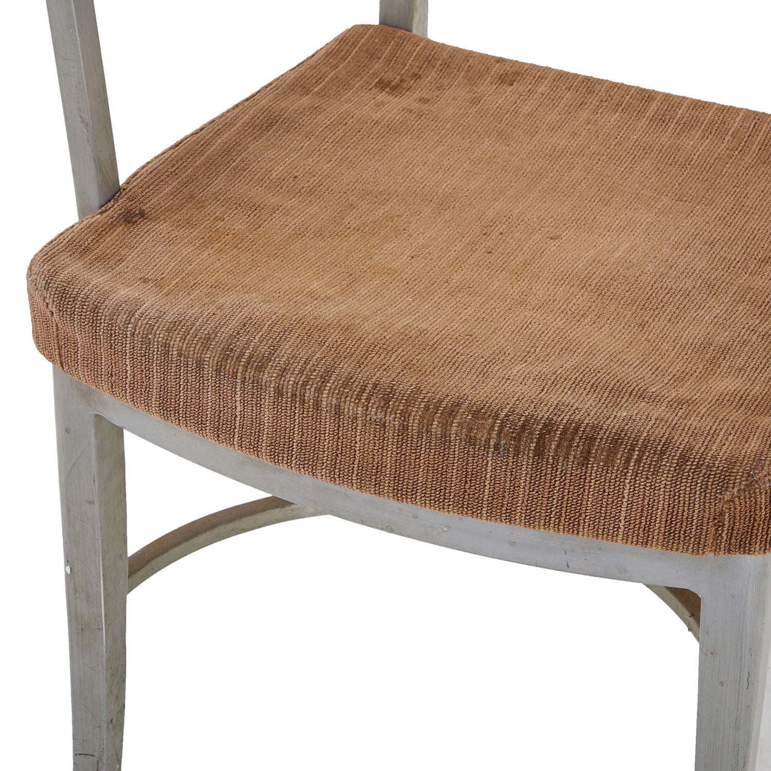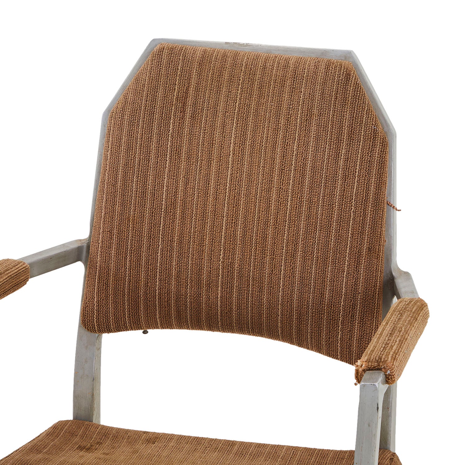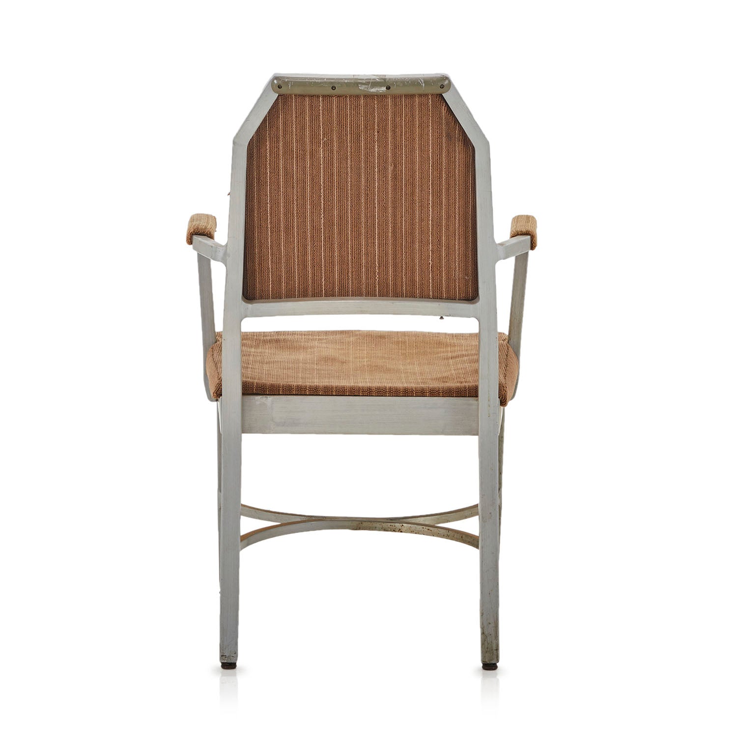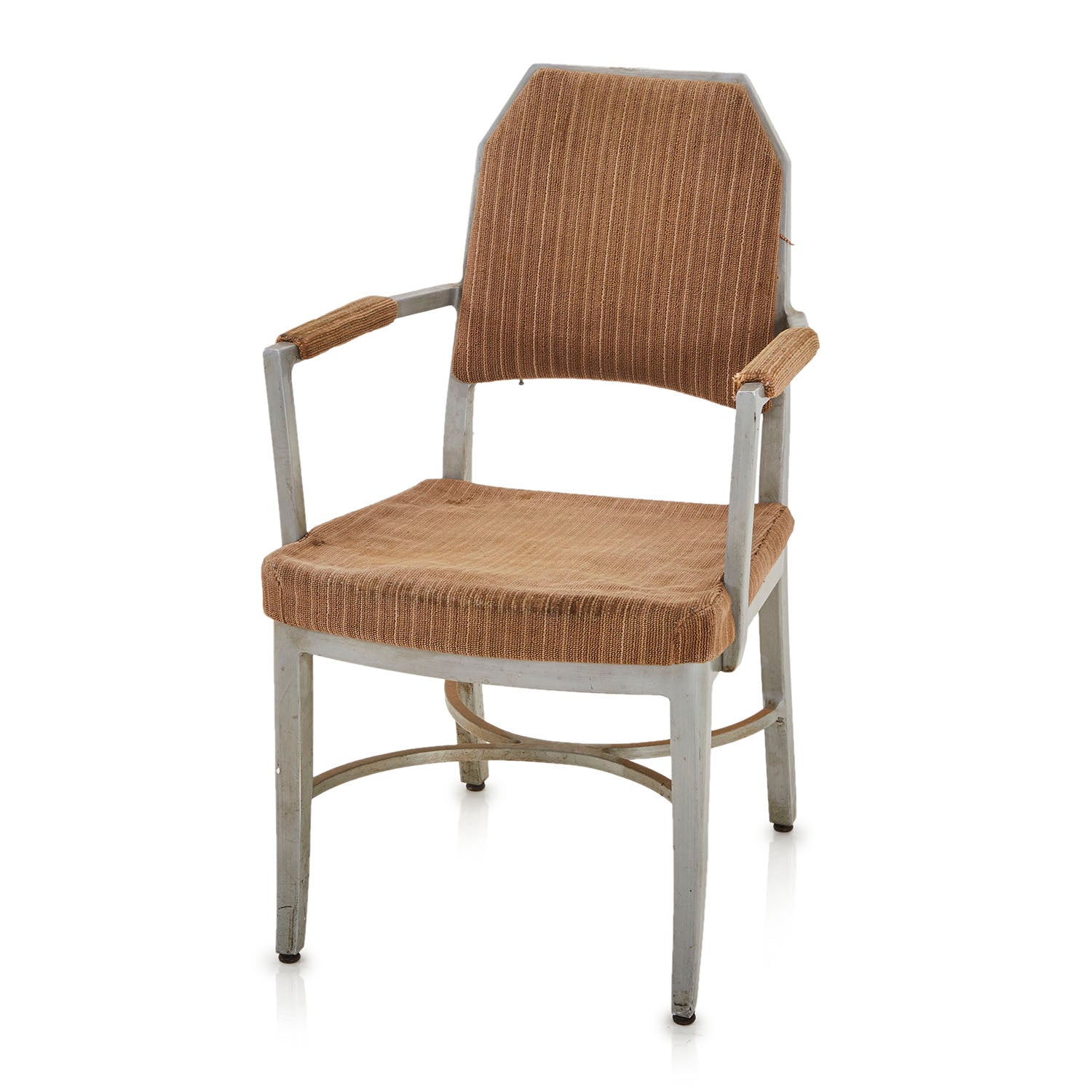 Details: Heavily distressed brown velvet armchair with riveted border, wooden base, exposed thatch-work, insulation, springs and ripped leather Dimensions: 31" H x 32" W x 31"...