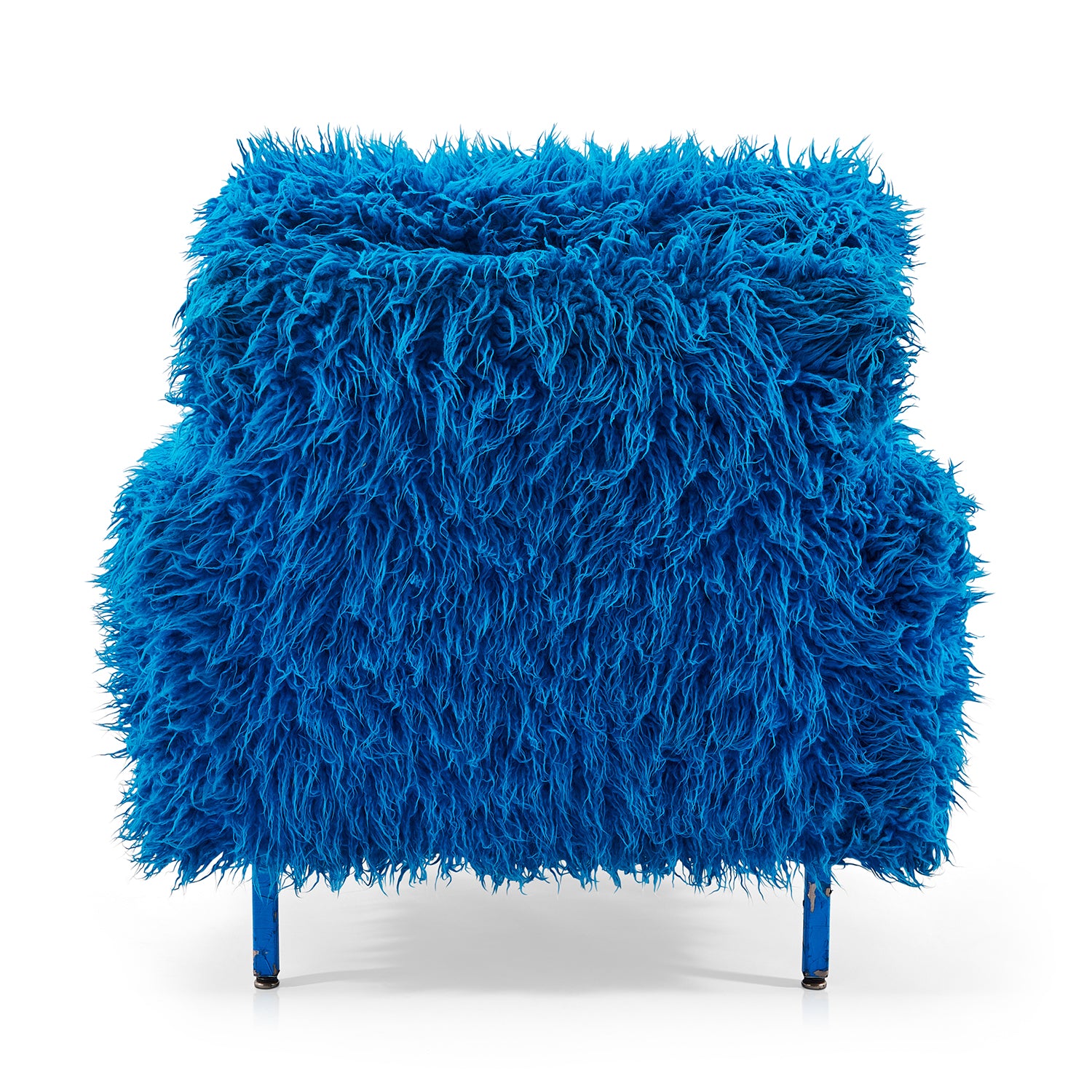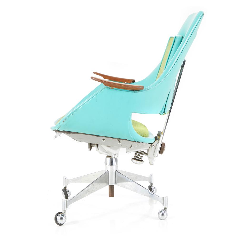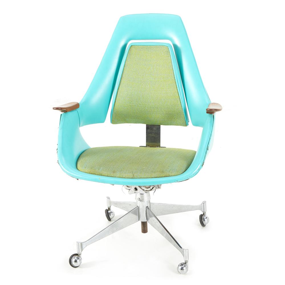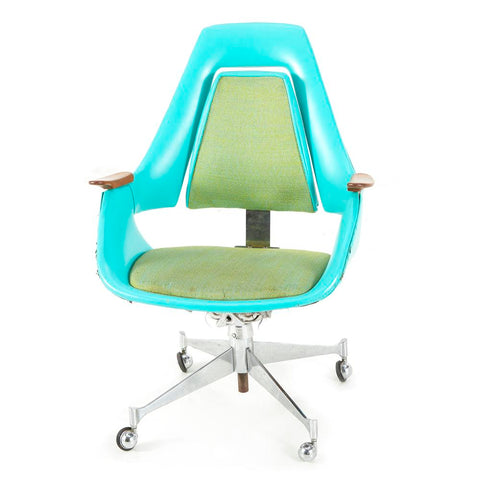 Details: Futuristic blue and green office chair with green cushion and backrest, bright teal frame, mahogany armrests, and chrome base with four wheels Dimensions: 34.5" H...