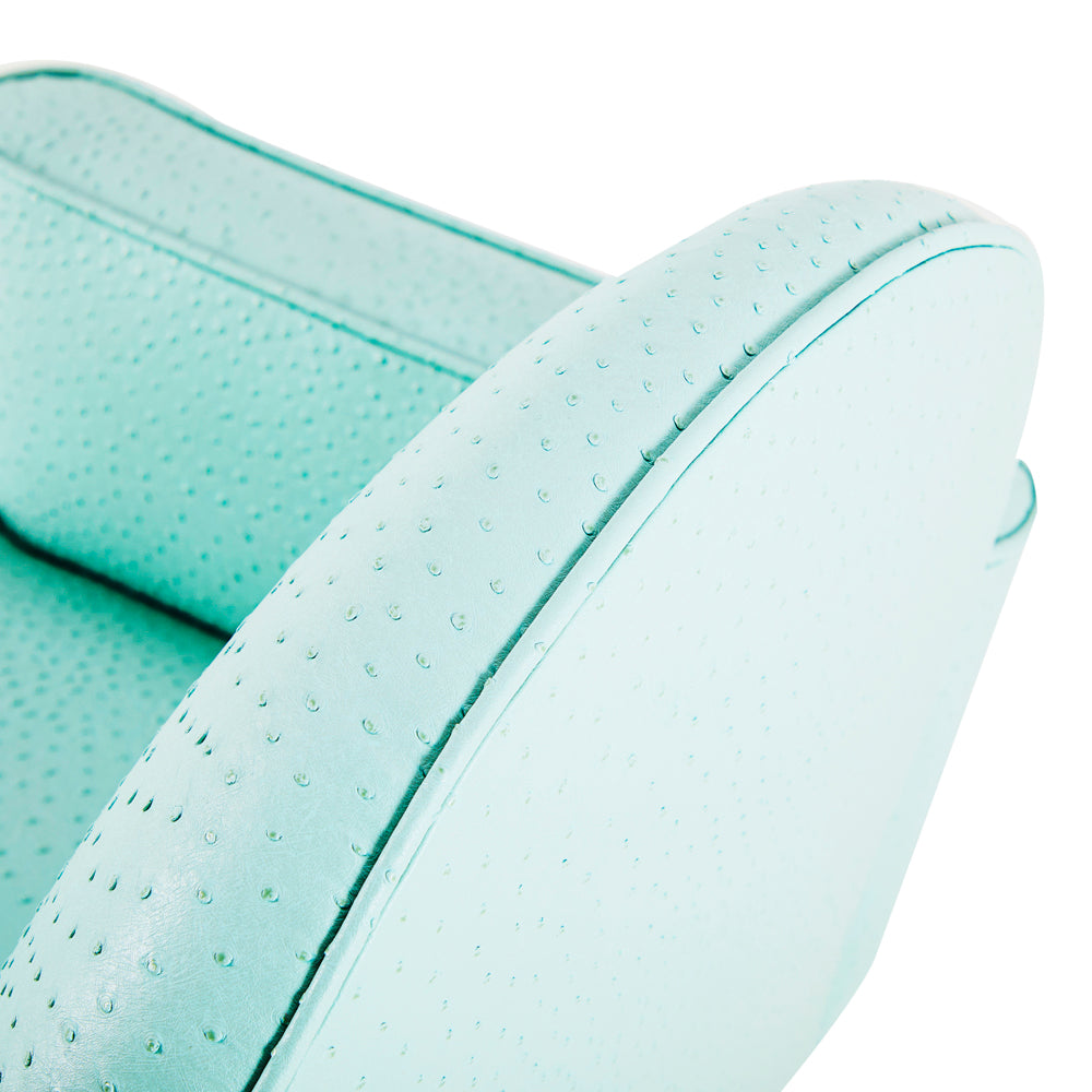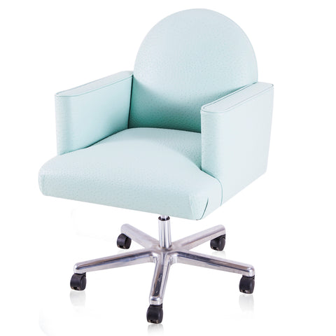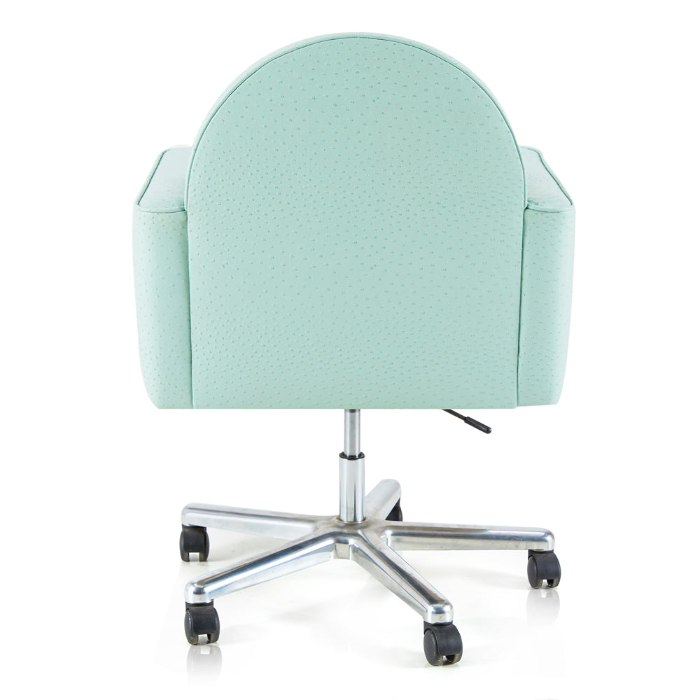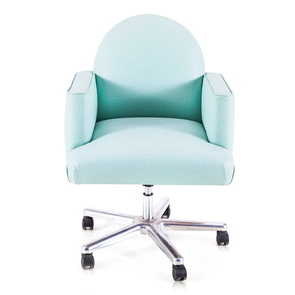 Details: Light blue green faux-ostrich fabric rolling office chair with round back and silver rolling base