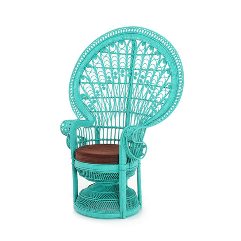 Details: Round wicker chair with shell shaped seat, tapered wooden legs, and a turquoise seat cushion Dimensions: 33" H x 23" W x 21" D