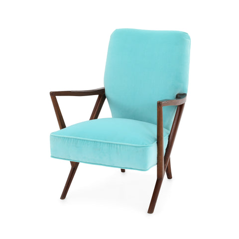 Details: Wood mid century chair with blue / aqua velvet seating. Dimensions: 34" H x 27" W x 27" D