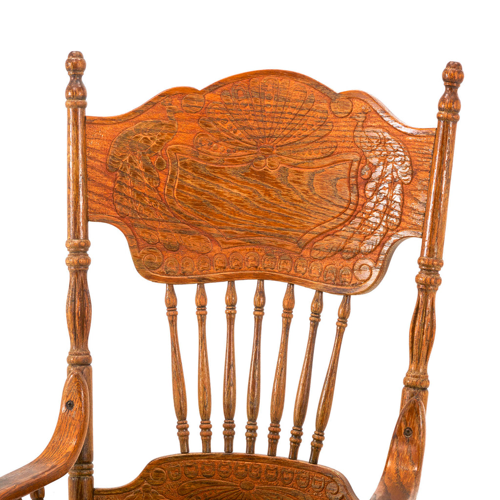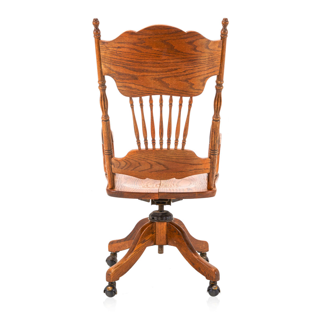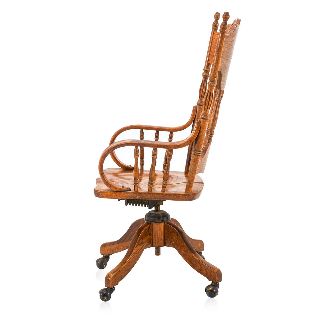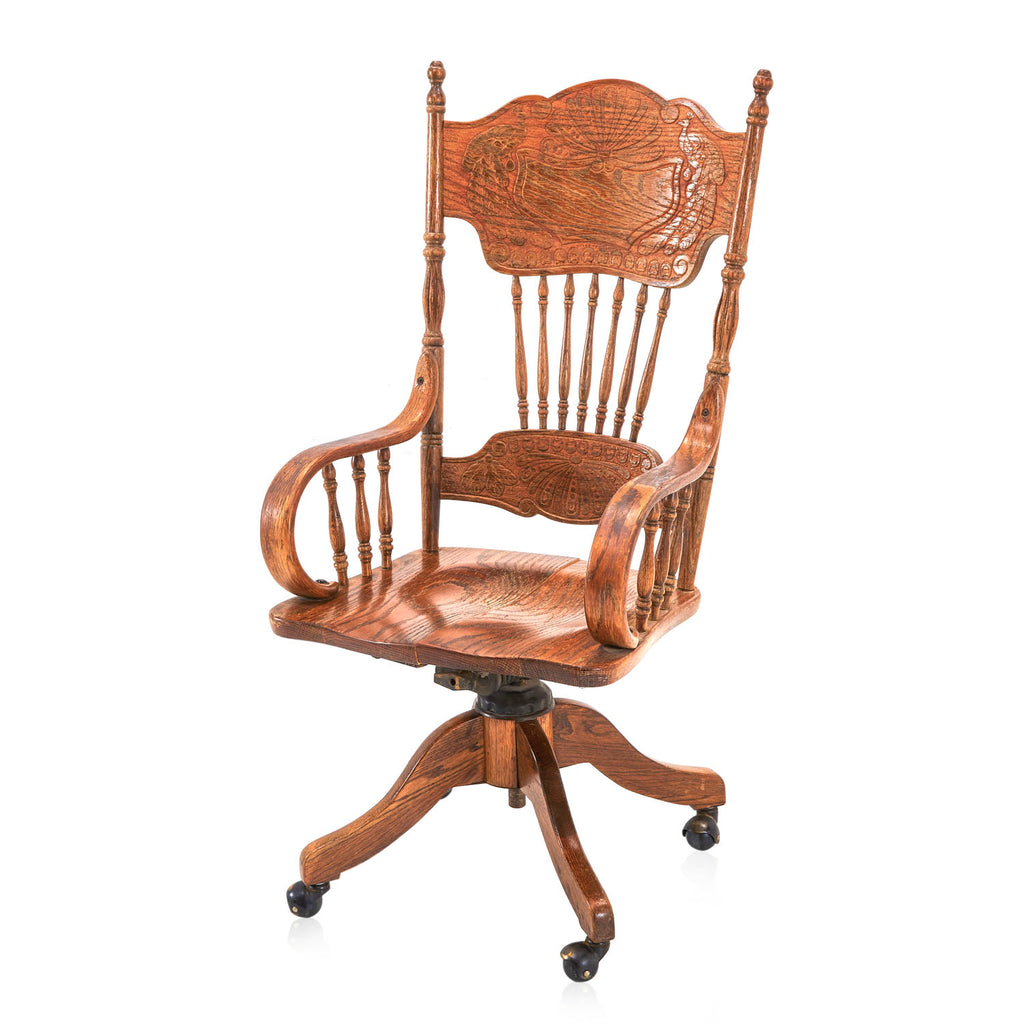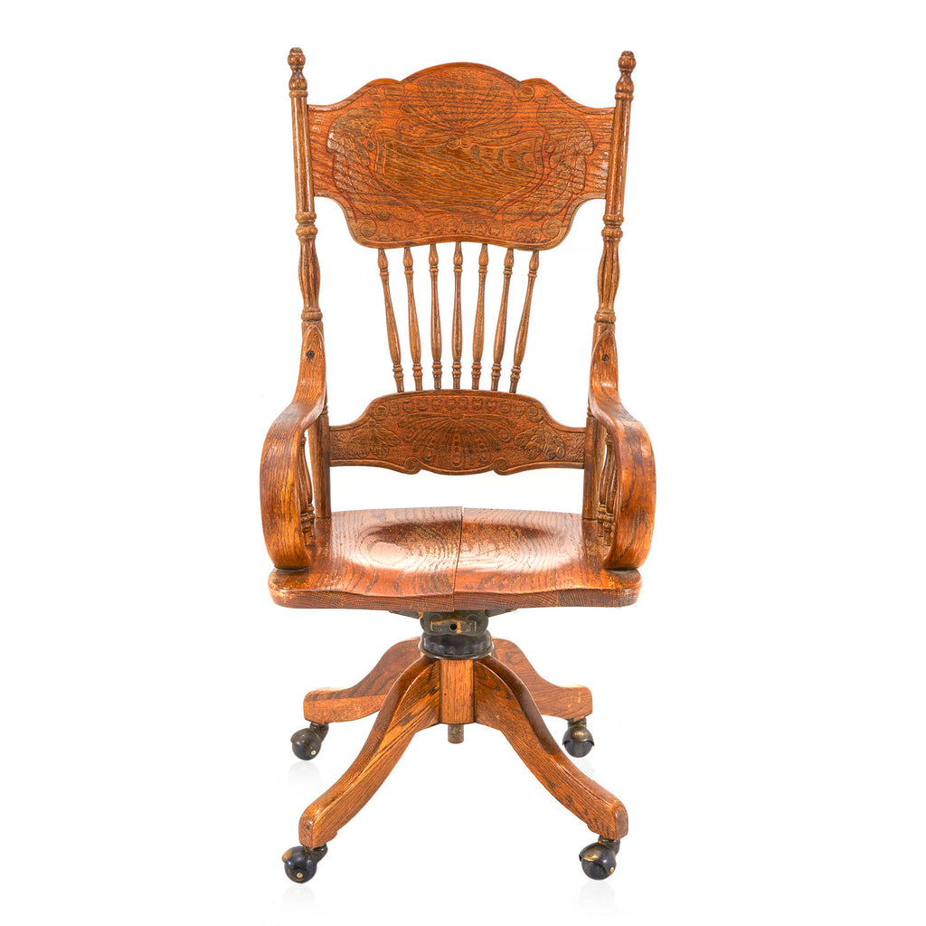 Details: Antique carved wood office chair with high back and rolling swivel base Dimensions: 45" H x 21" W x 19" D