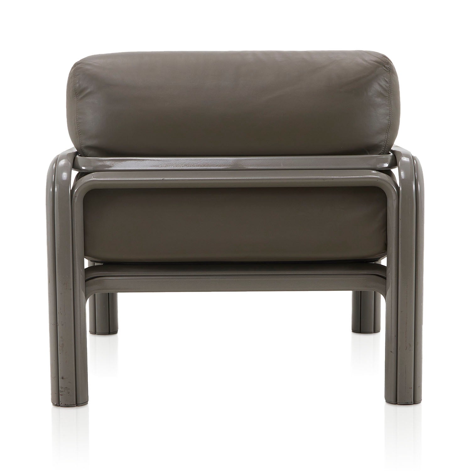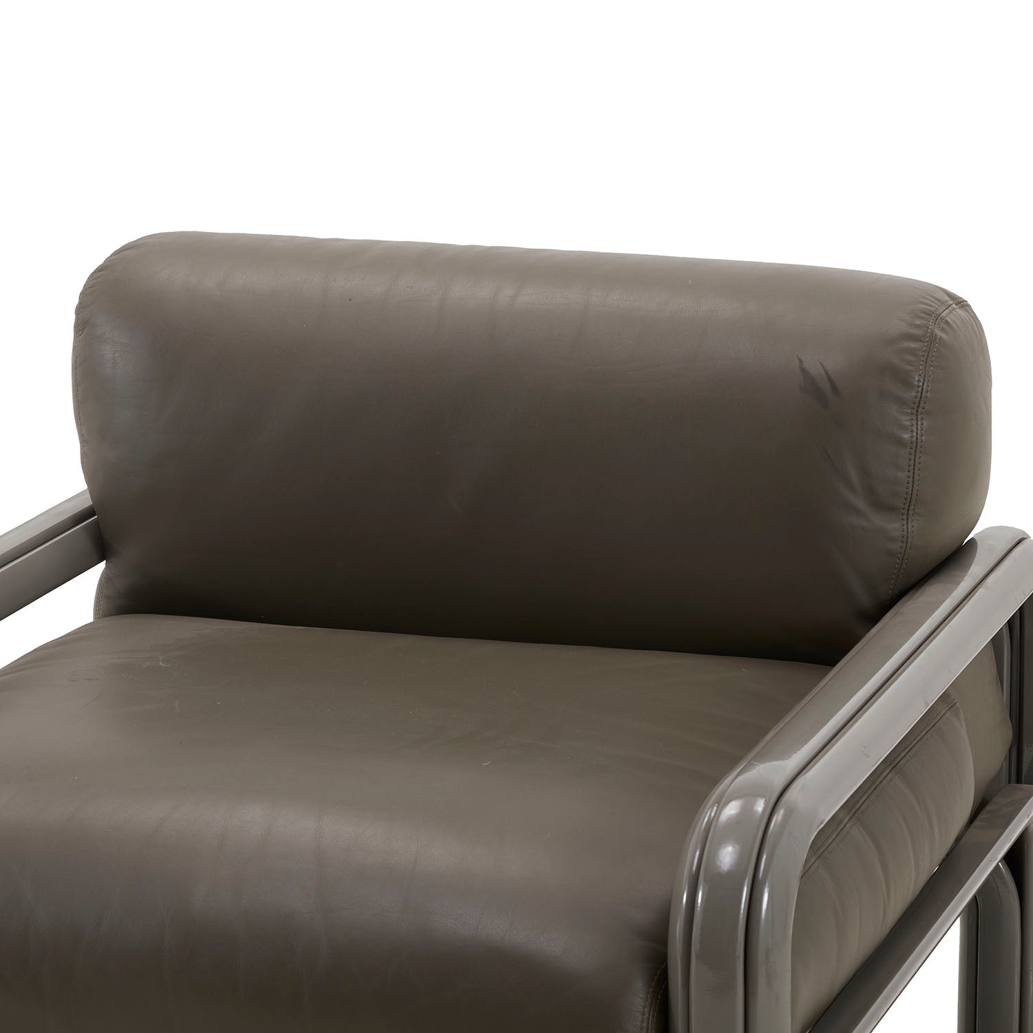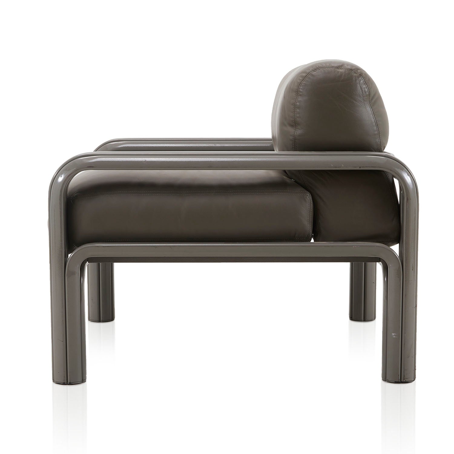 Materials: Grey leather cushion lounge chair with heavy tubular grey metal frame
