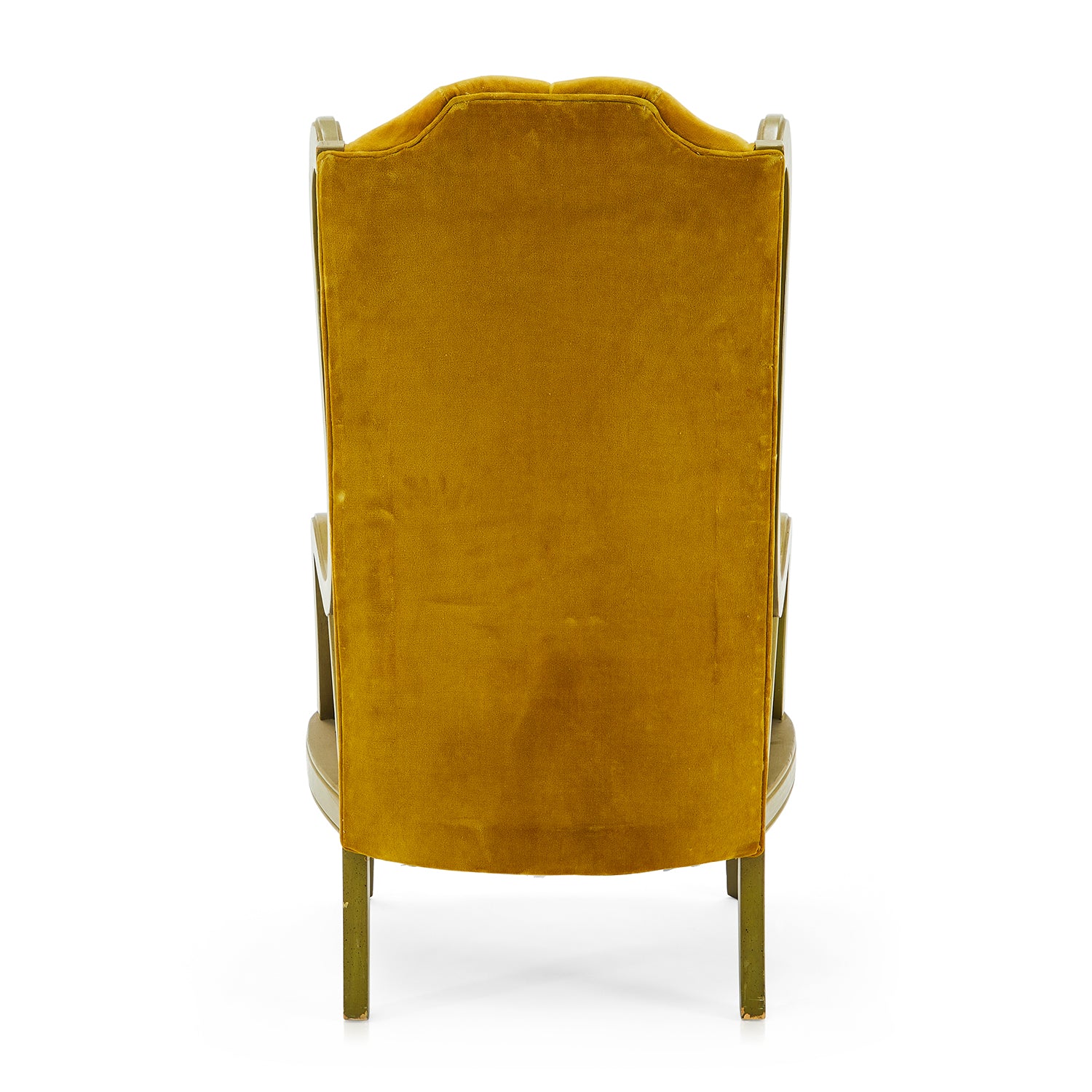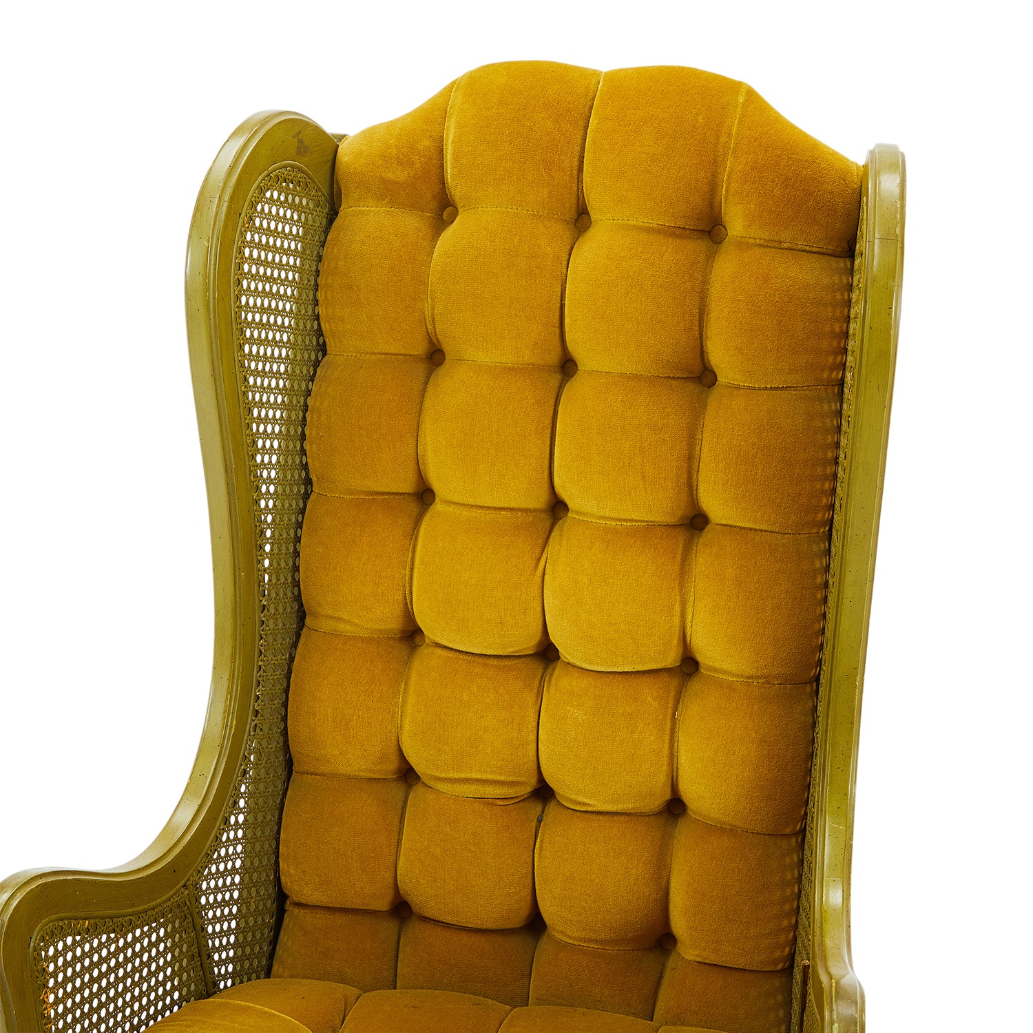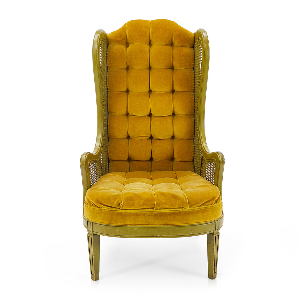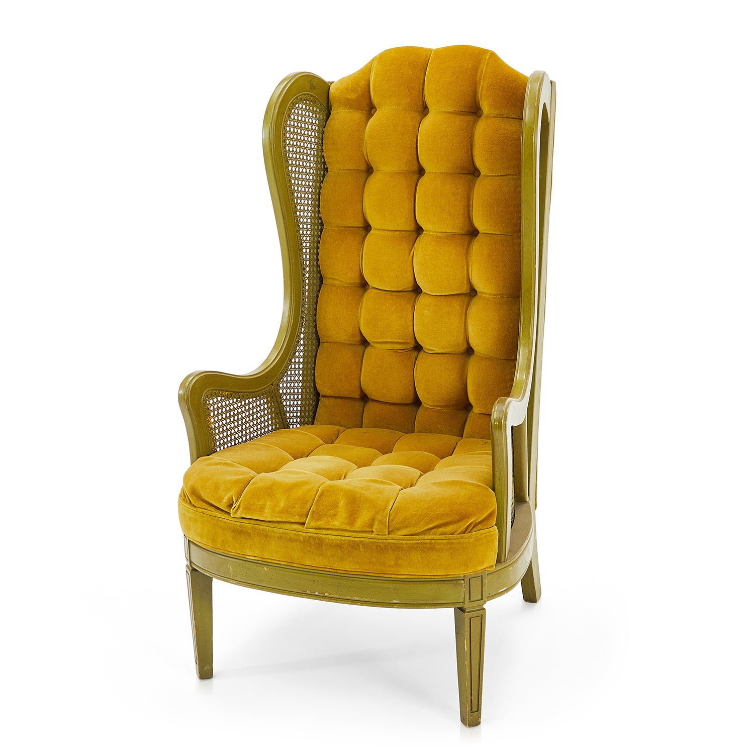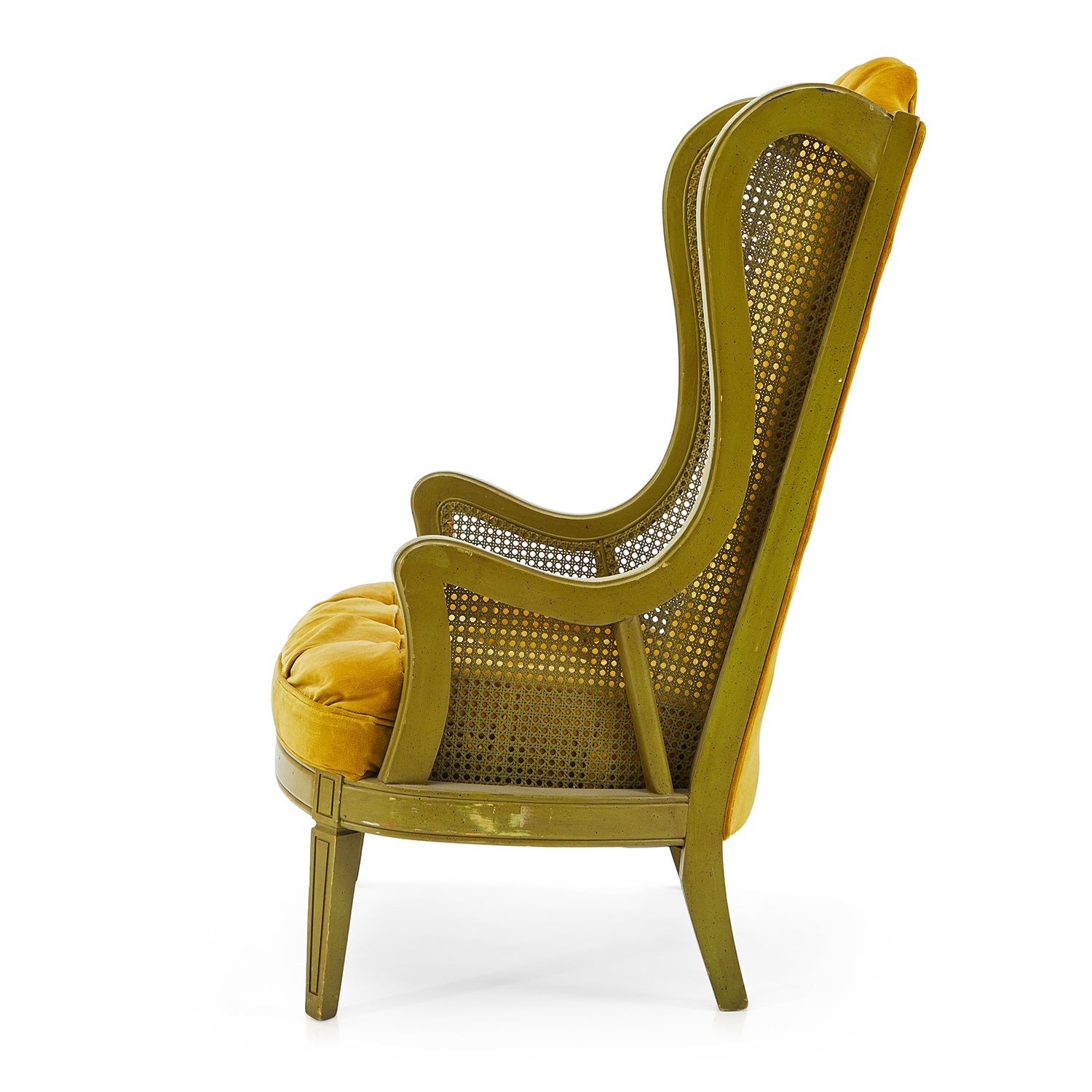 Details: High back lounge chair with a green wooden frame, wicker panels, and yellow tufted velvet seat and back cushions