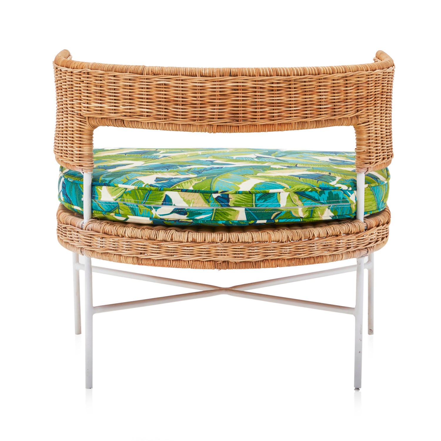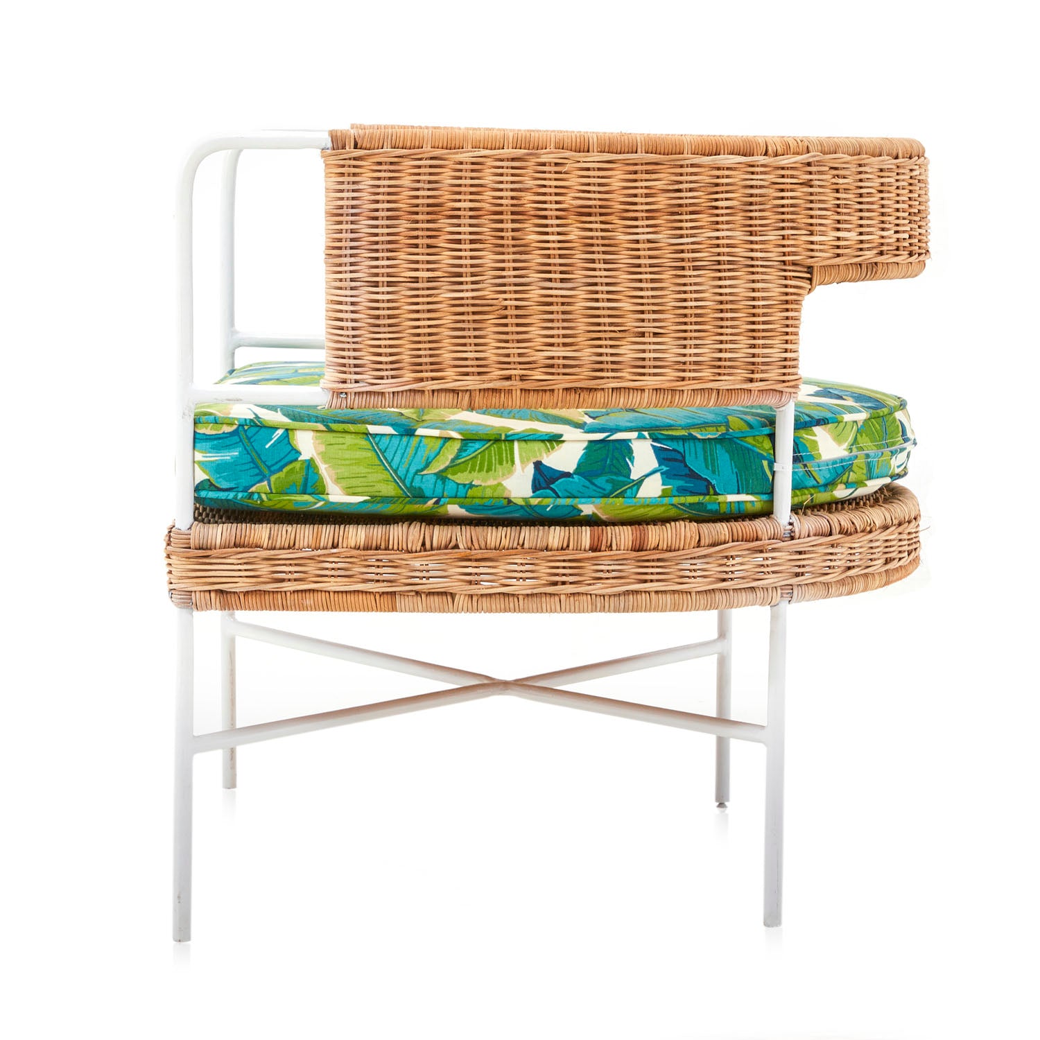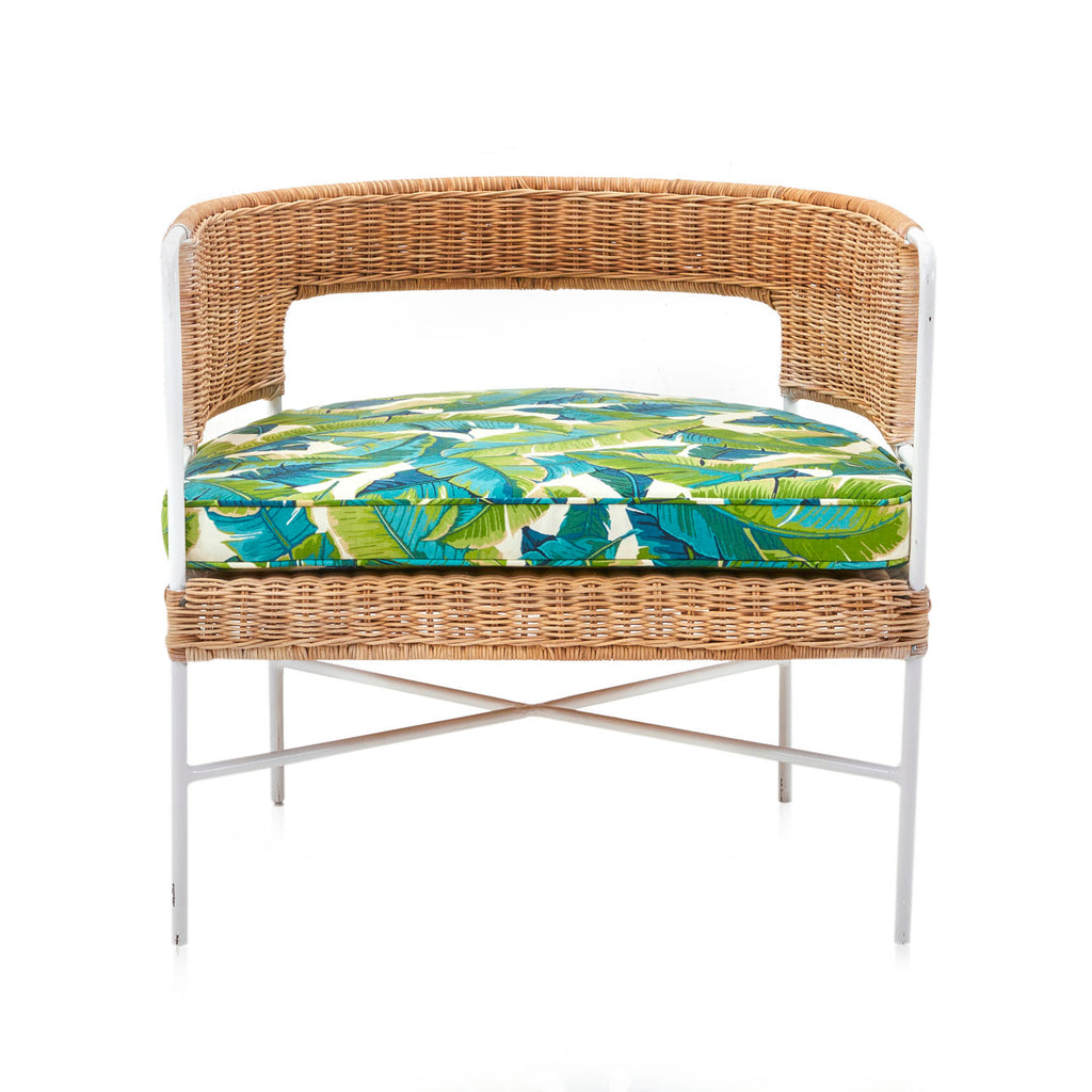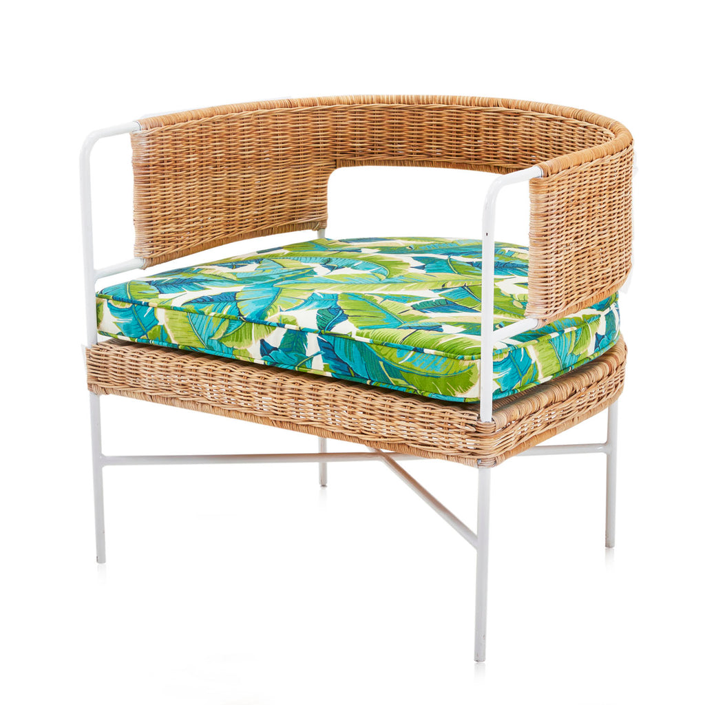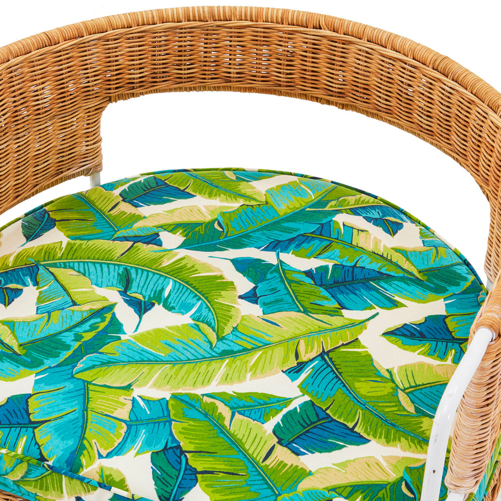 Details: Contemporary styled arm chair with round wicker design and tropical banana leaf cushion