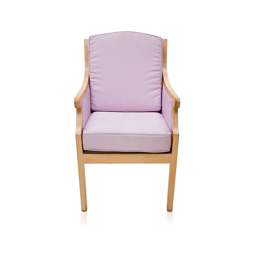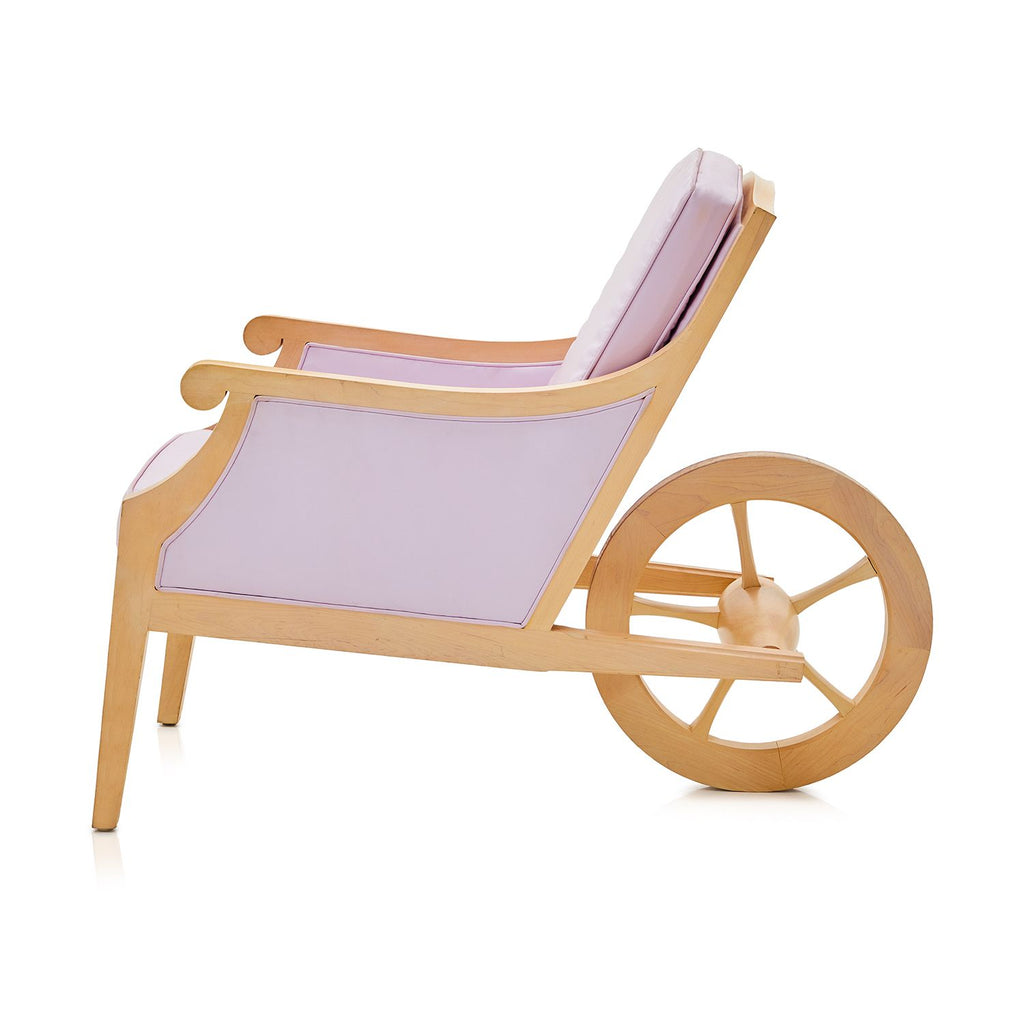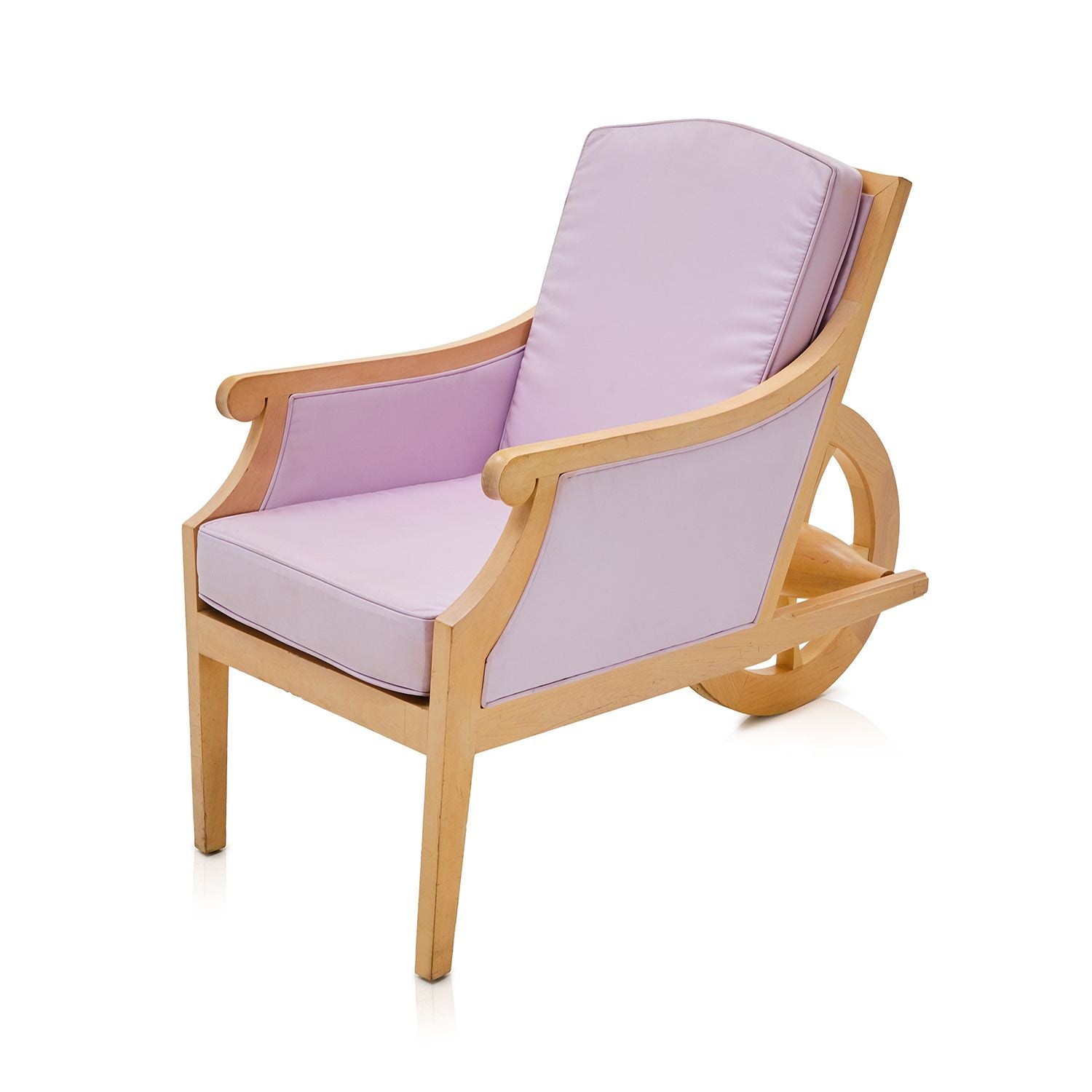 Details: Unique armchair with lilac purple upholstery, a wooden frame, and a wooden wheel instead of a rear leg Dimensions: 35” H x 23” W...