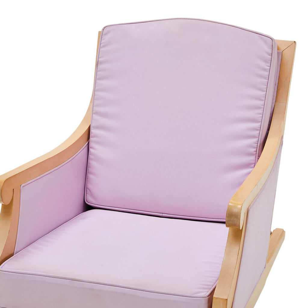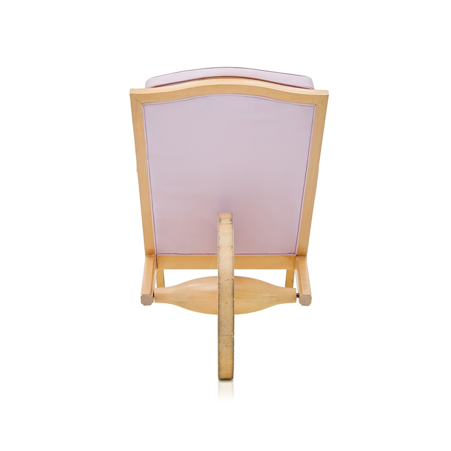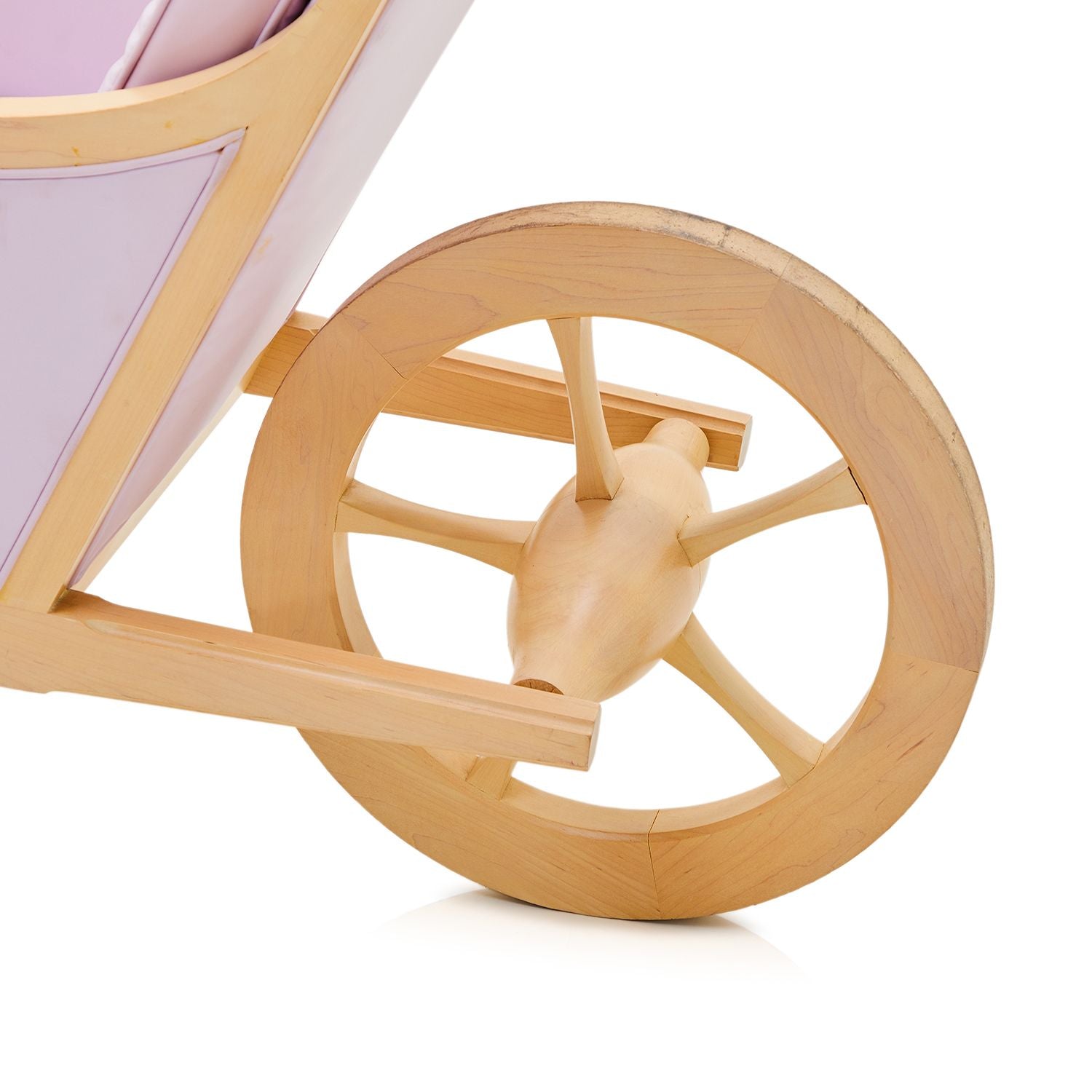 Details: Unique armchair with lilac purple upholstery, a wooden frame, and a wooden wheel instead of a rear leg Dimensions: 35” H x 23” W...