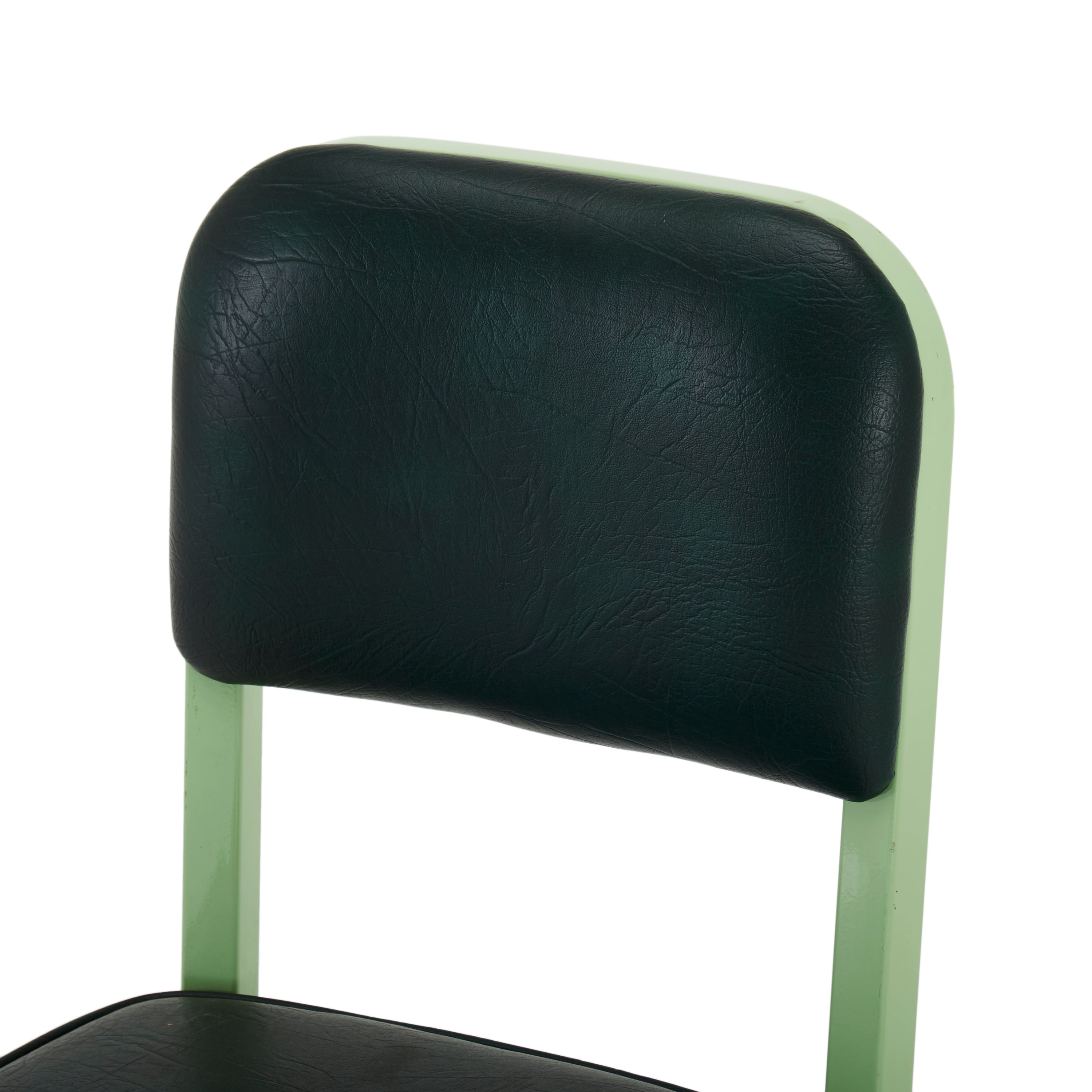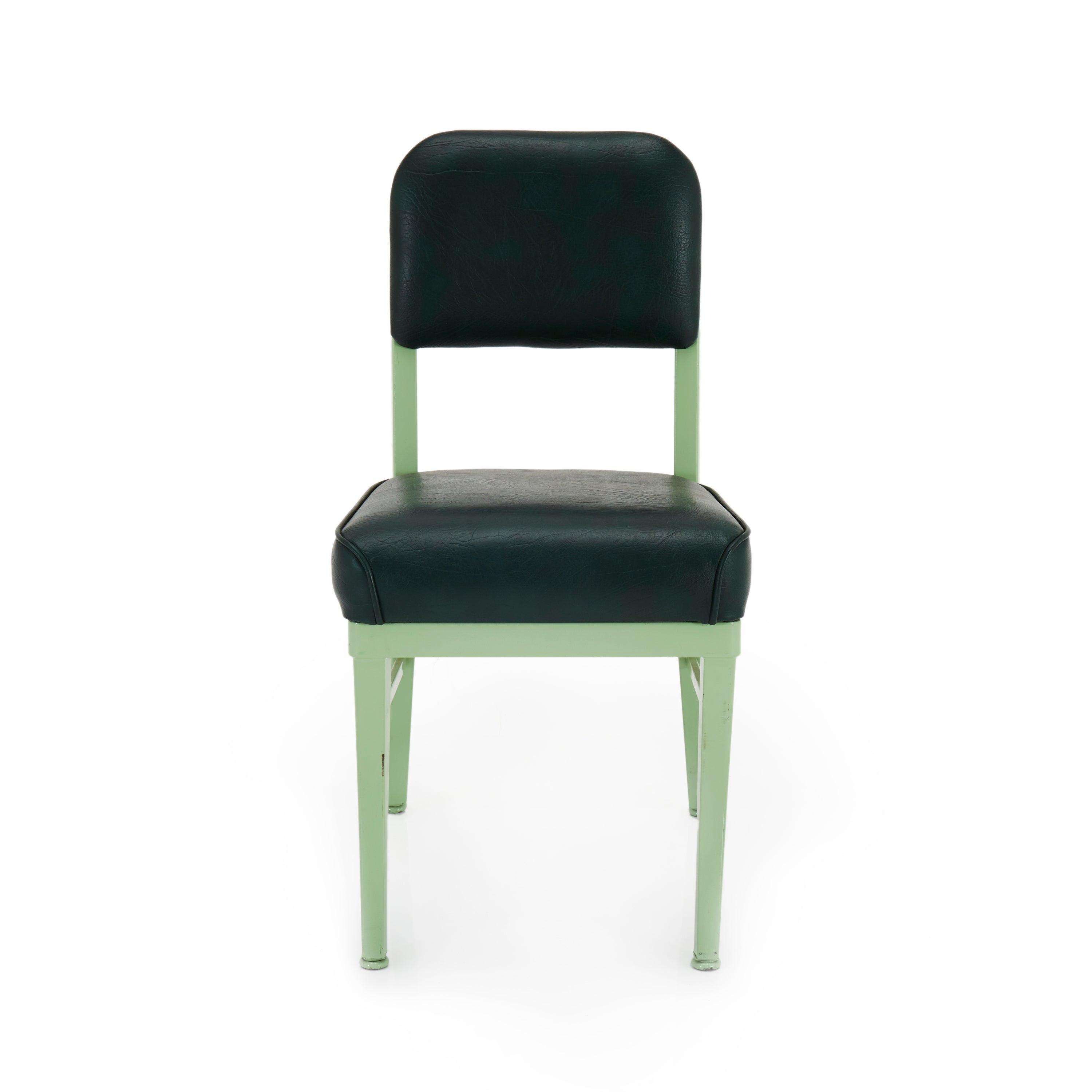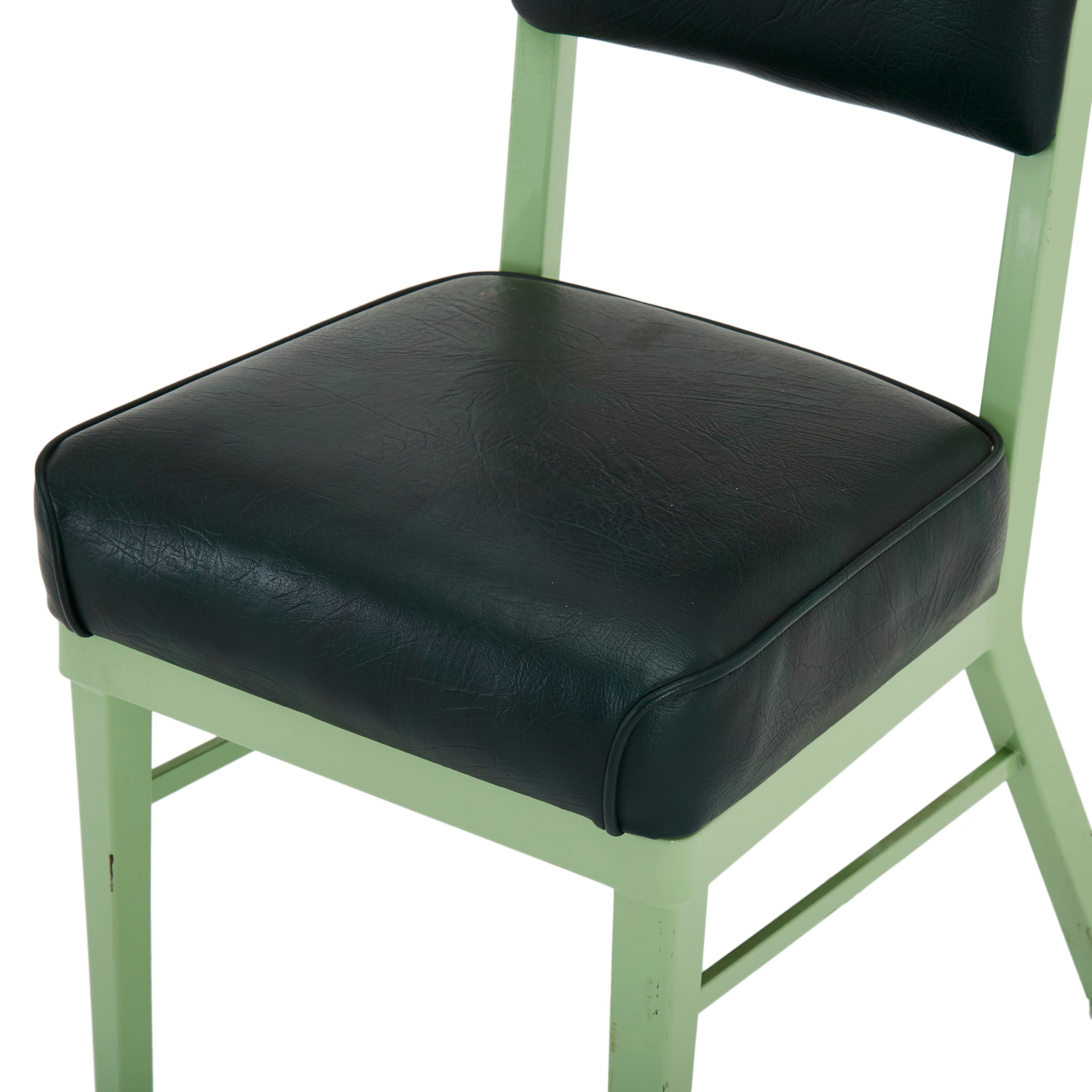 Details: Green metal frame with dark green leather seat cushion and backrest