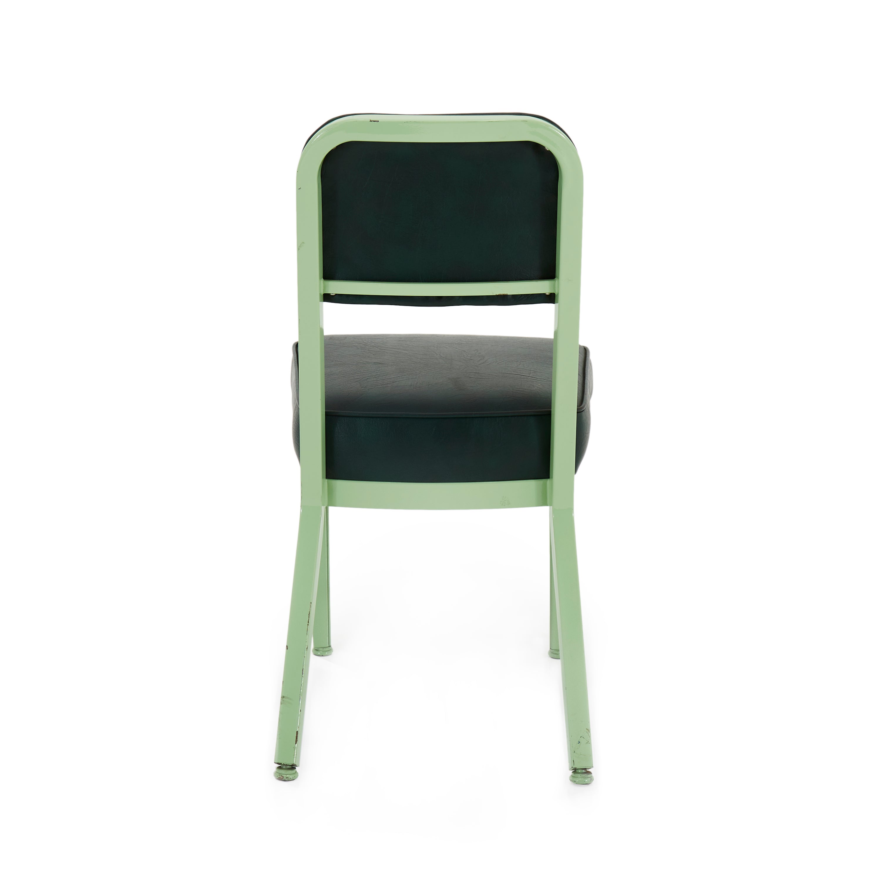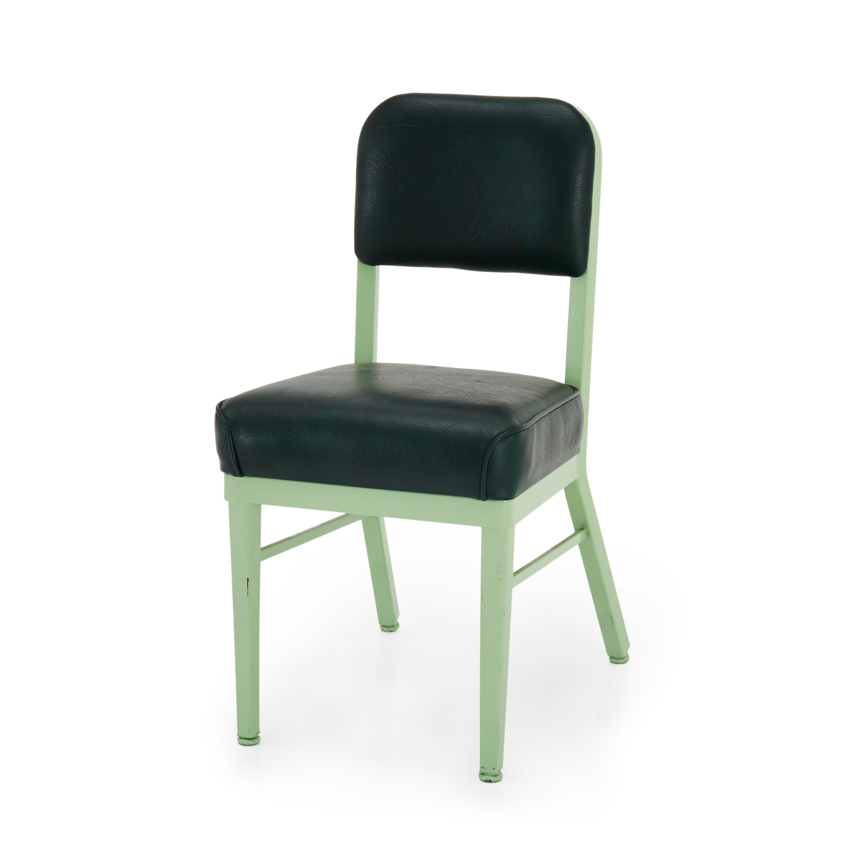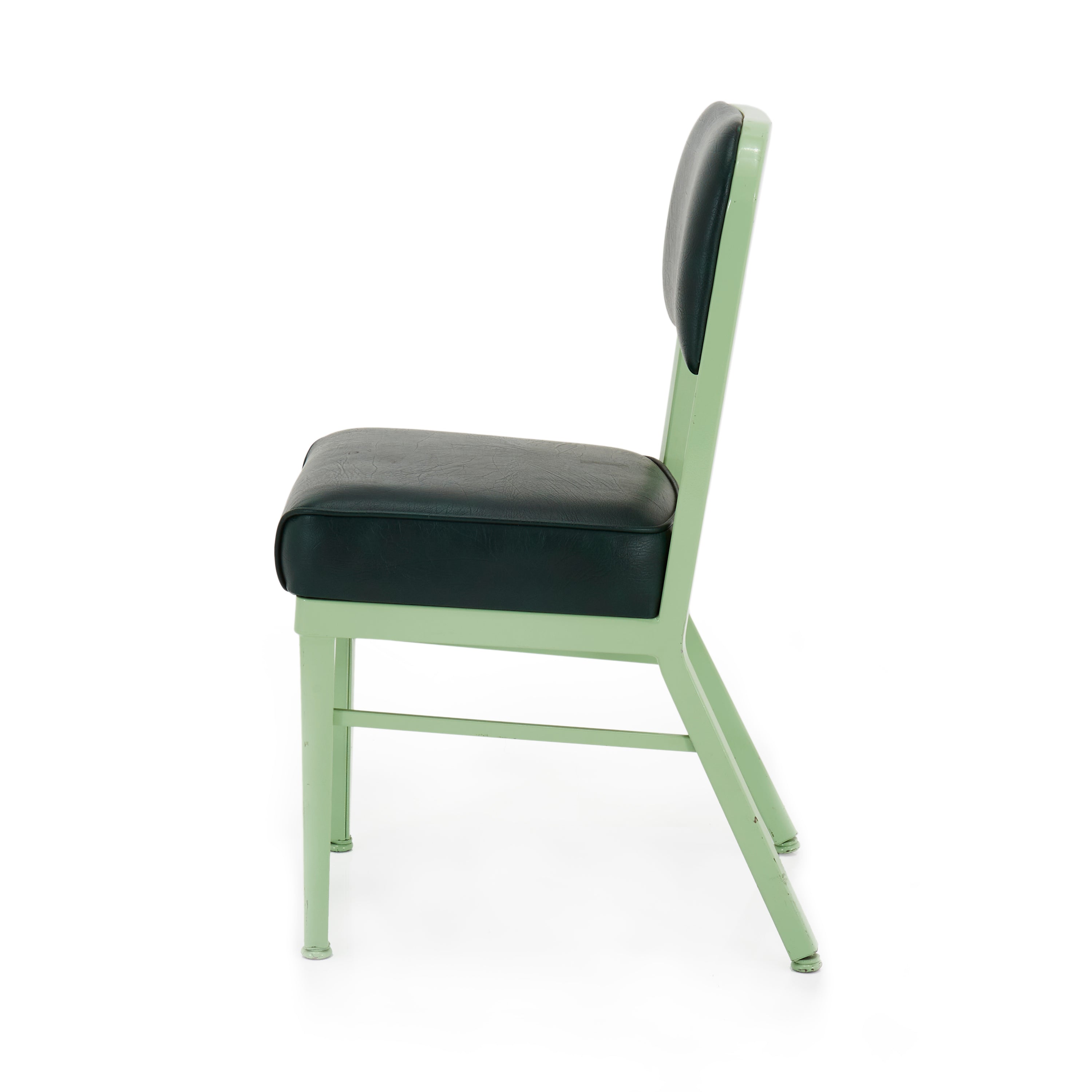 Details: Green metal frame with dark green leather seat cushion and backrest