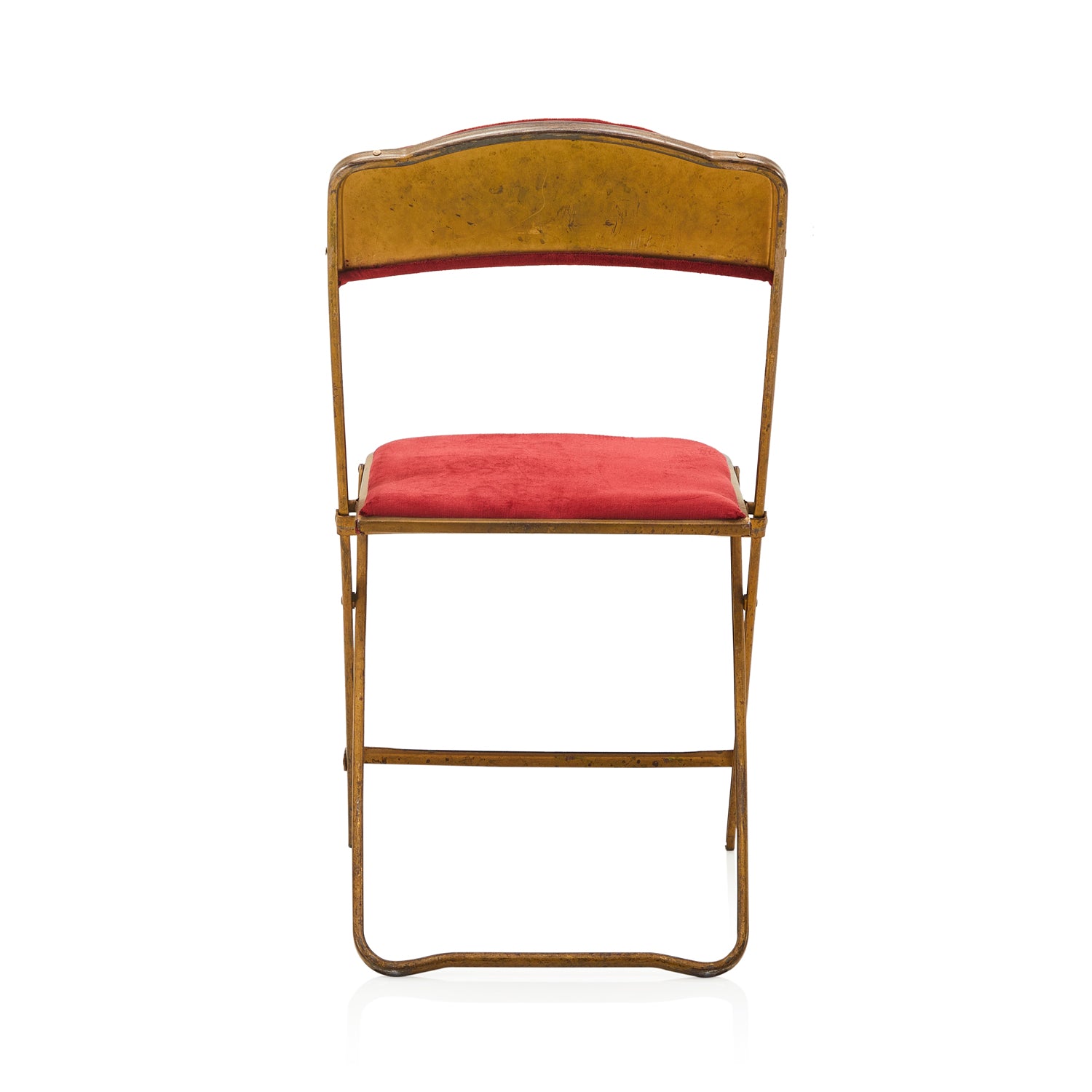 Details: Folding chair with red velvet upholstery and worn brass frame