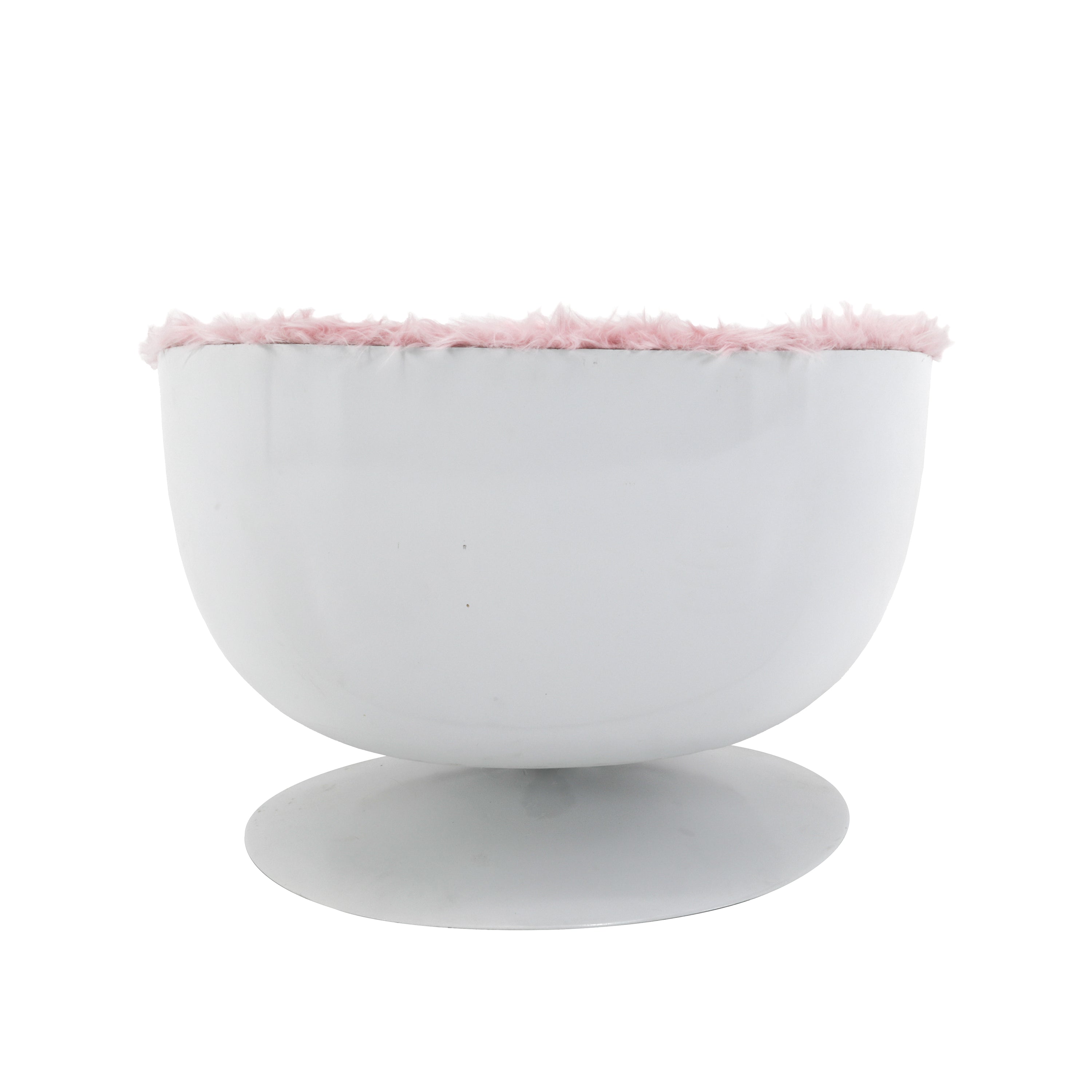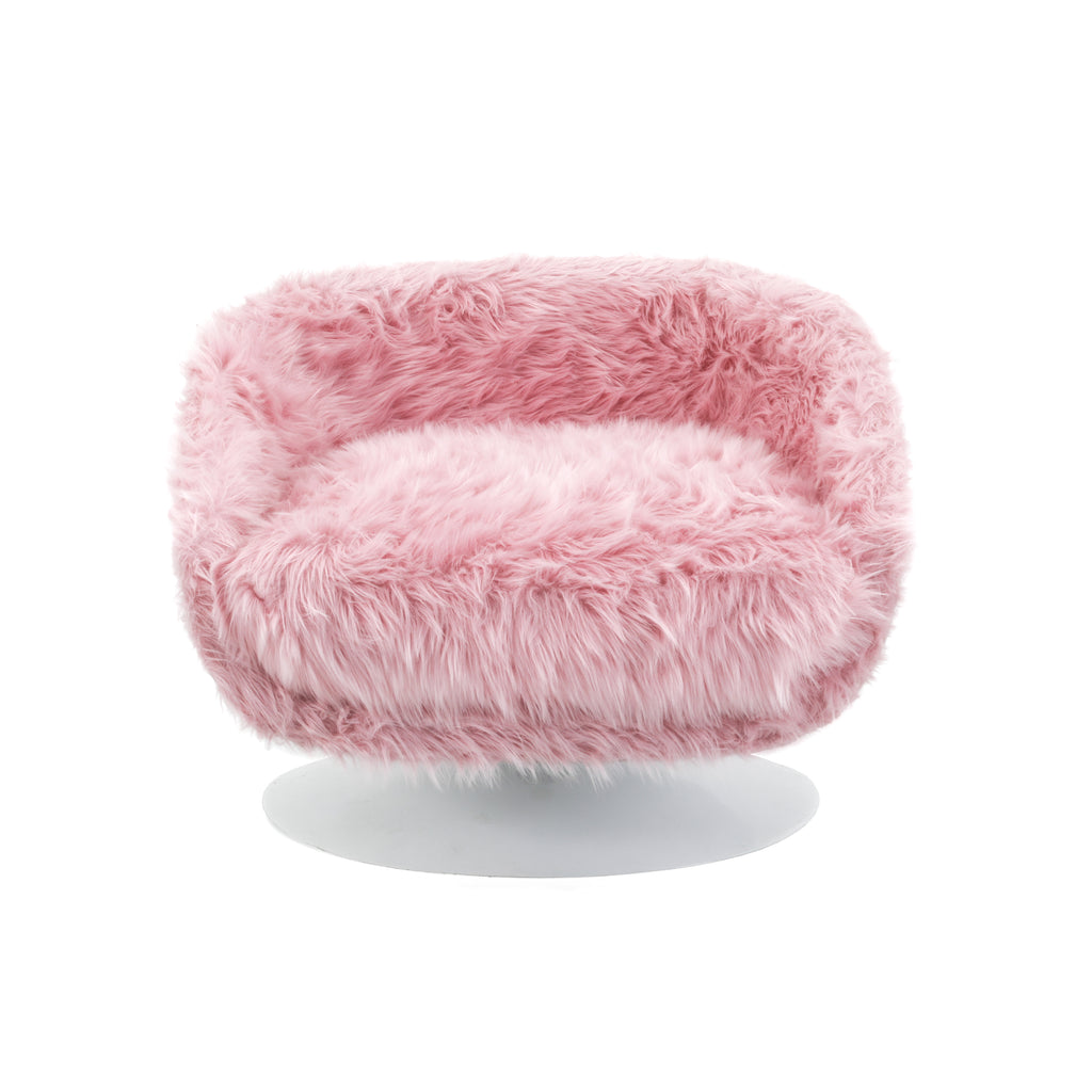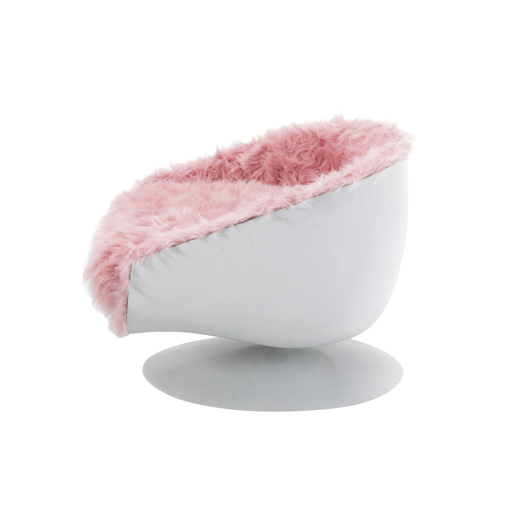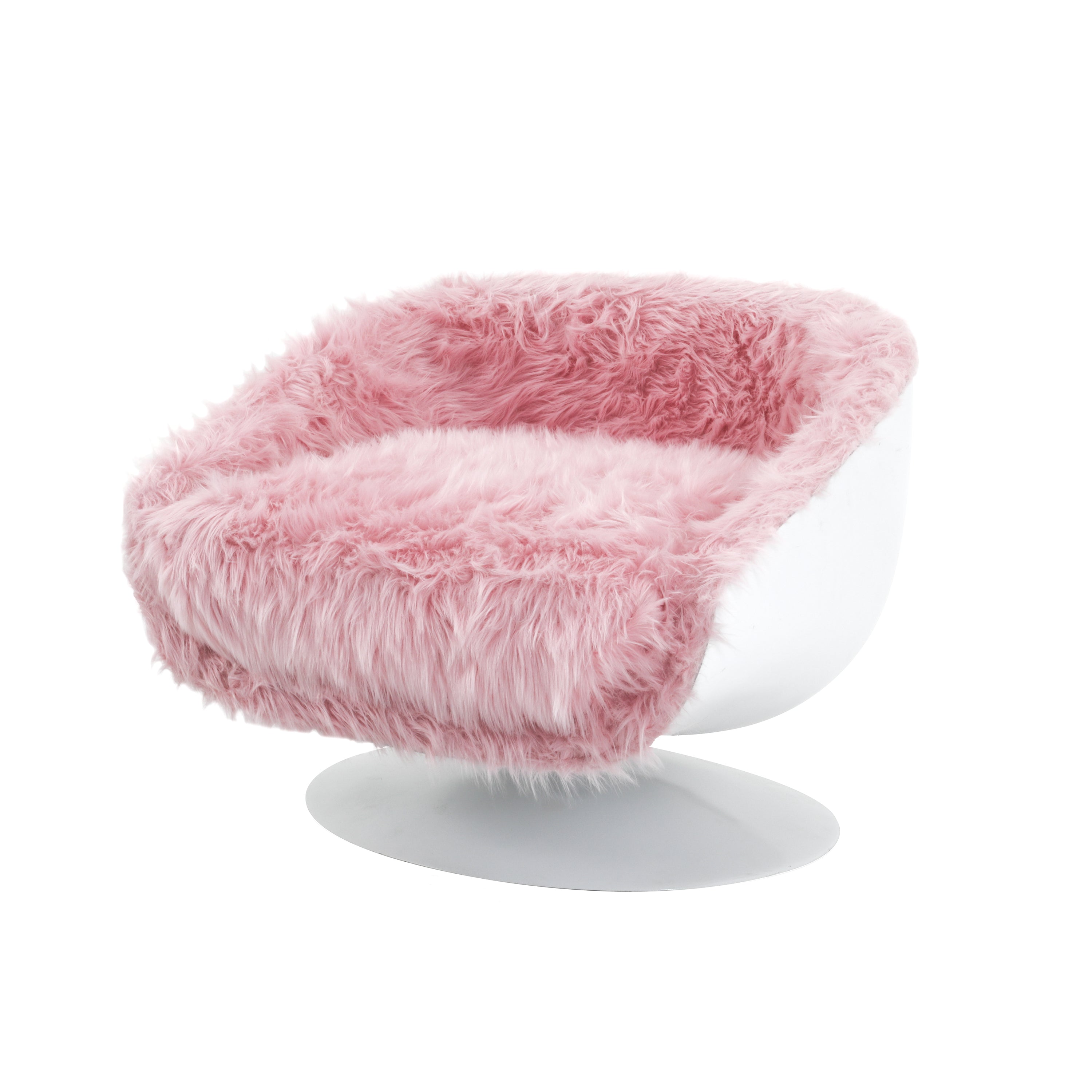 Details: Mod pink faux fur swivel lounge chair with white round tulip base Dimensions: 26" H x 30" W x 35" D