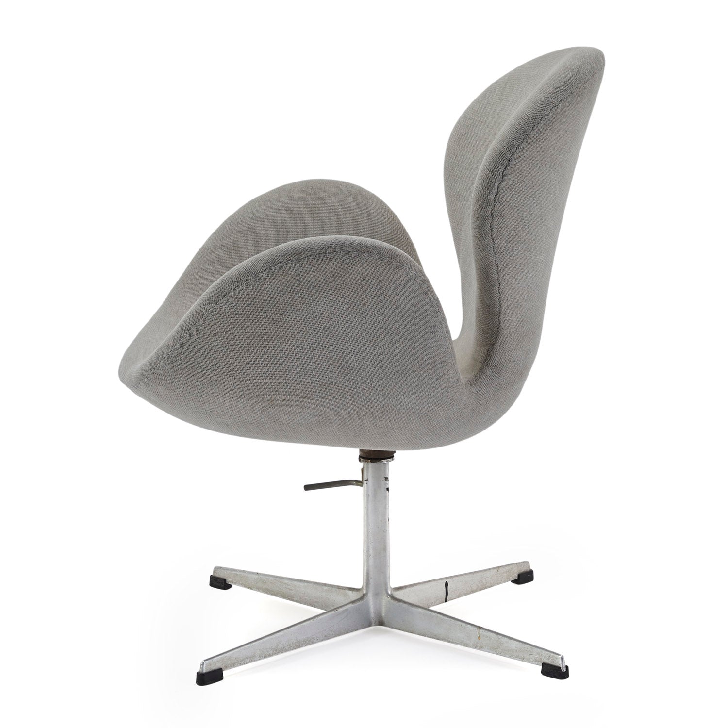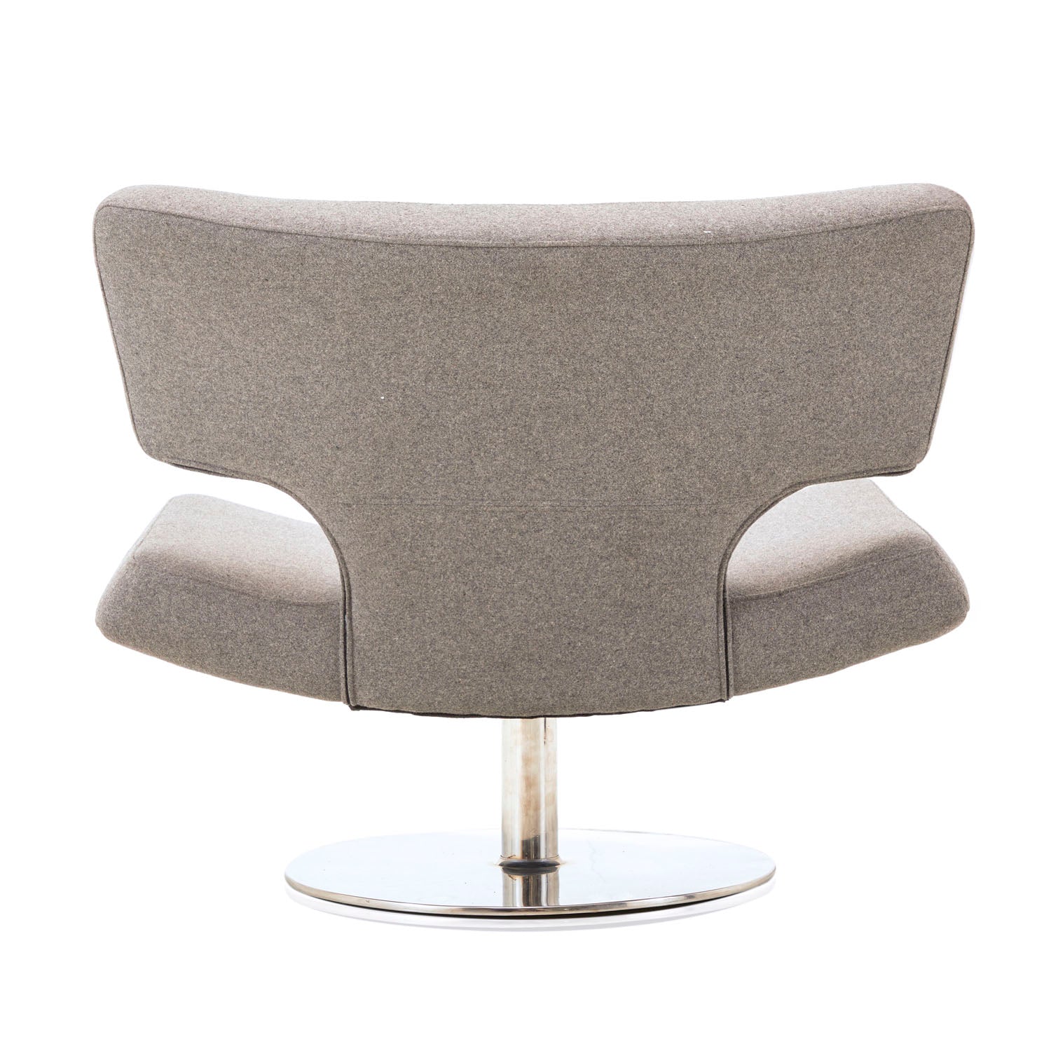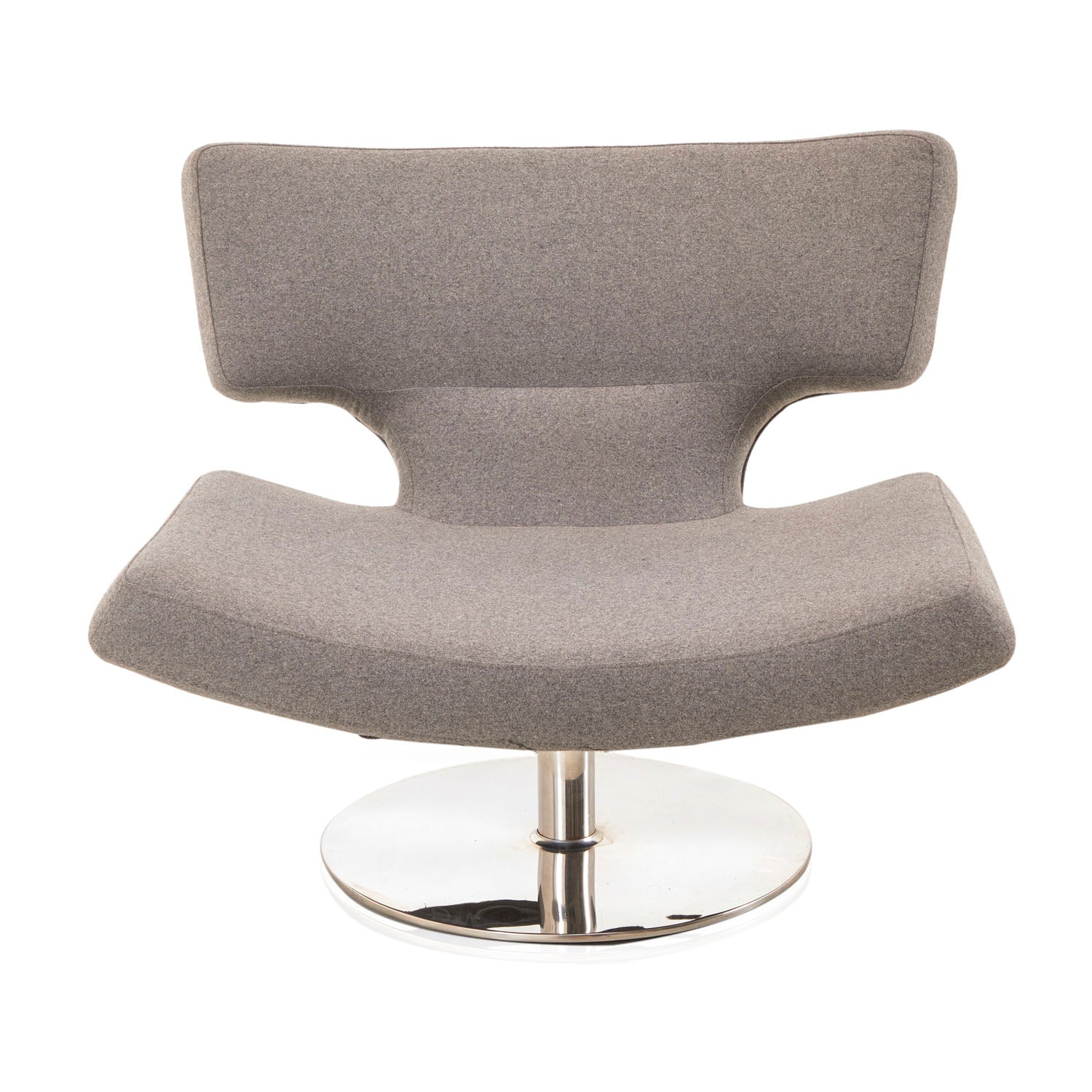 Details: Futuristic arm chair with grey leather upholstery, white plastic shell, and clear base. (Vintage piece with high replacement value) Dimensions: 25" H x 41" W x...