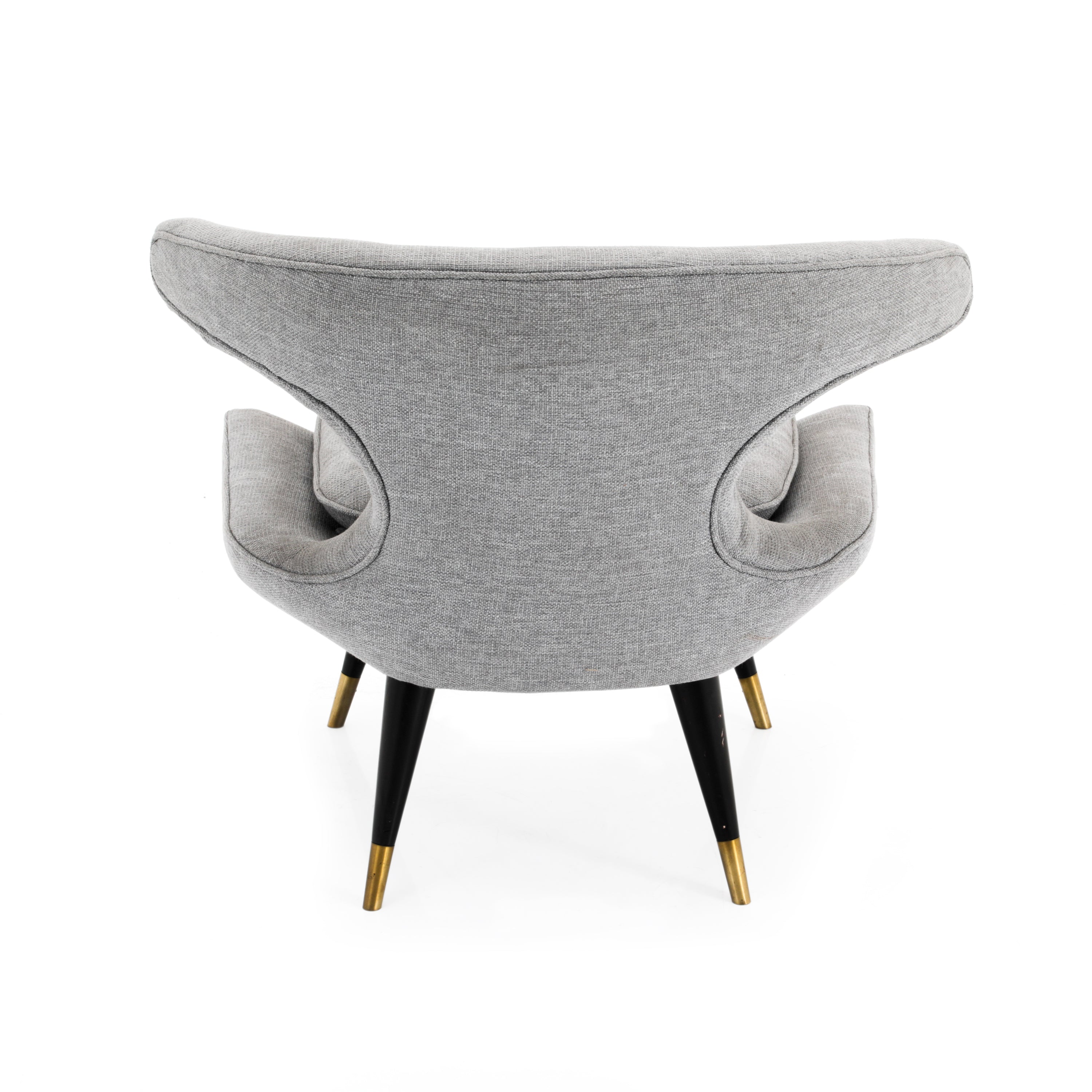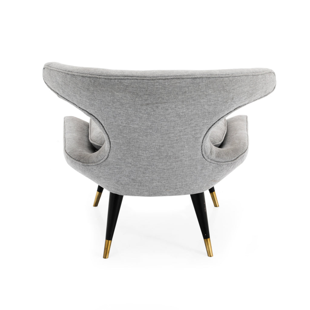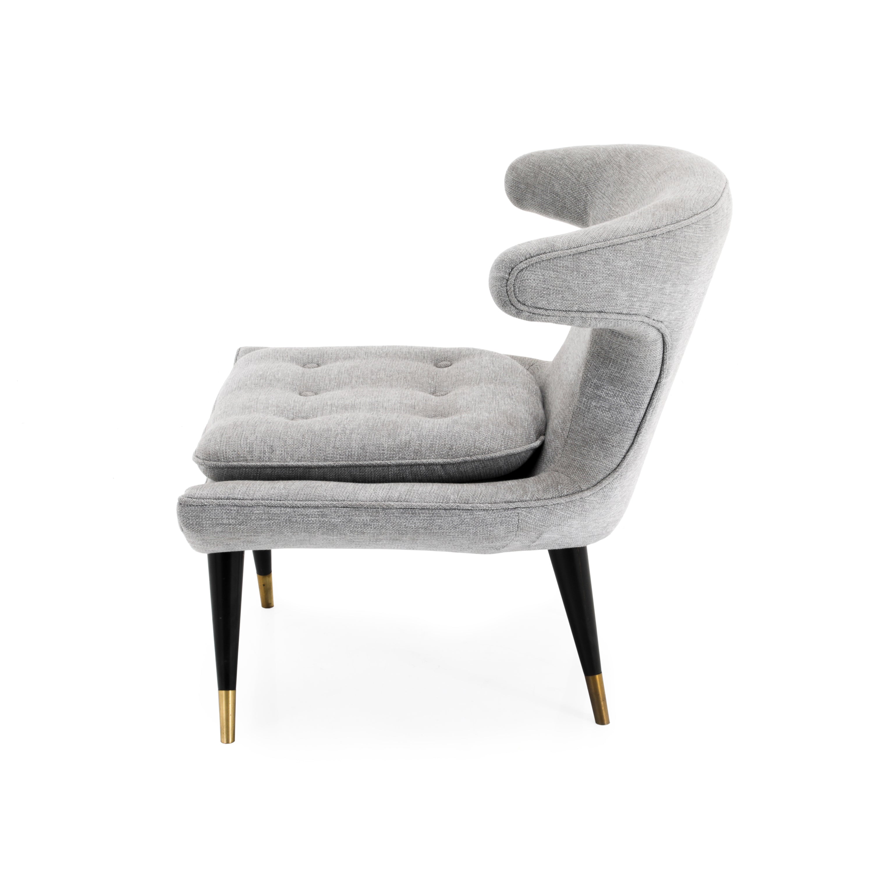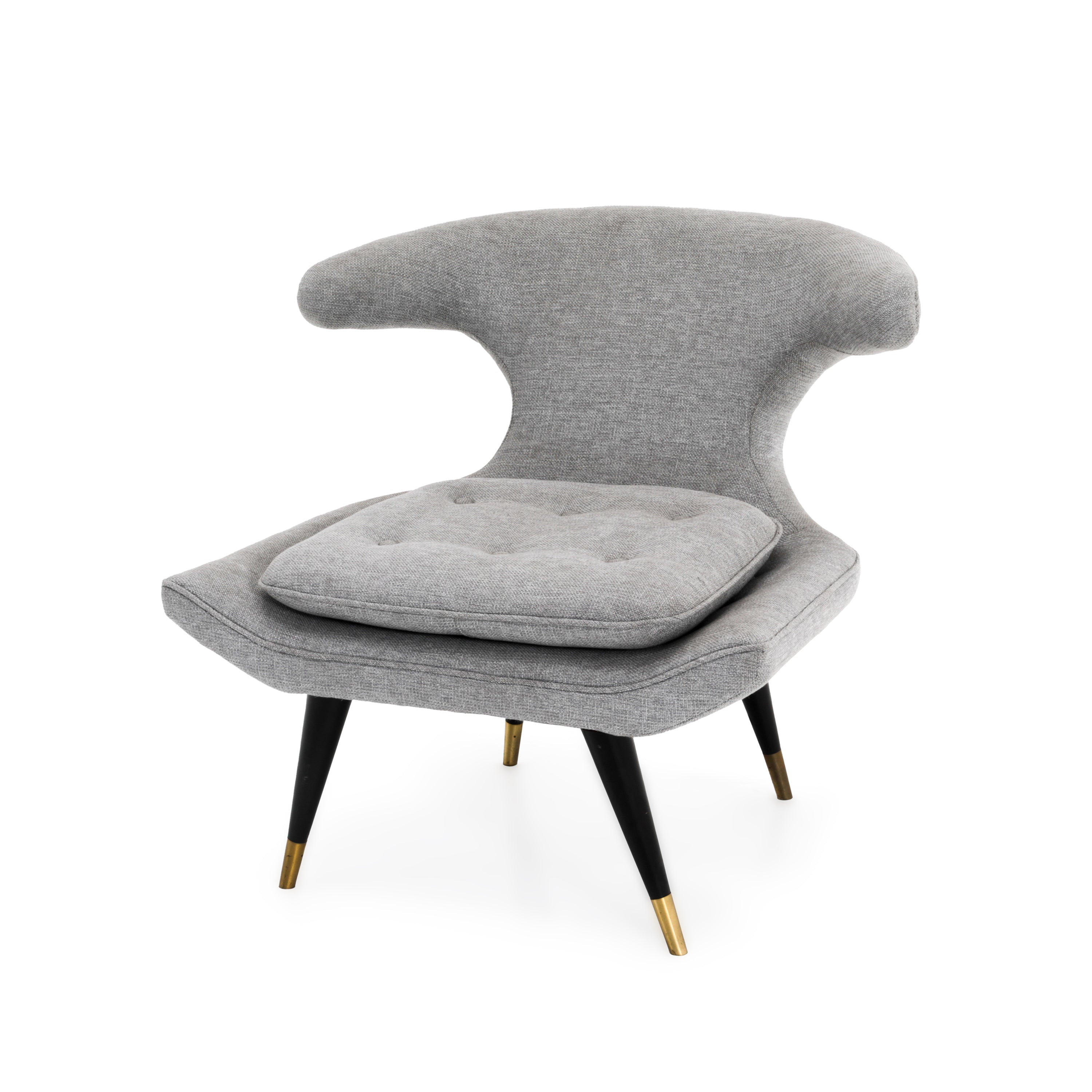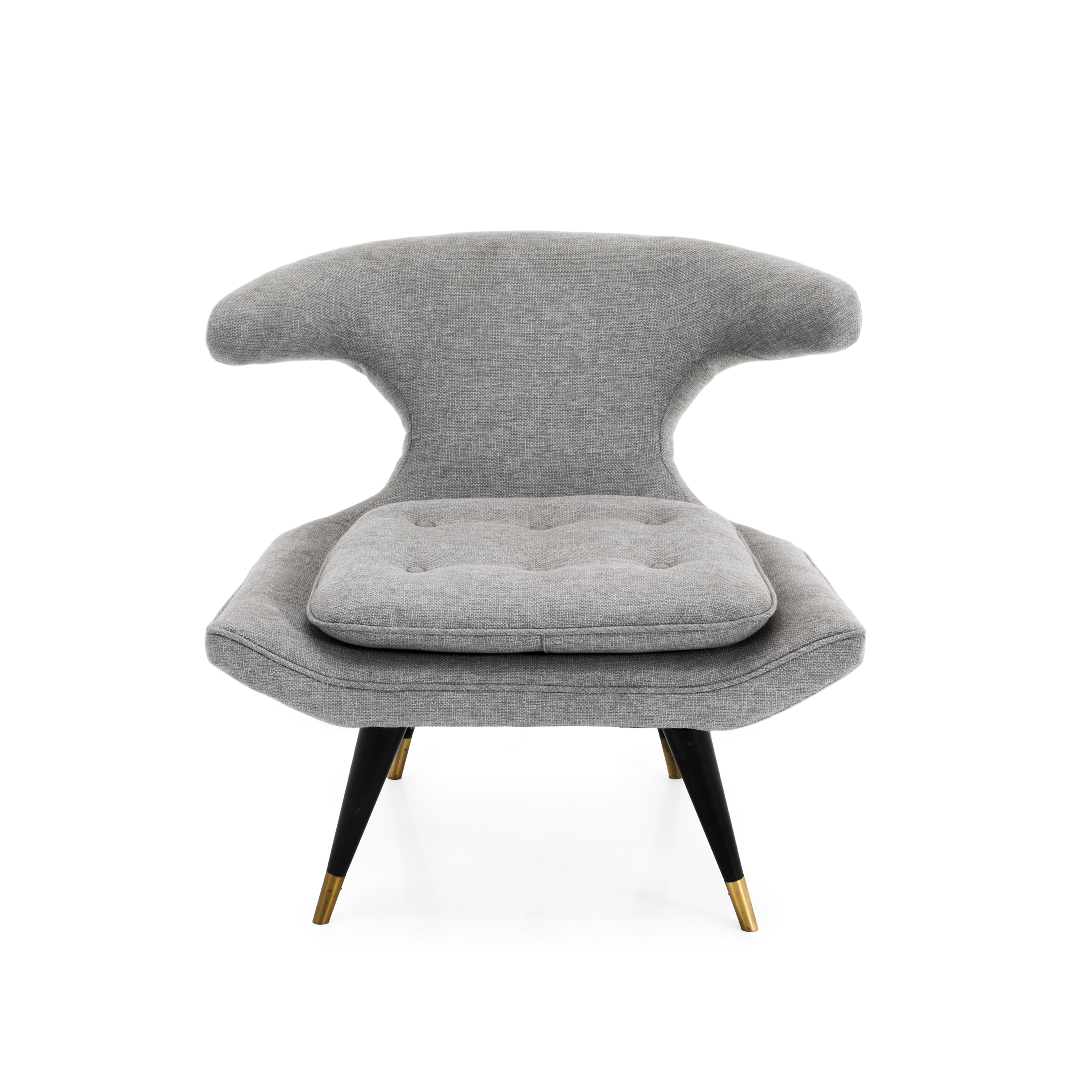 Details: Light grey chair with tufted seat and black wooden legs with brass tips. Dimensions: 32'' H X 36'' W X 32'' D