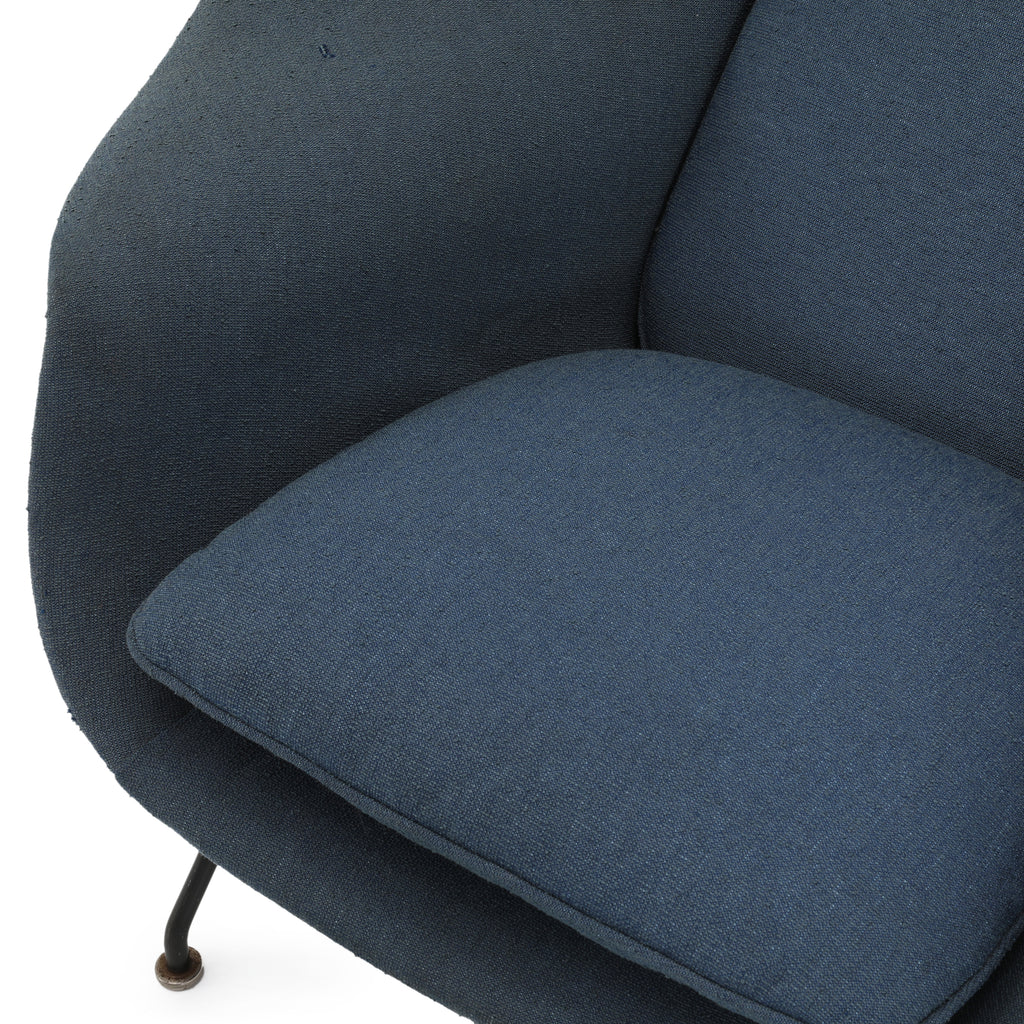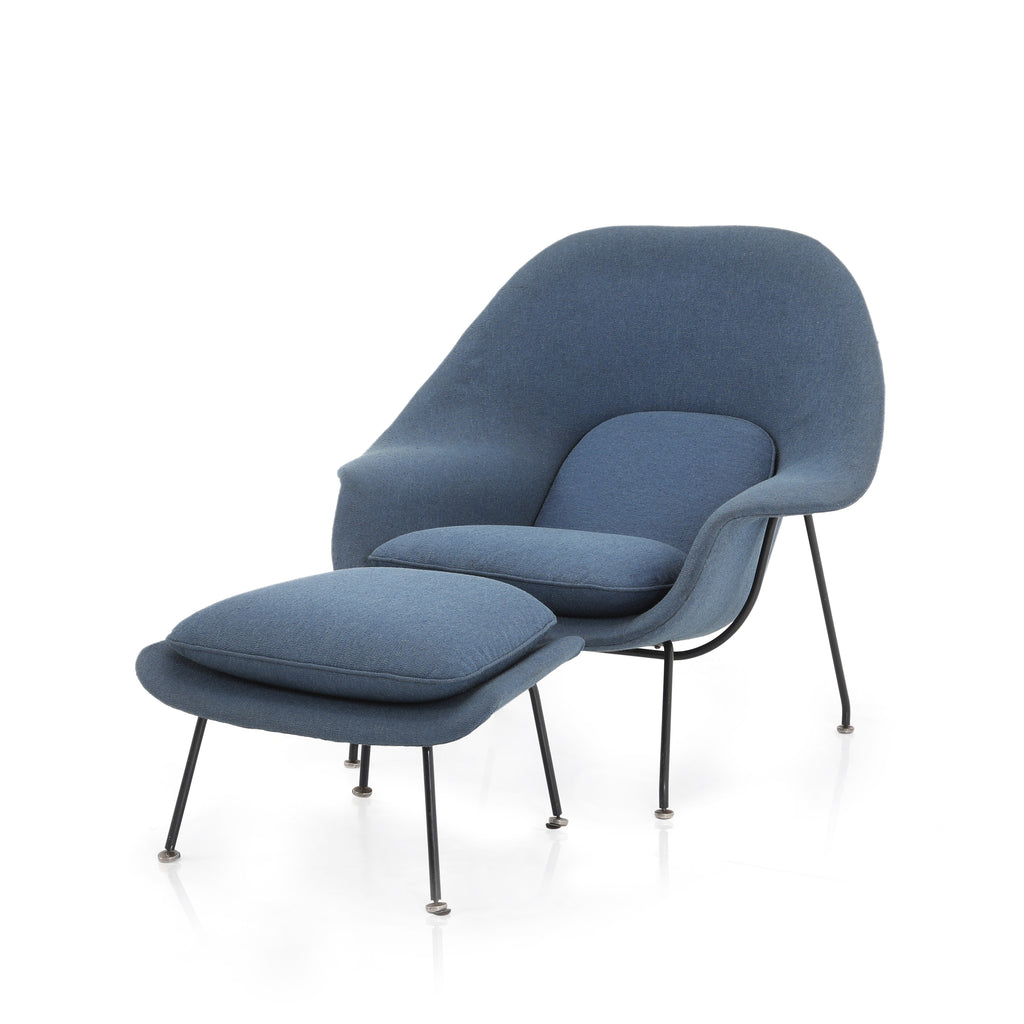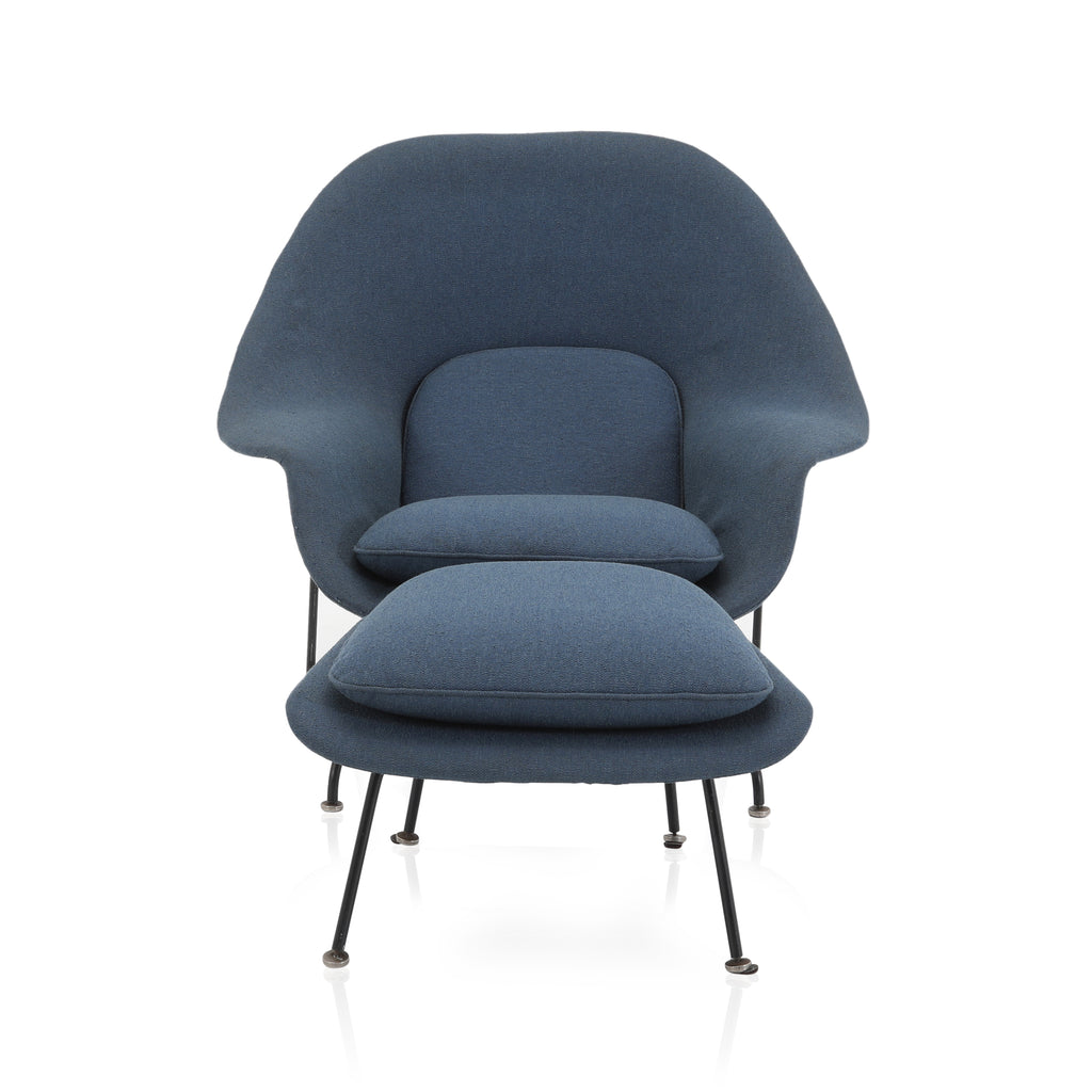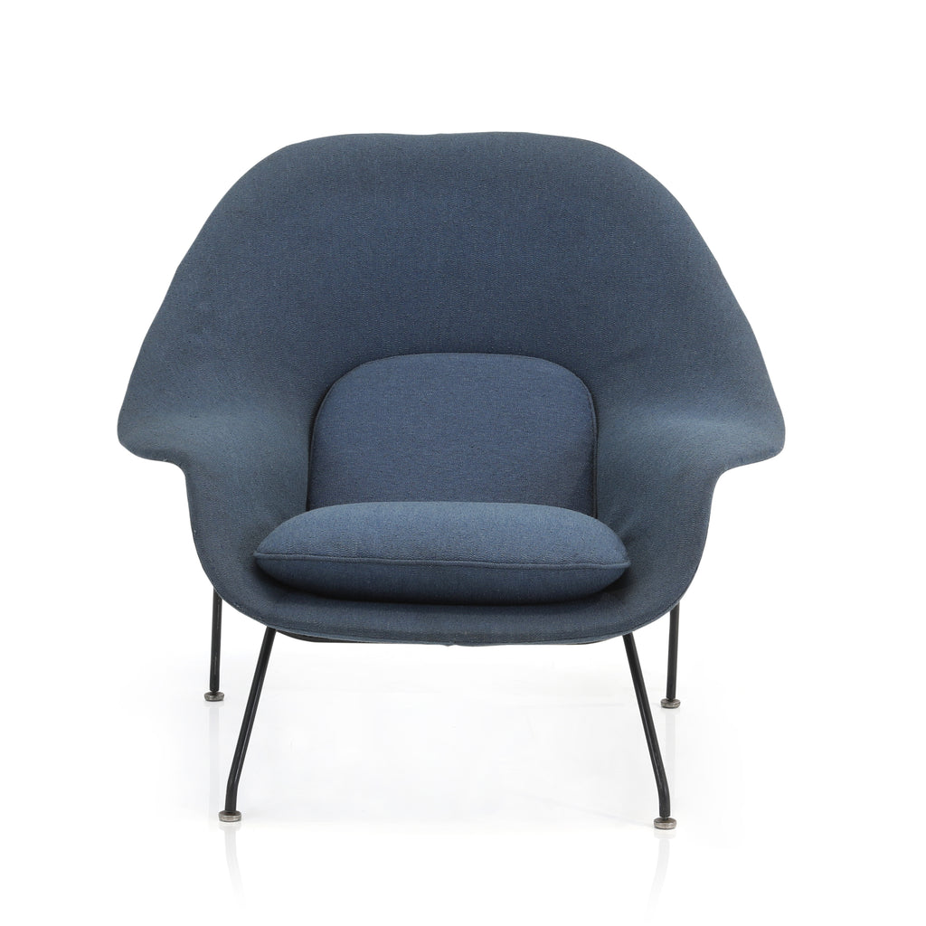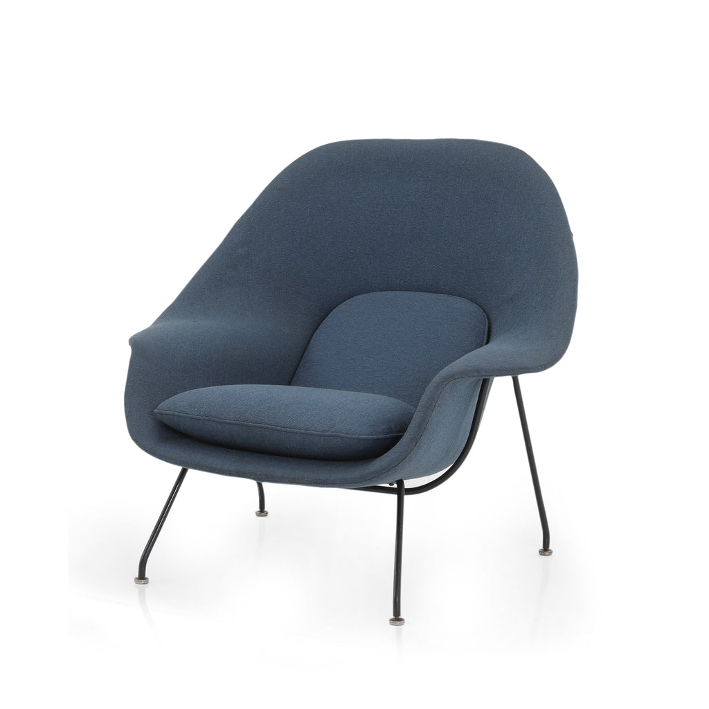 Details: Womb kings road blue chair with bent arm rest design and metal legs, has matching ottoman (rented separately). Some noticeable wear on fabric -...