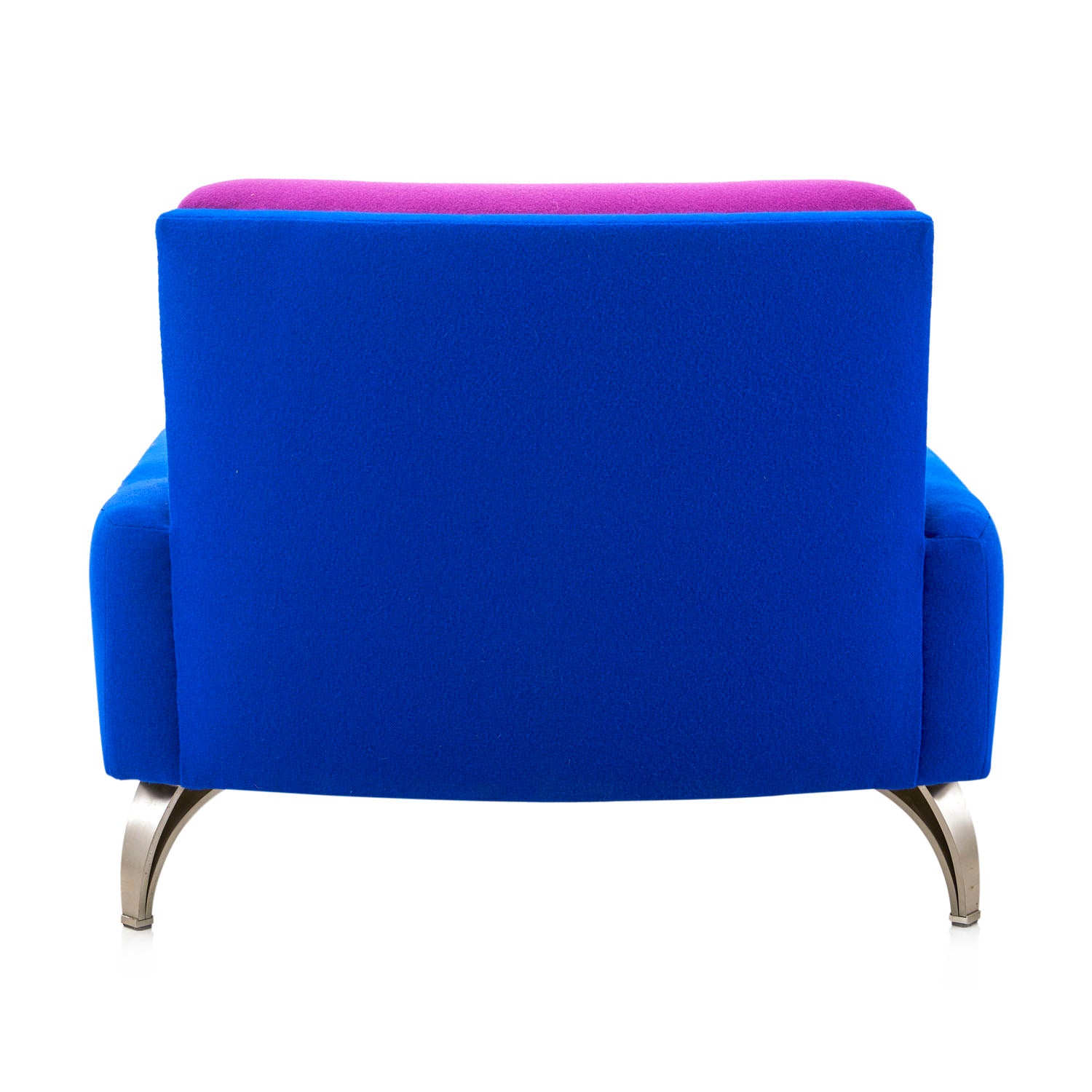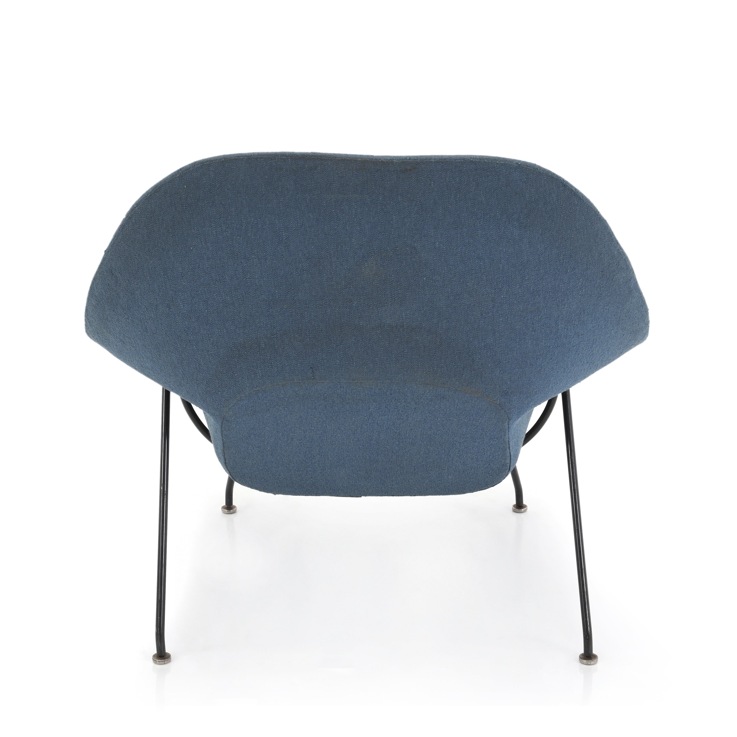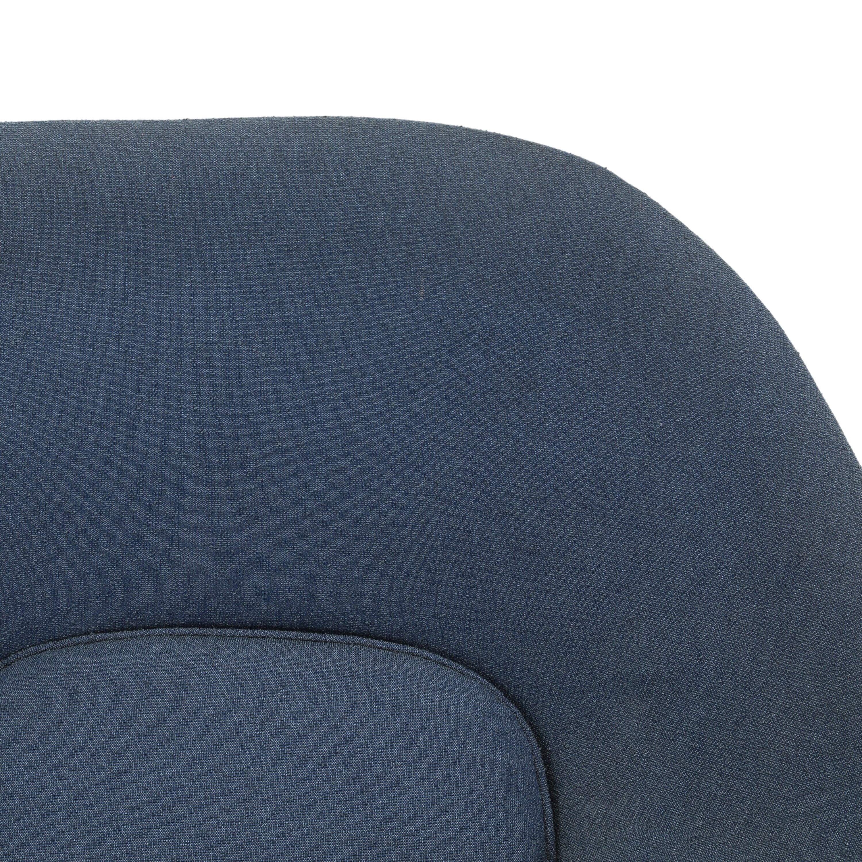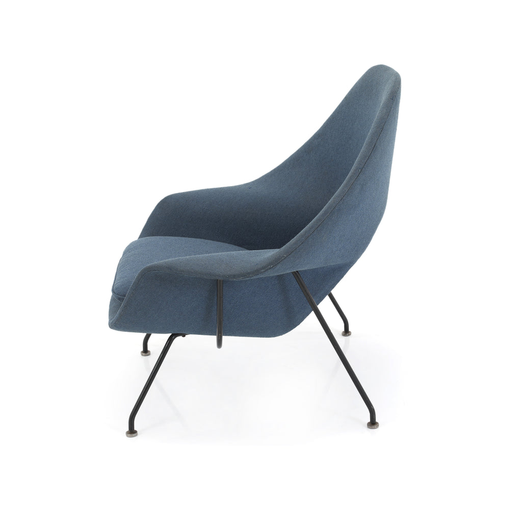 Details: Womb kings road blue chair with bent arm rest design and metal legs, has matching ottoman (rented separately). Some noticeable wear on fabric -...