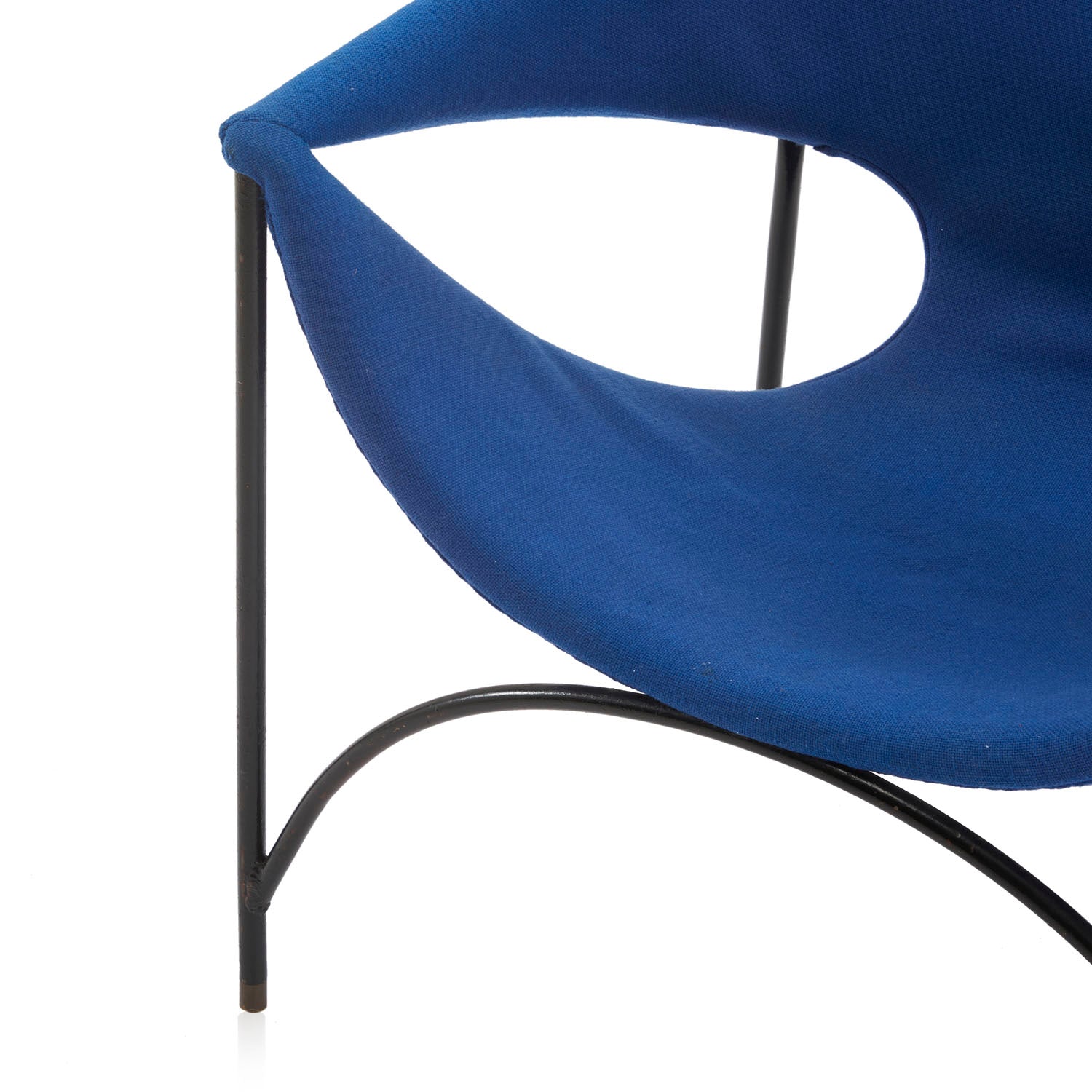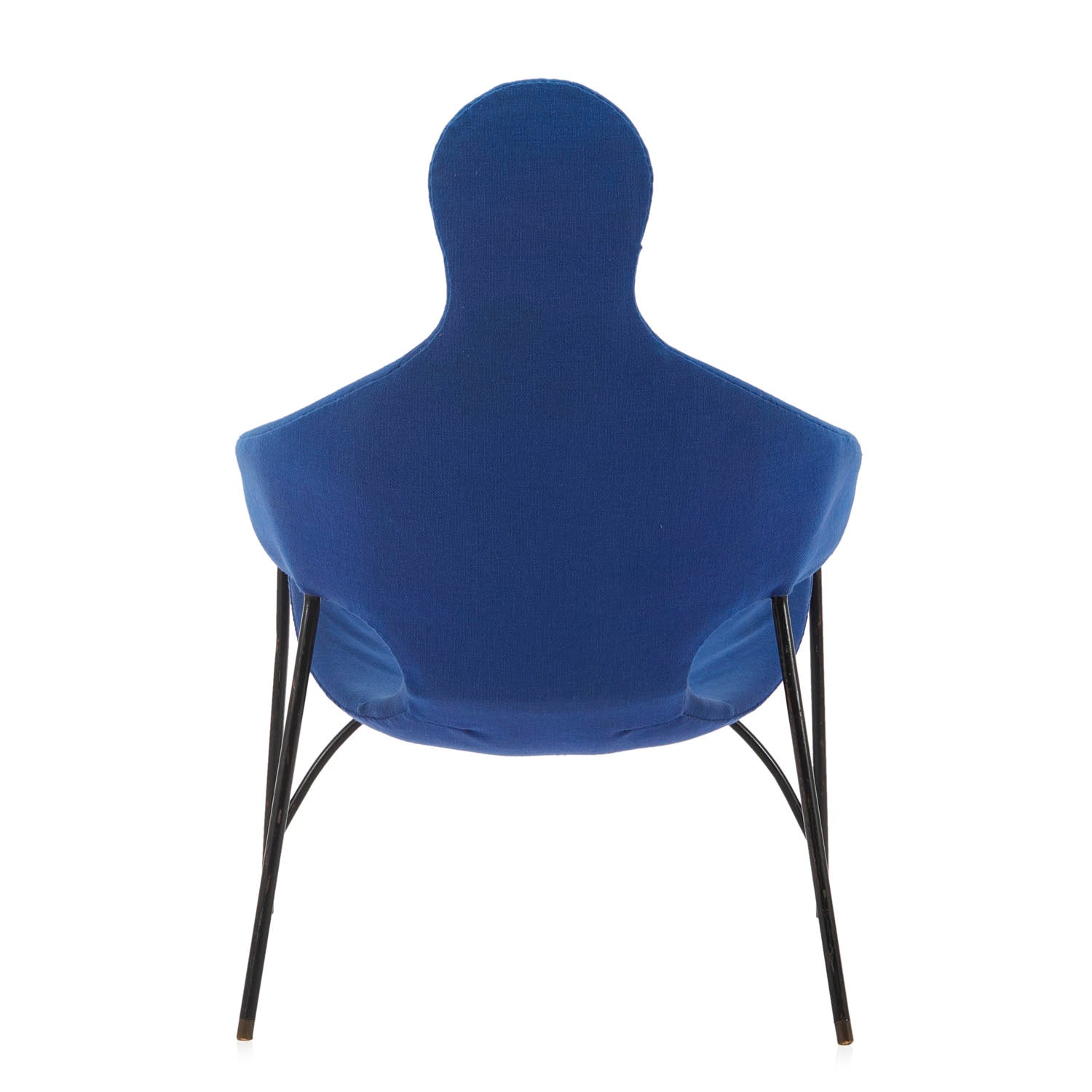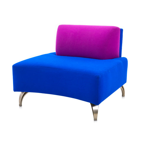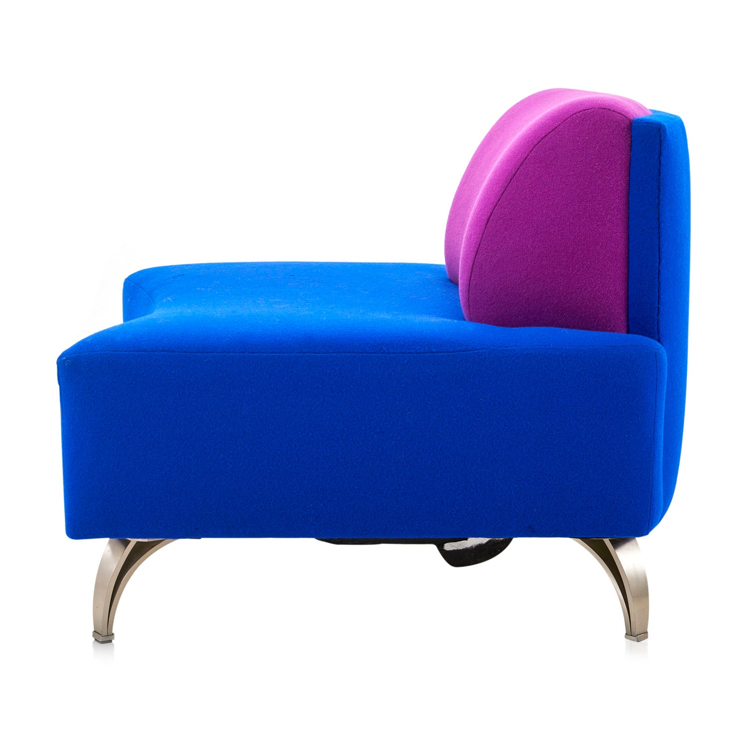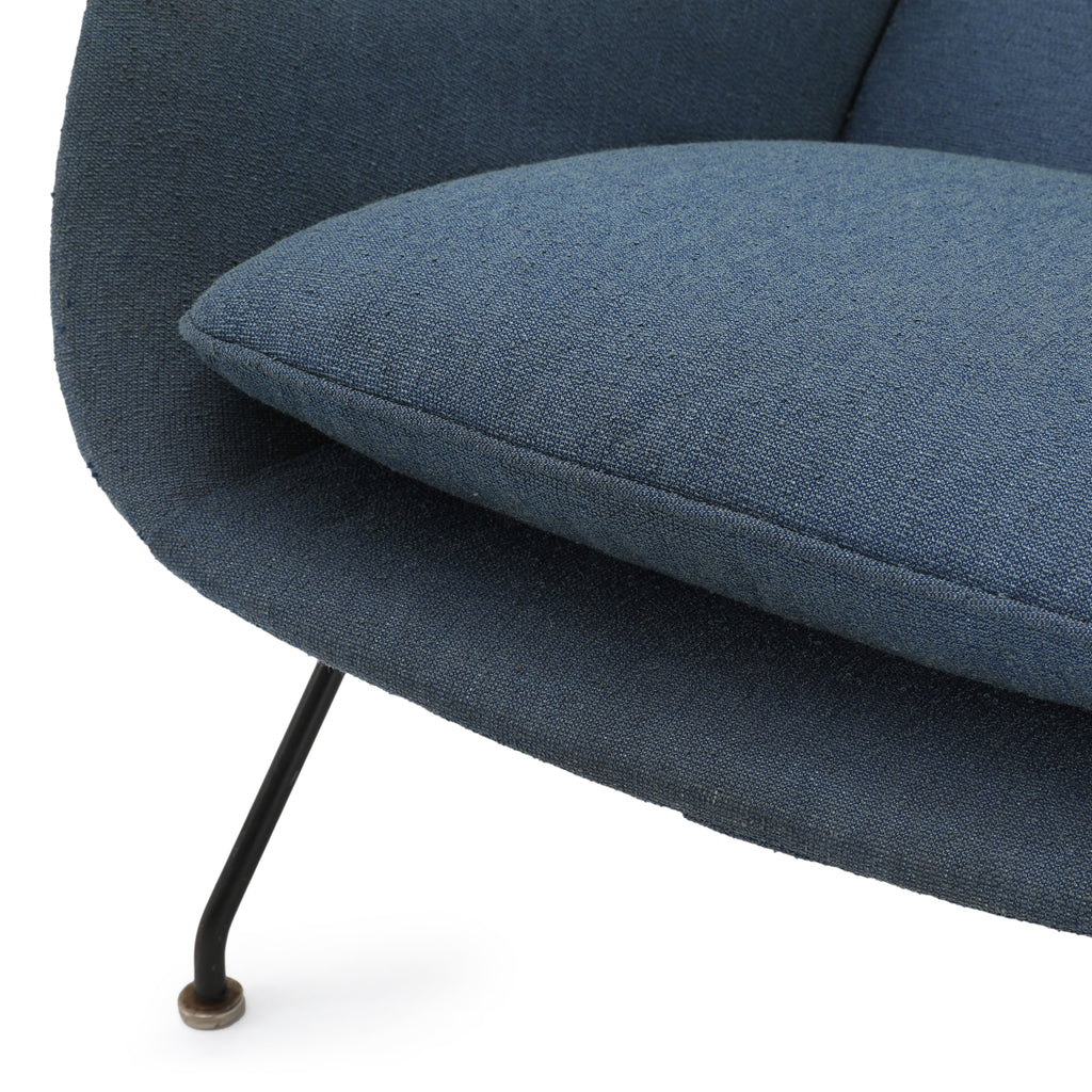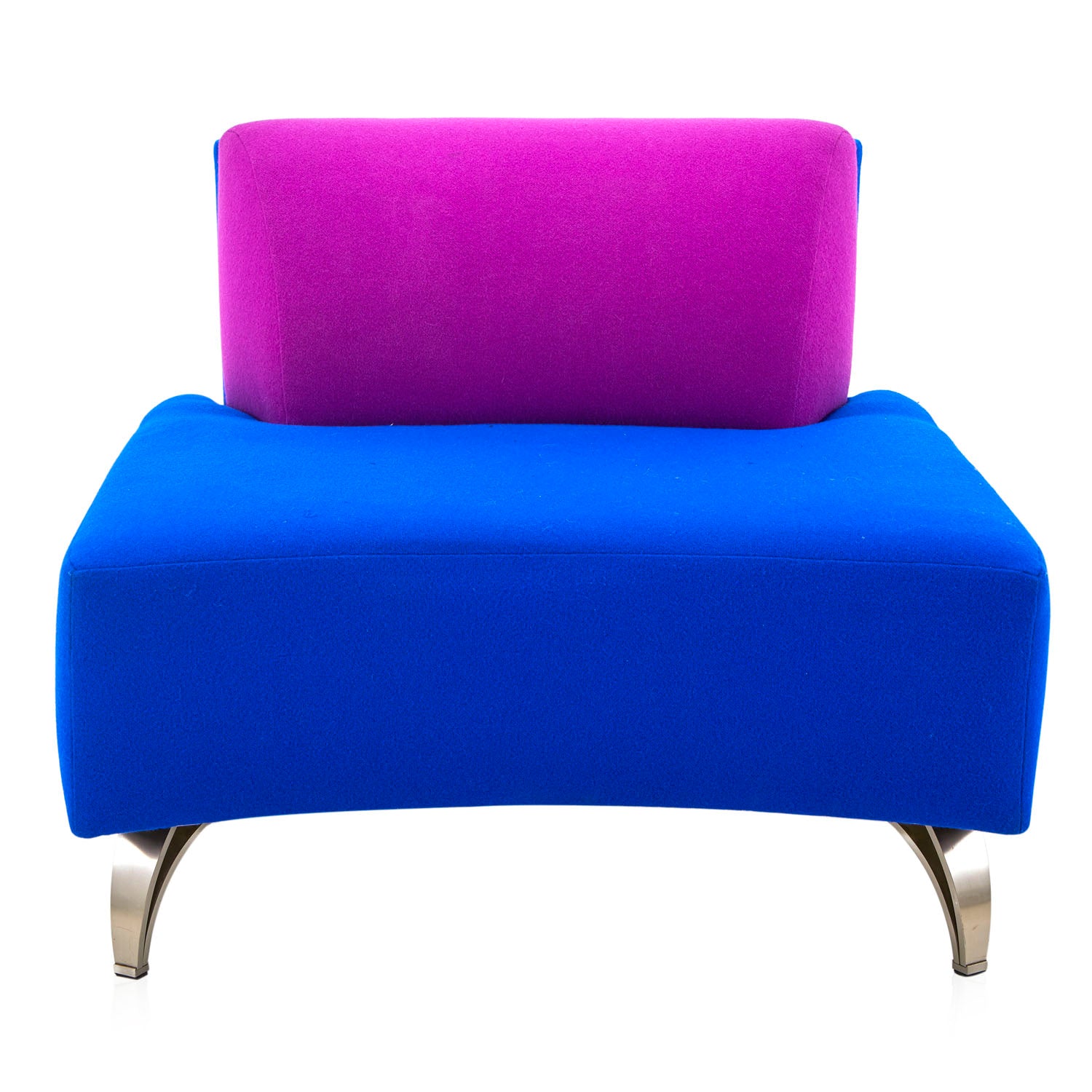 Details: Womb kings road blue chair with bent arm rest design and metal legs, has matching ottoman (rented separately). Some noticeable wear on fabric -...
