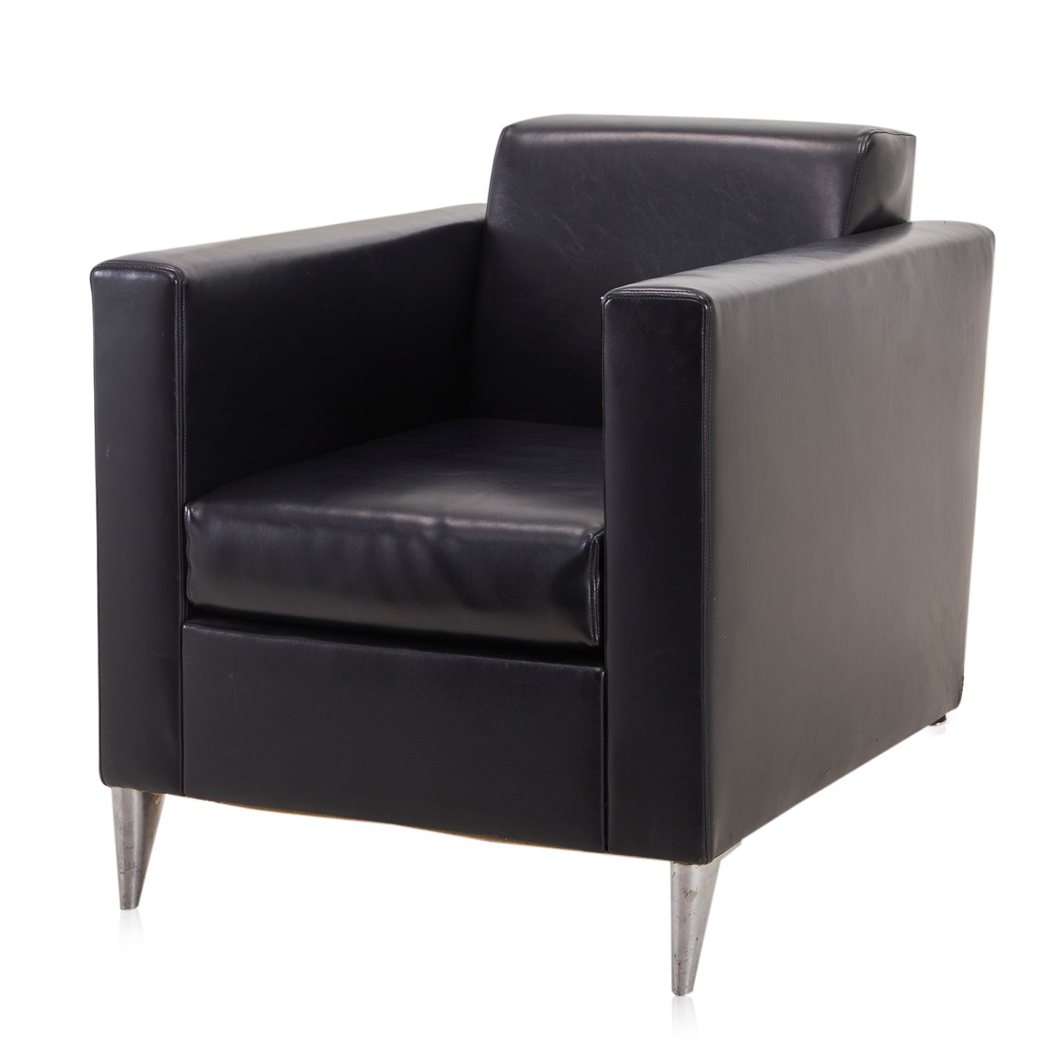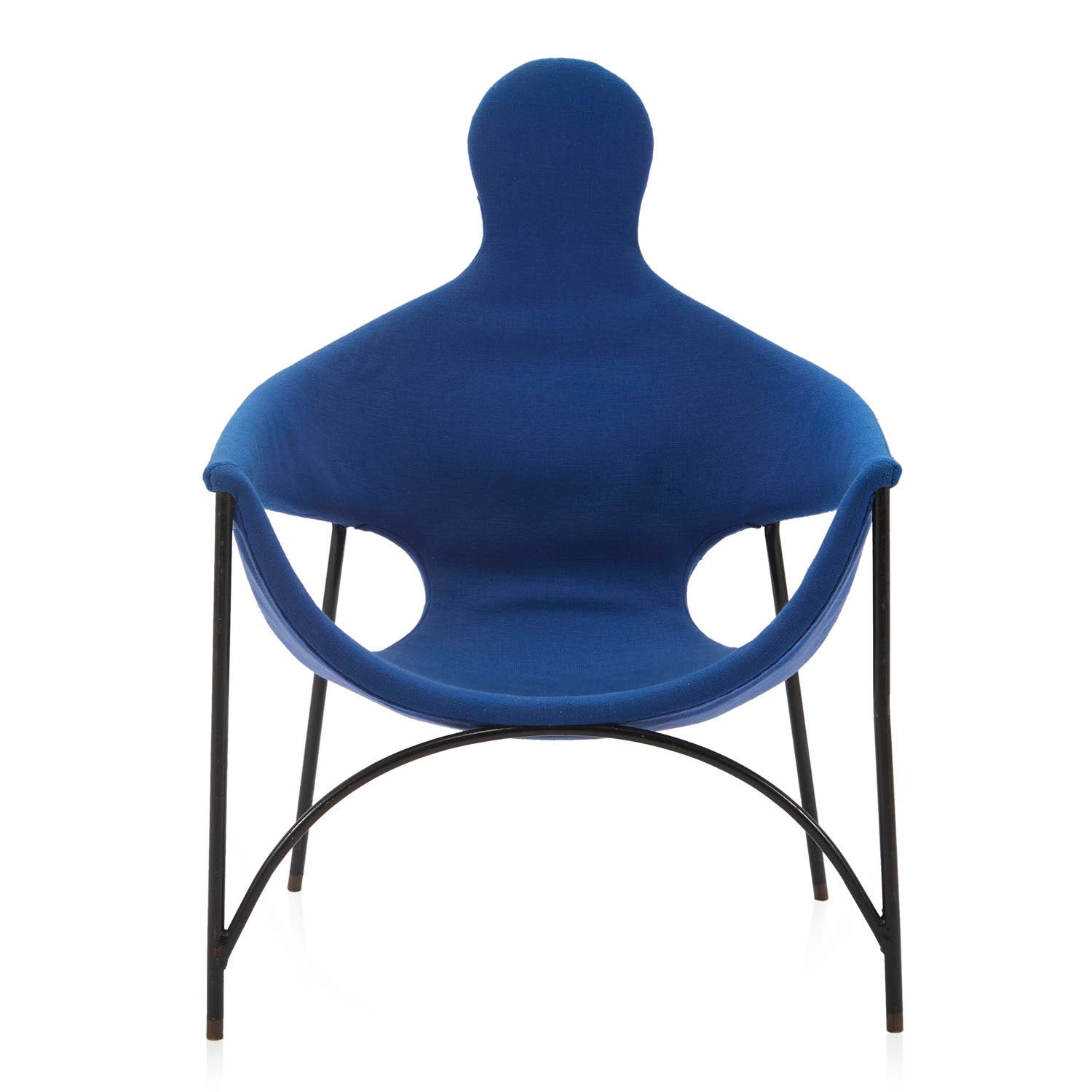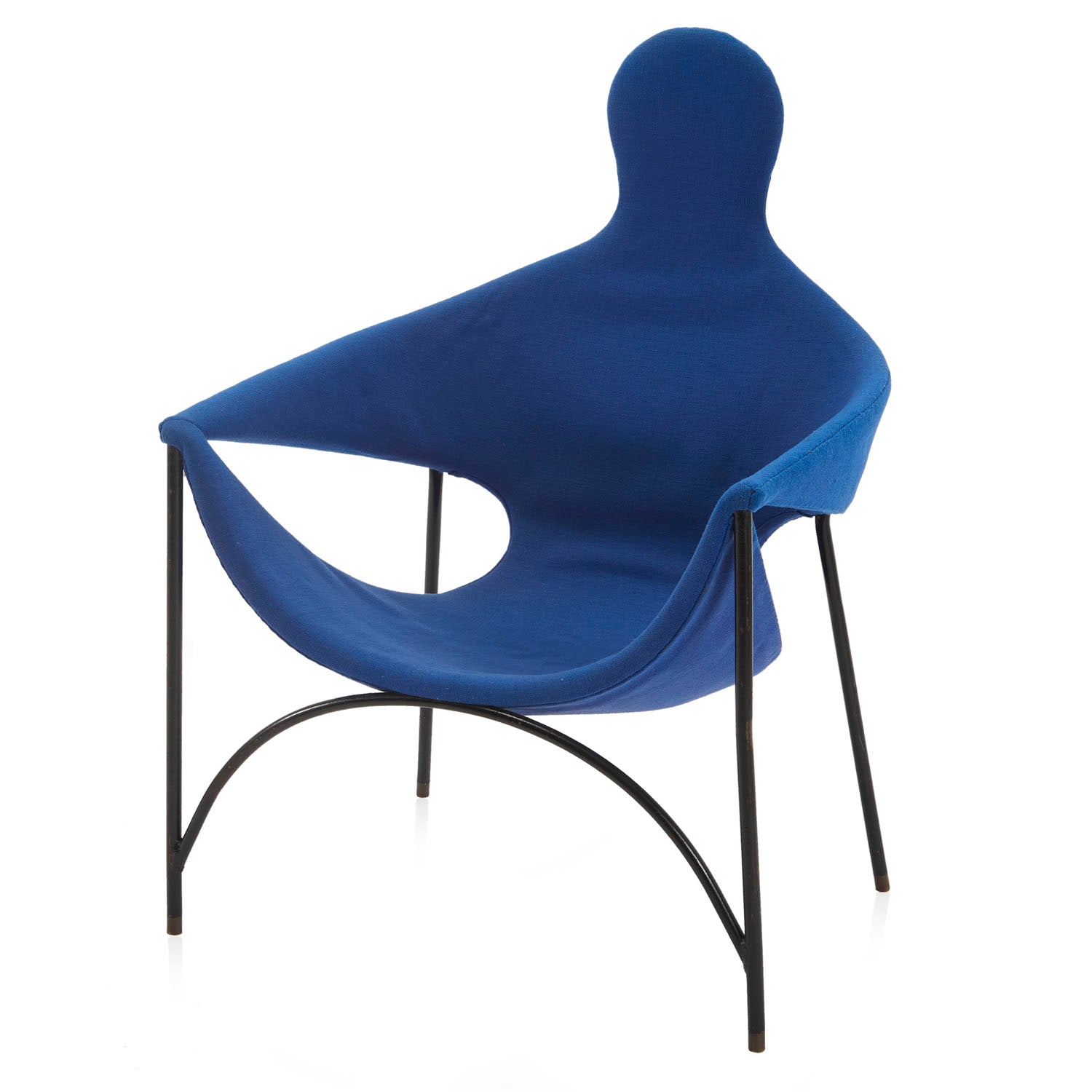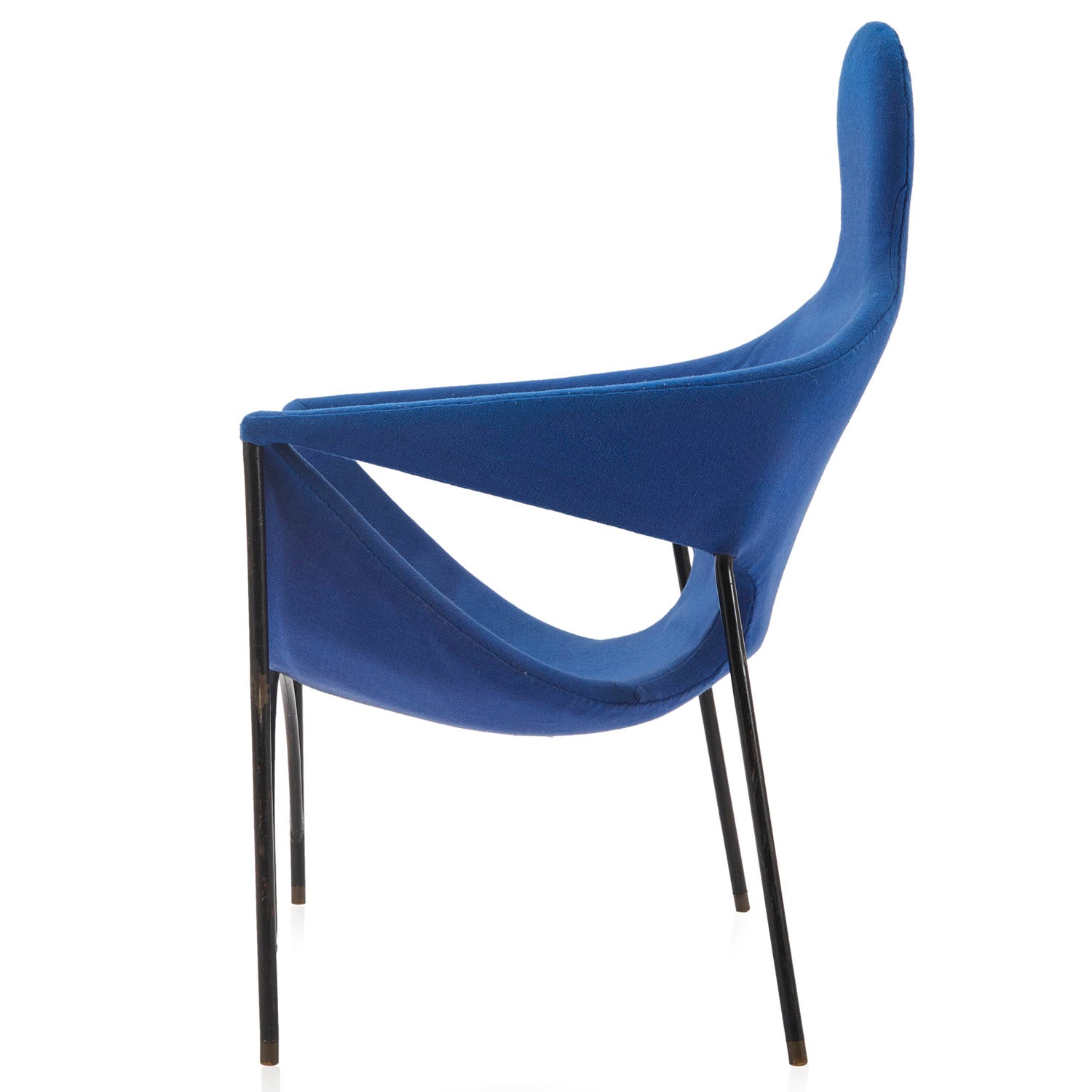 Details: Womb kings road blue chair with bent arm rest design and metal legs, has matching ottoman (rented separately). Some noticeable wear on fabric -...