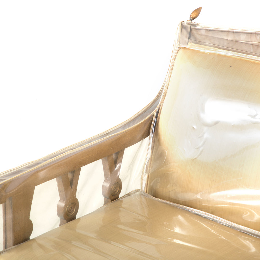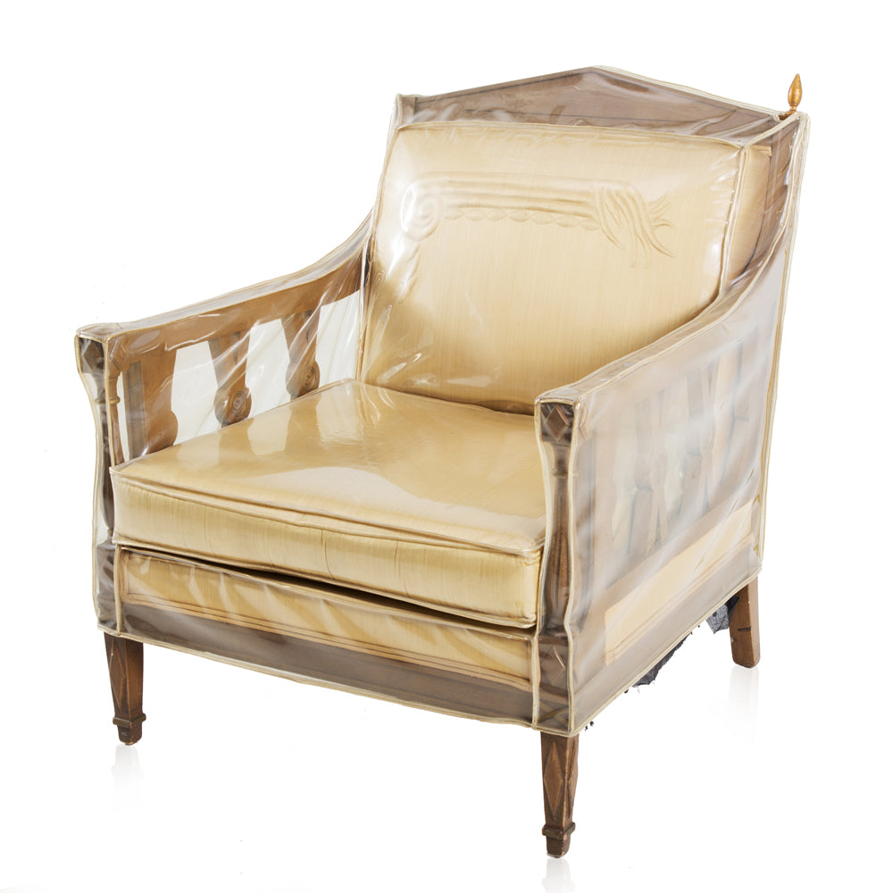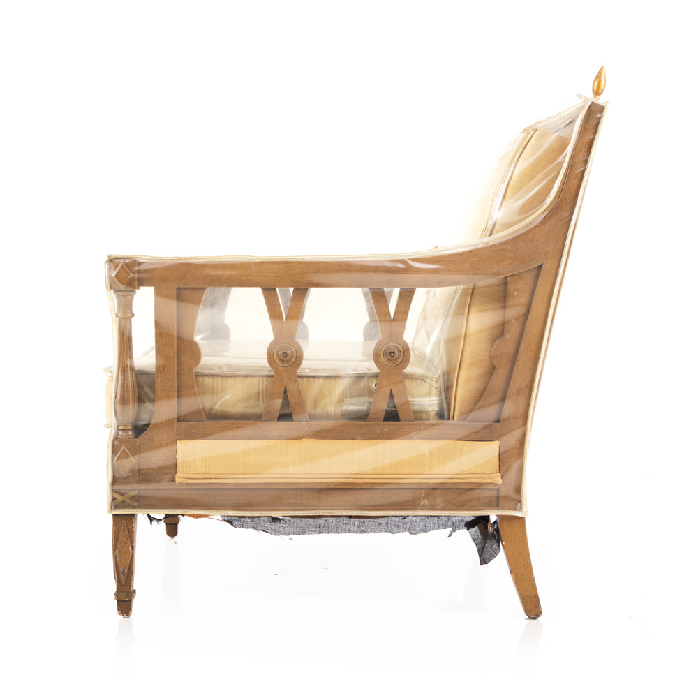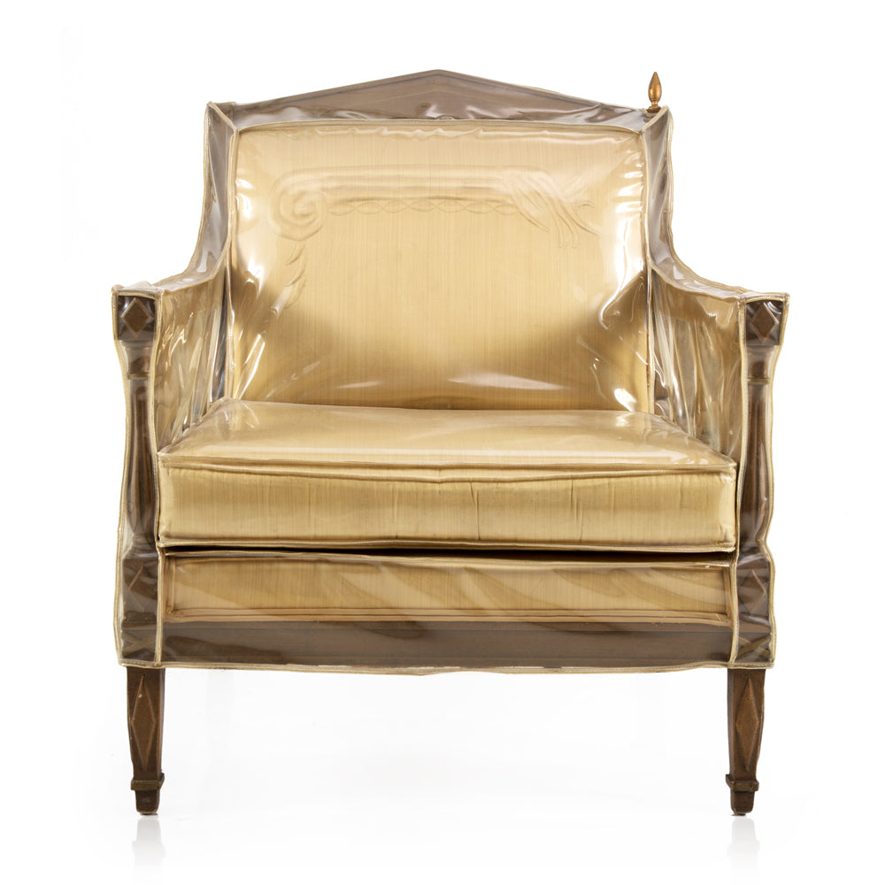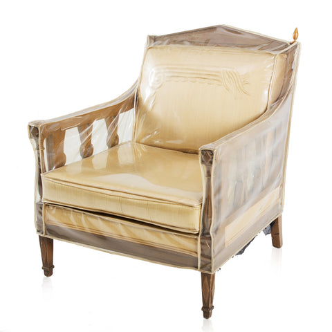 Details: Wood and gold deep lounge chair with tight plastic covering Dimensions: 34" H x 28" W x 32" D