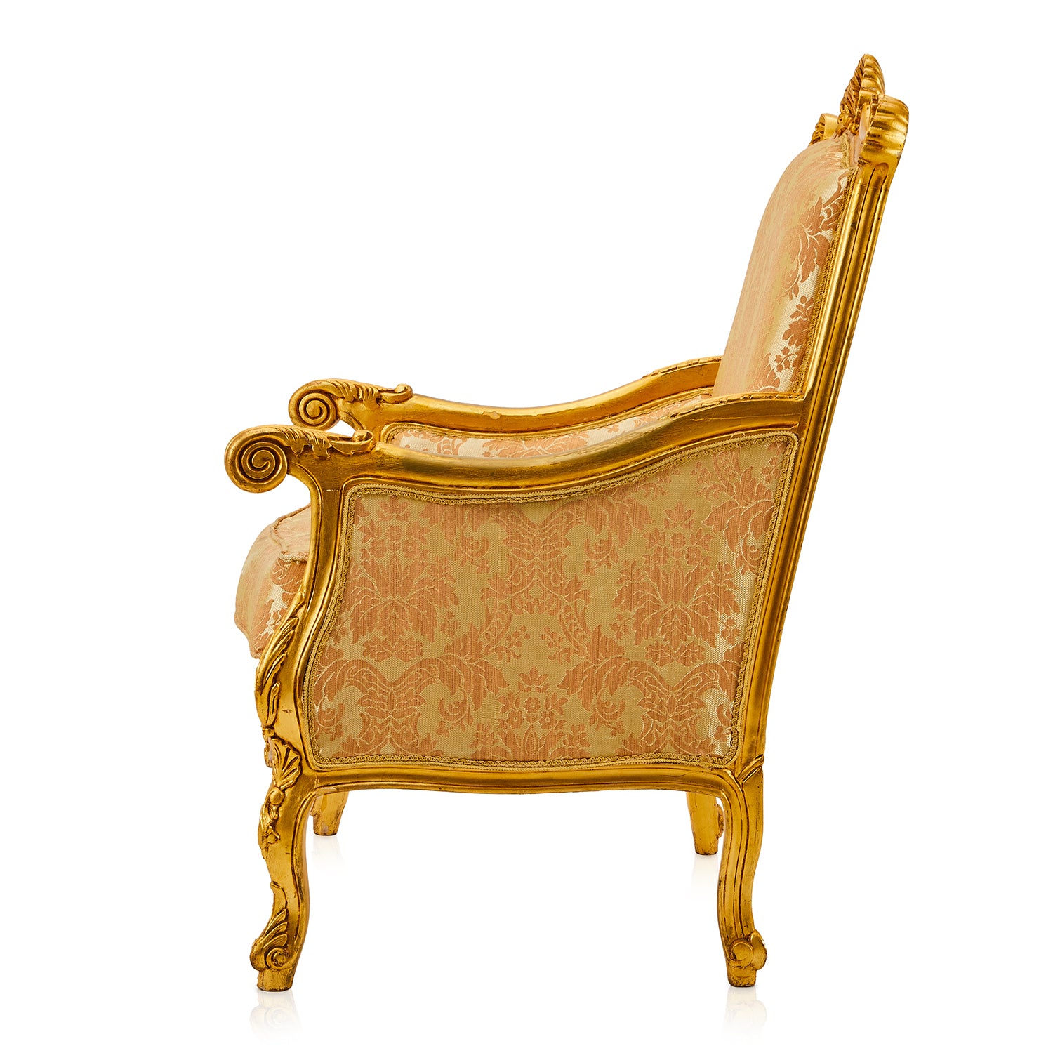 Details: Gold armchair with flower garden pattern and high back Dimensions: 47" H x 31" W x 30" D Quantity: 2