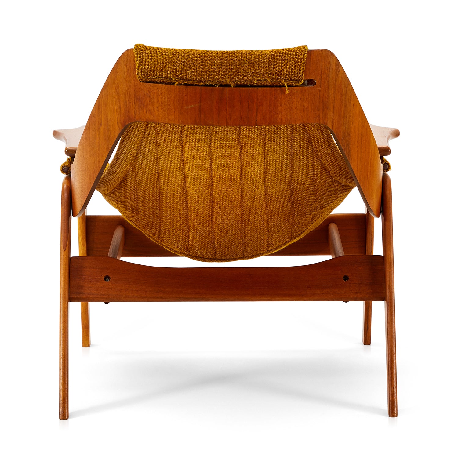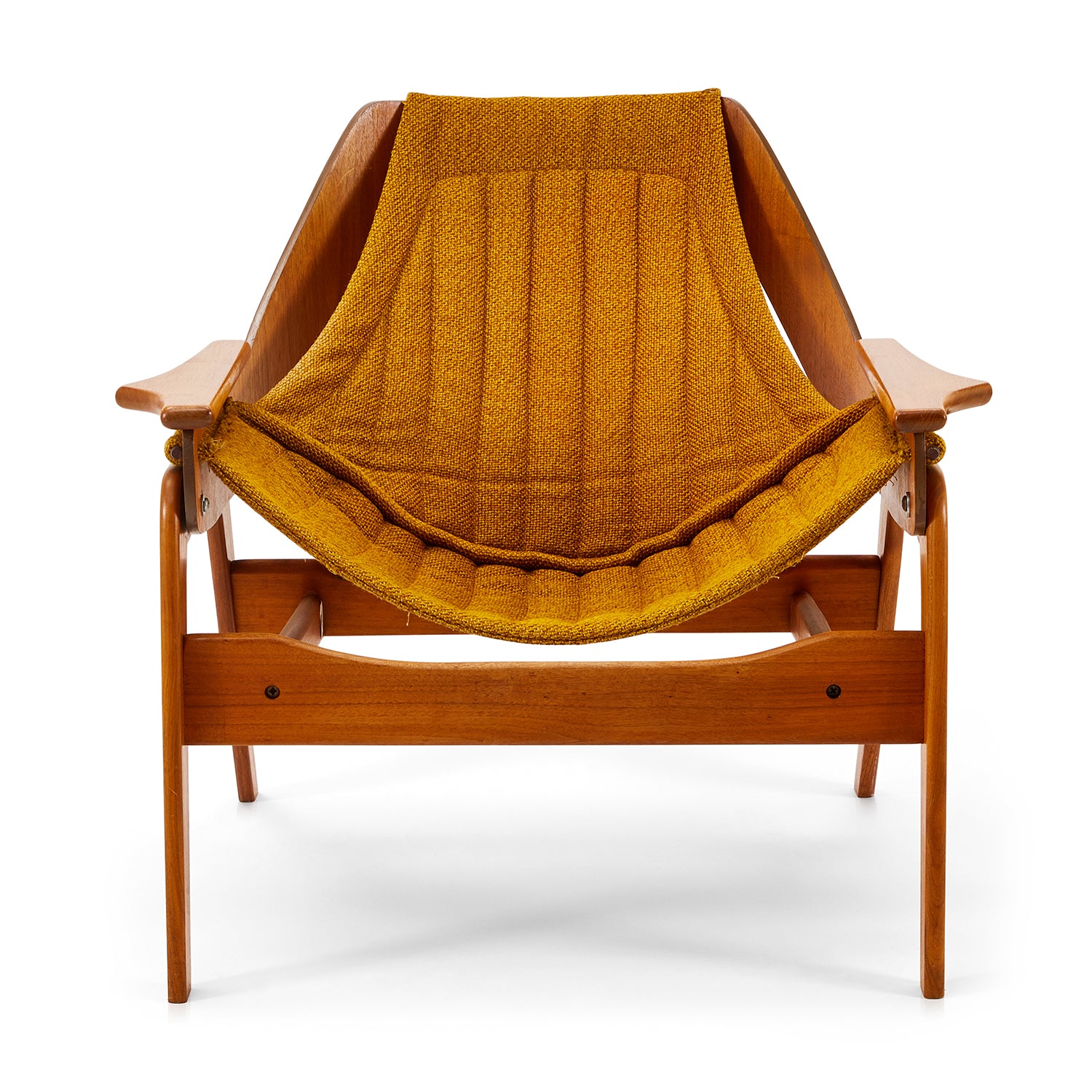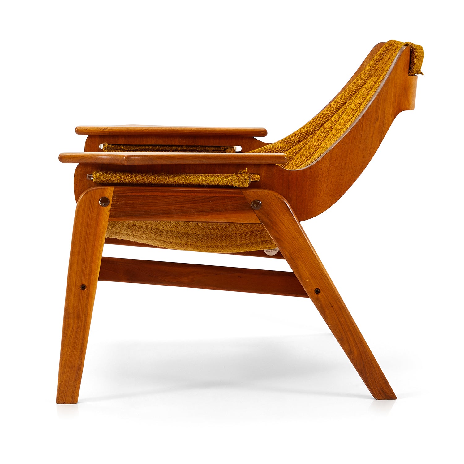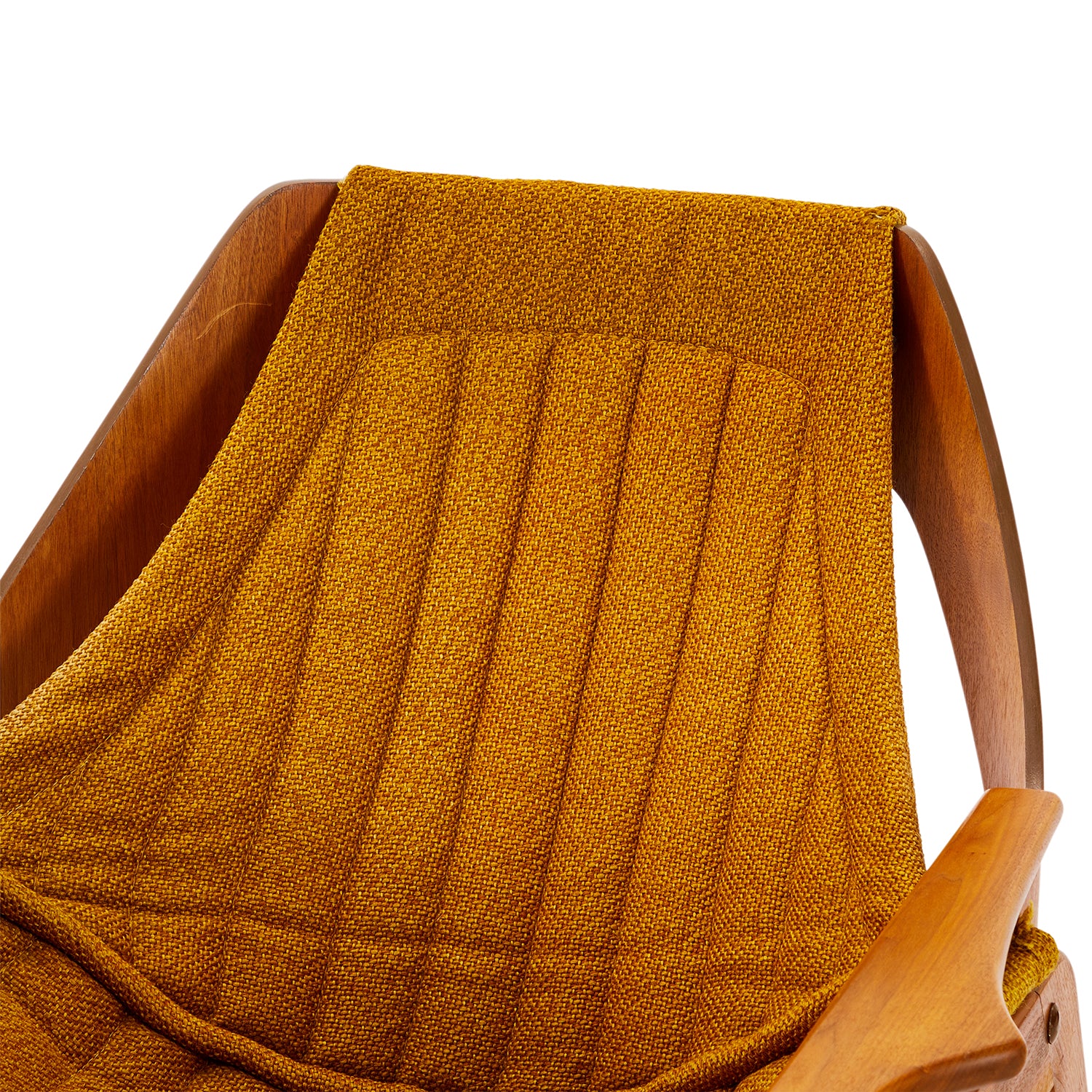 Details: A bentwood lounge chair designed by Jerry Johnson c. 1964 with a sculptural wooden frame and a thick mustard yellow tweed sling seat