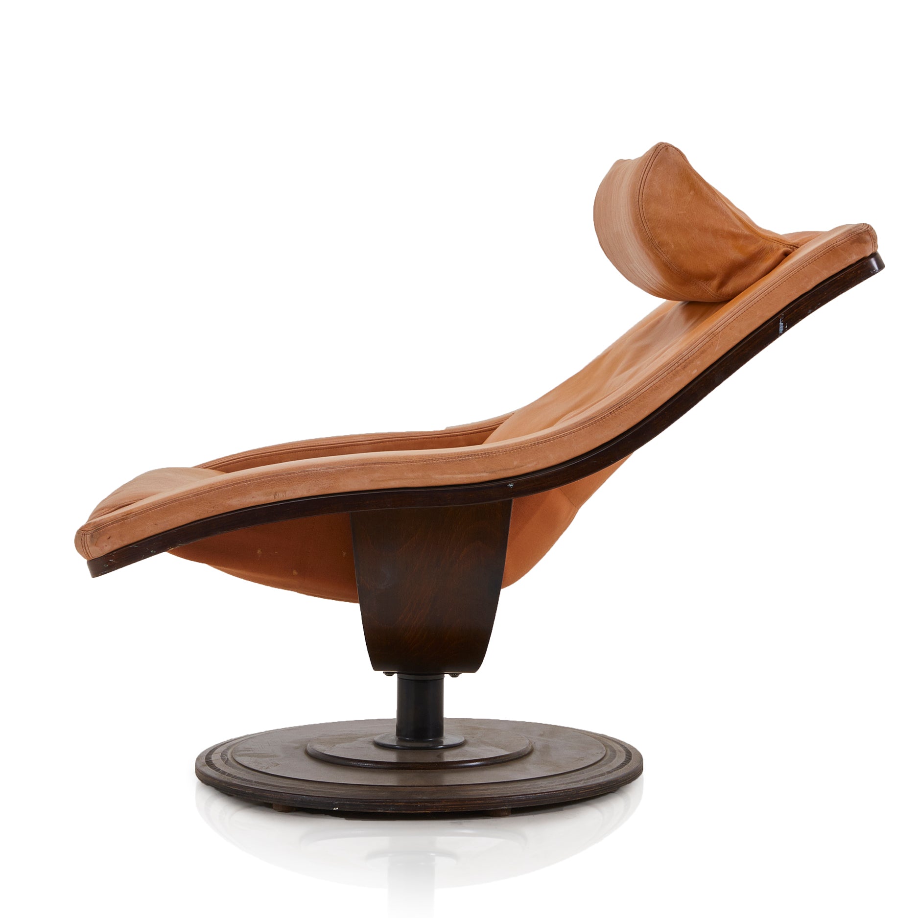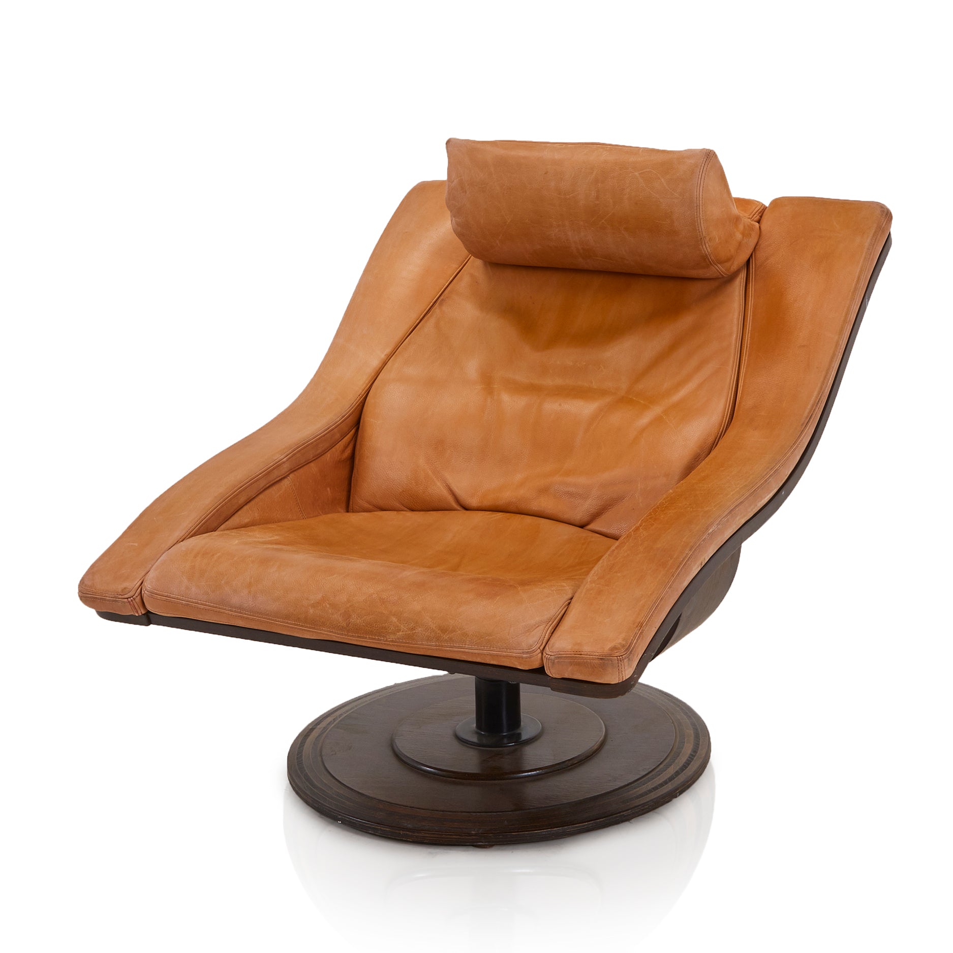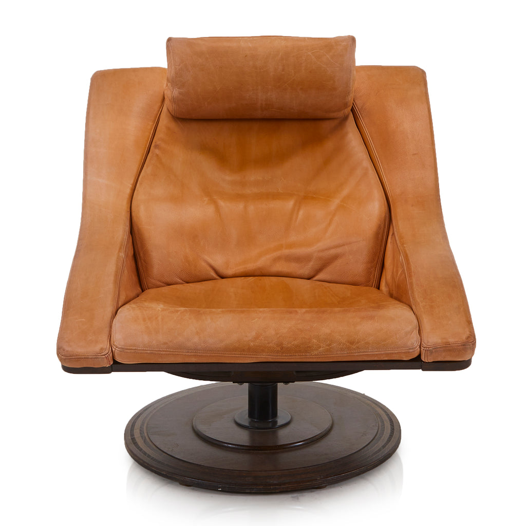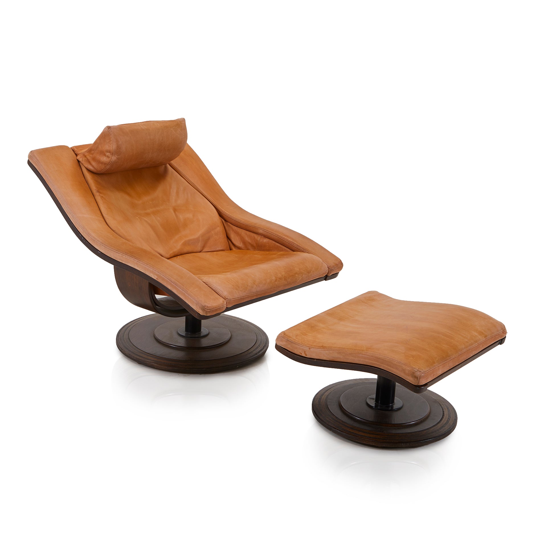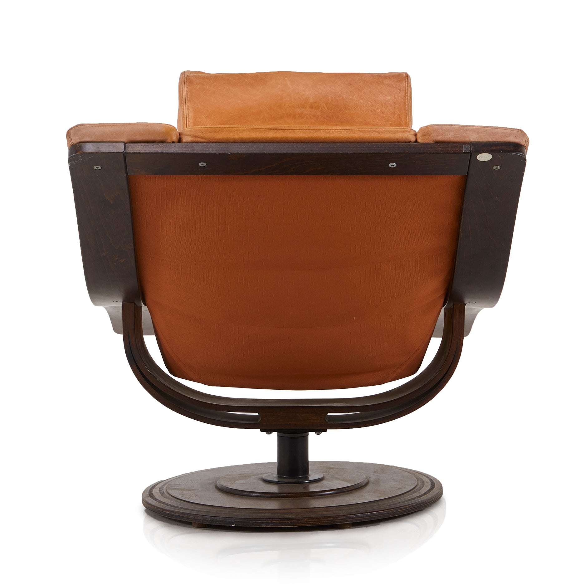 Details: 1980s Brown leather lounge chair with wide armrests, attached headrest cushion, mahogany swivel frame, and matching ottoman. Designed by Takashi Okamura & Erik Marquardsen.