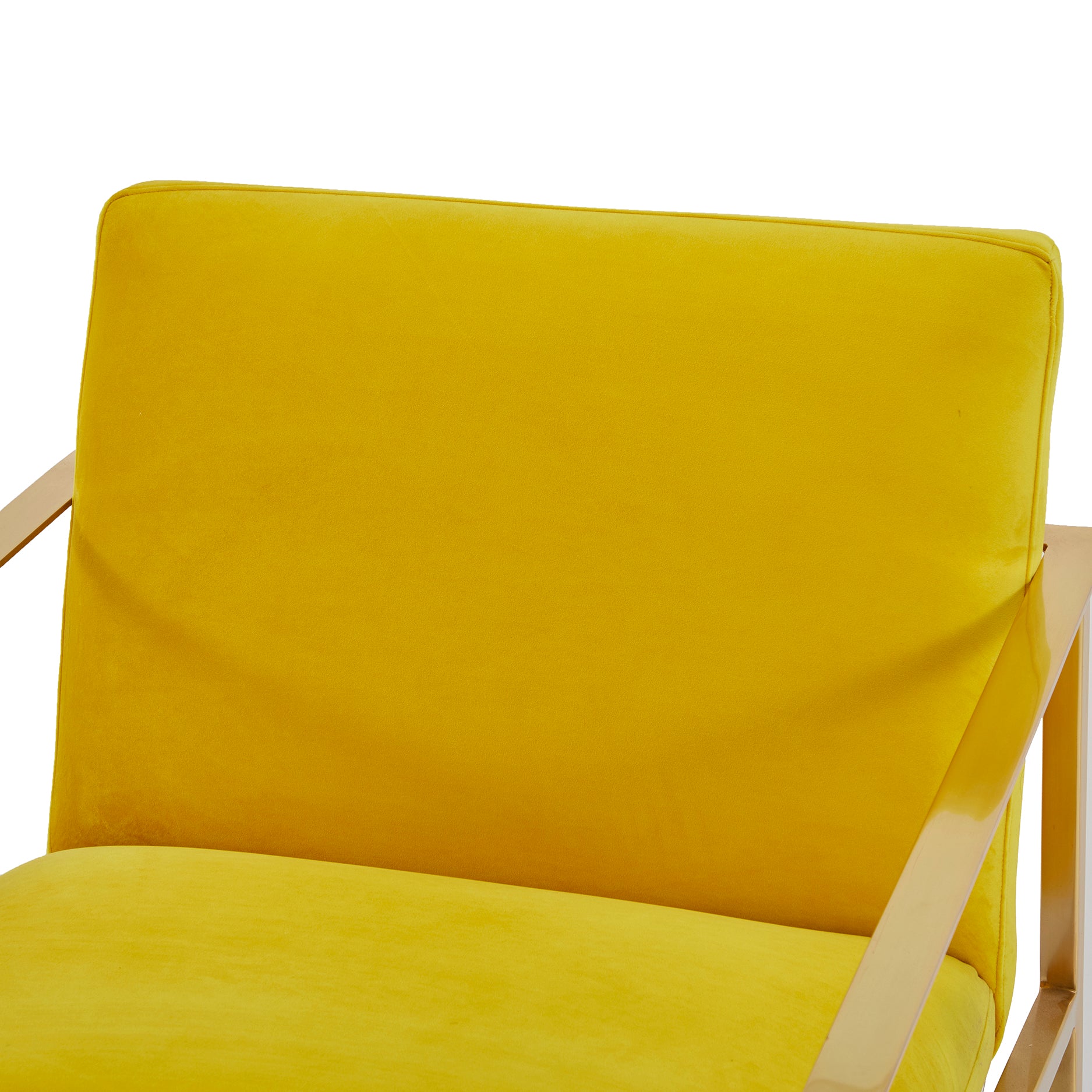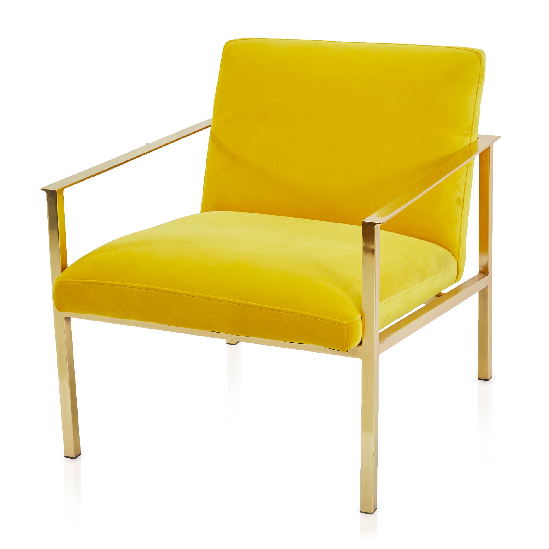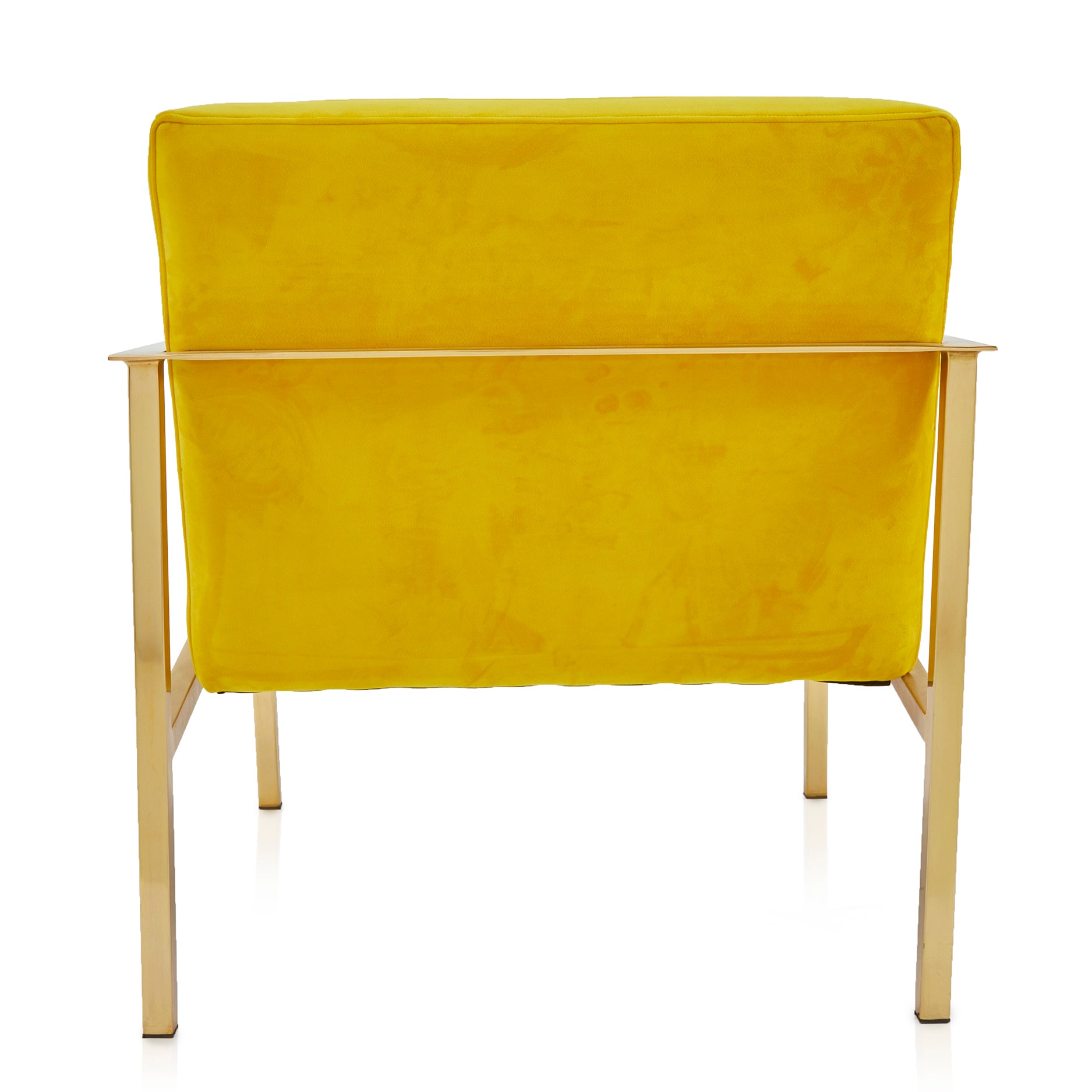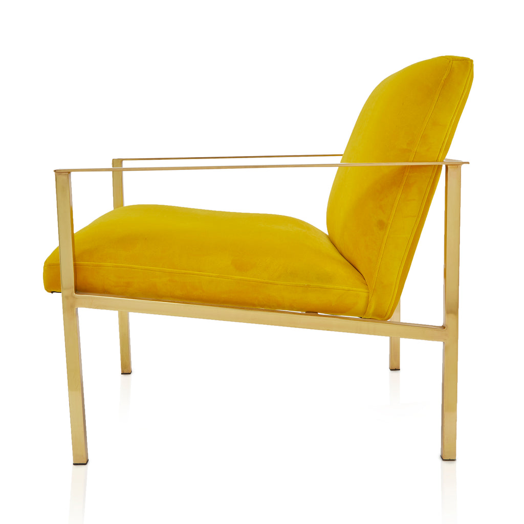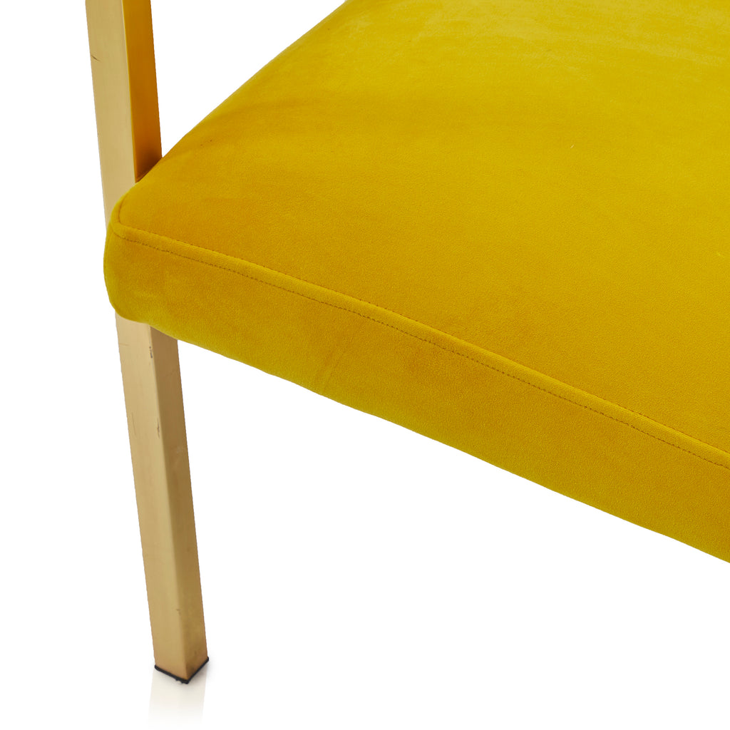 Details: Modern mustard yellow cushion arm chair with gold metal frame, square arms