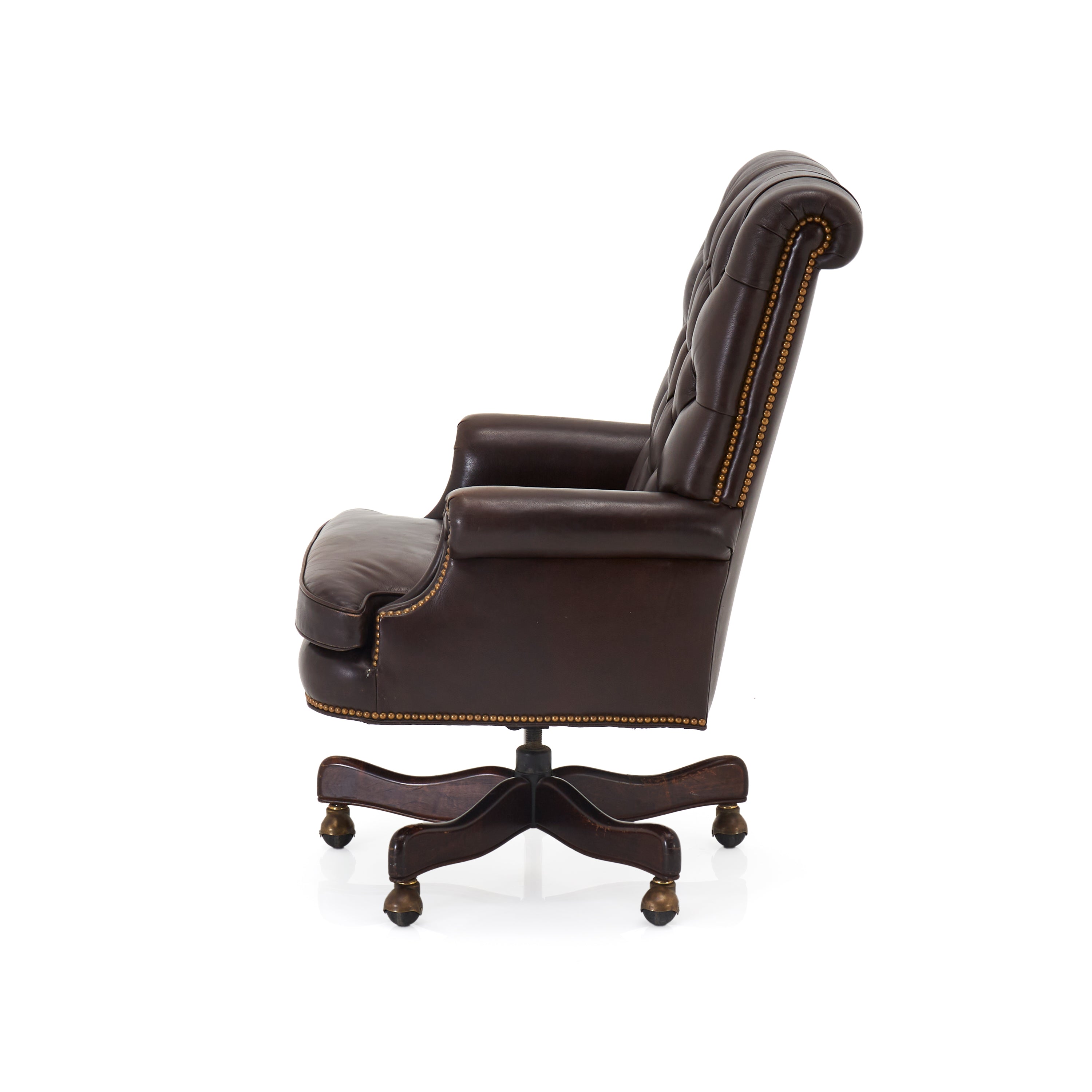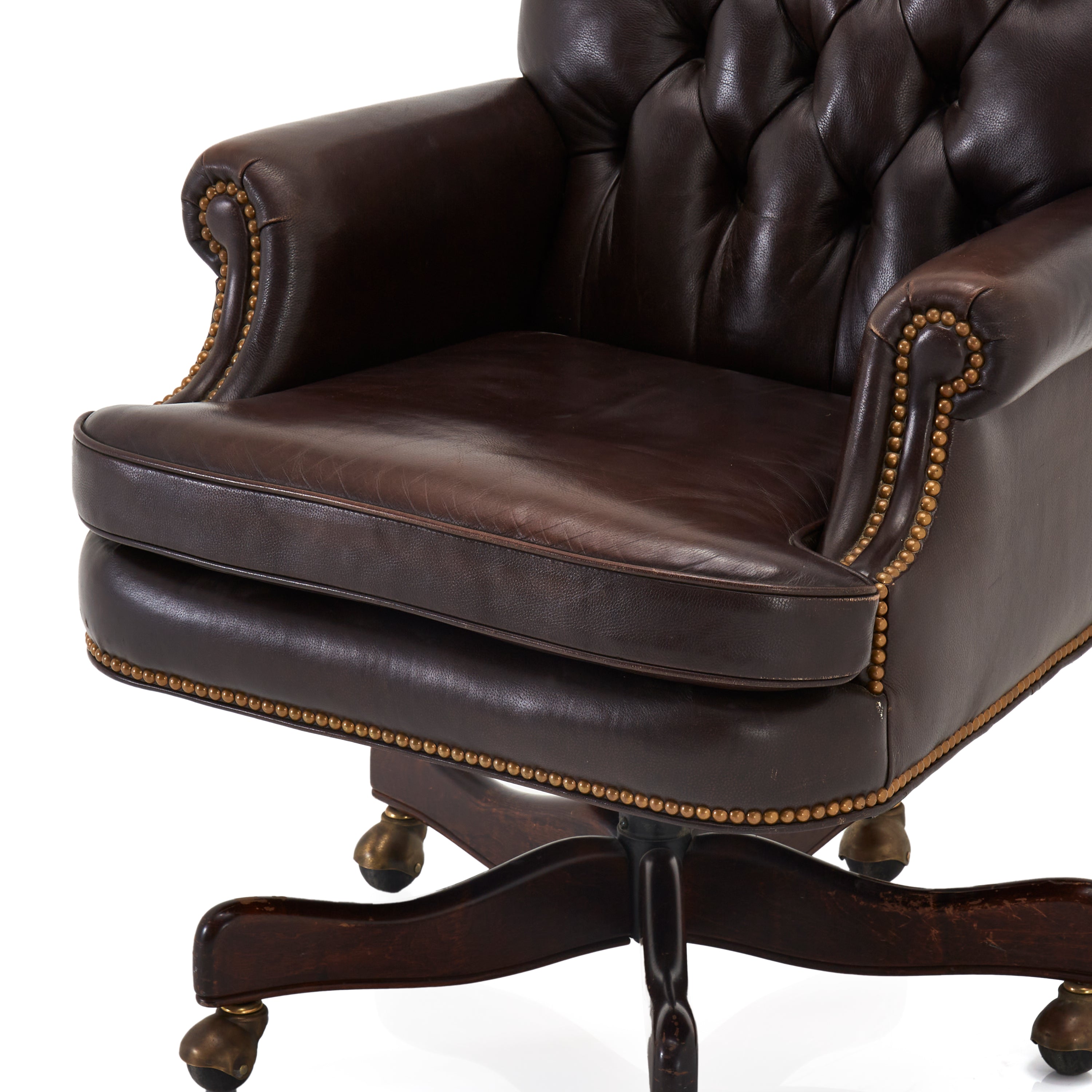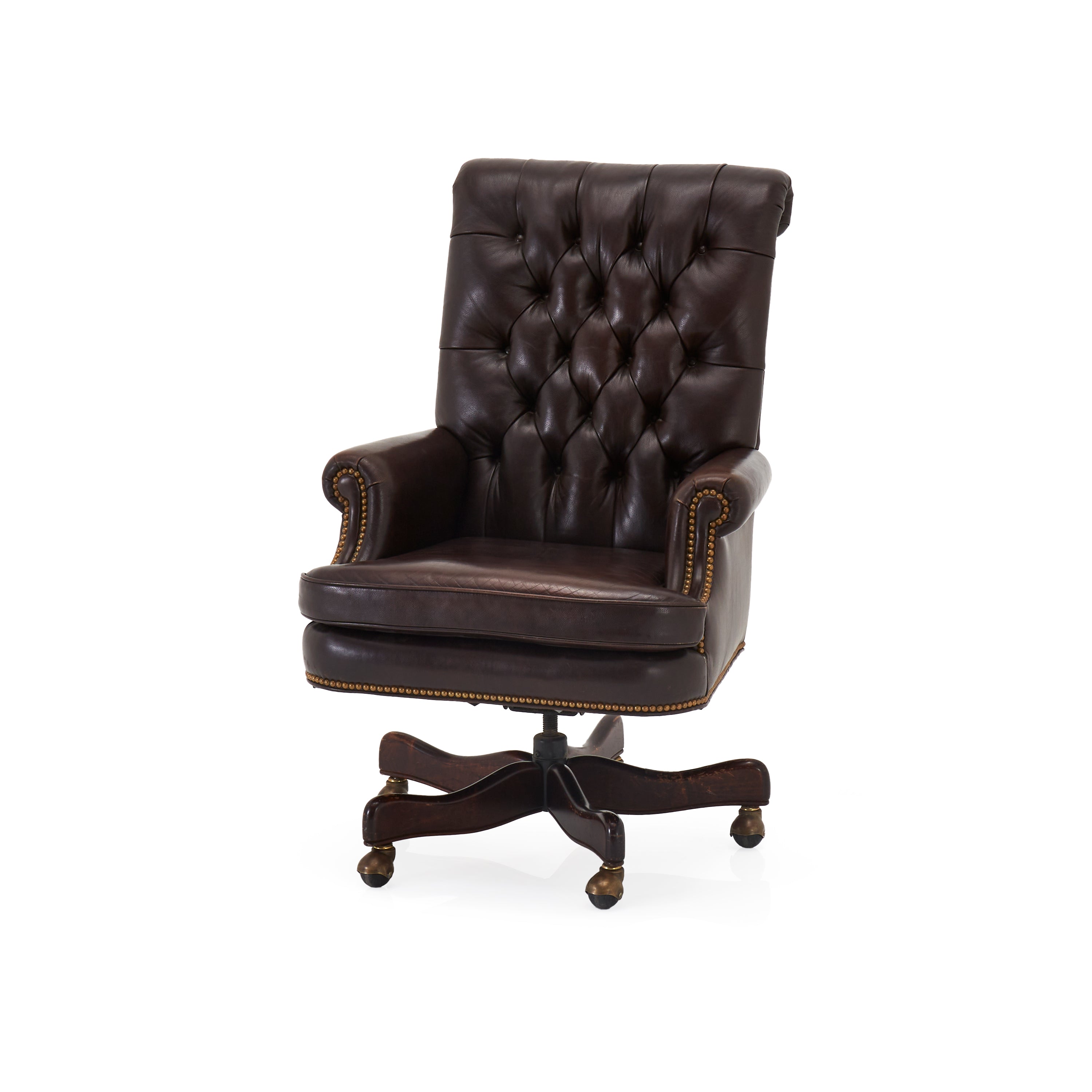 Details: Coffee brown leather office chair with studded border, wood frame, and brass casters Dimensions: 44" H x 27" W x 24" D