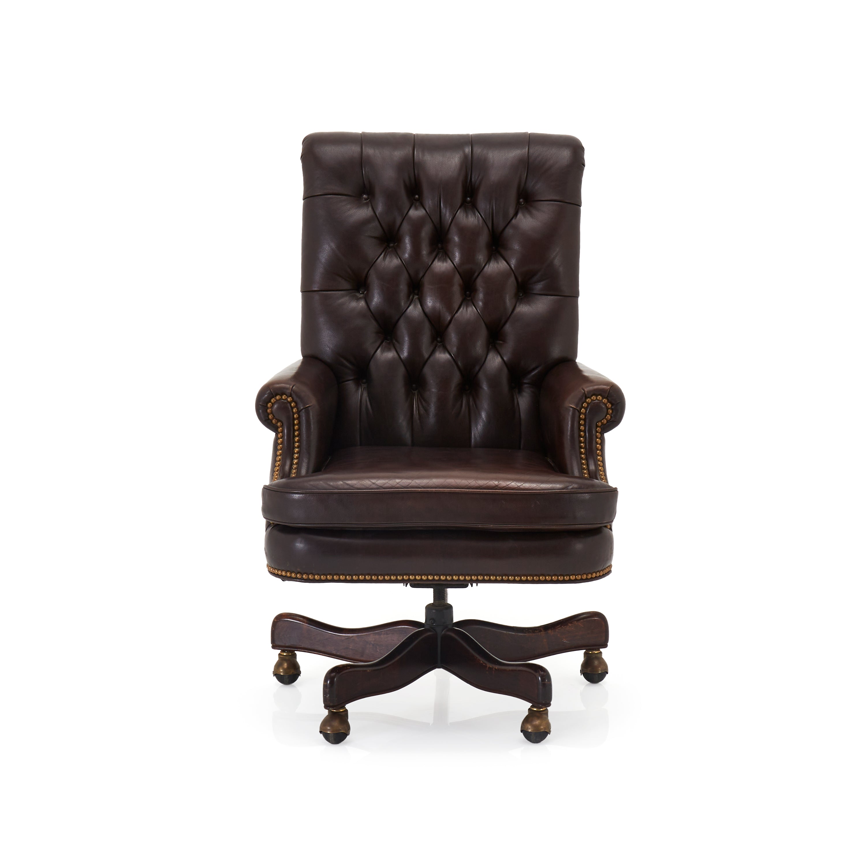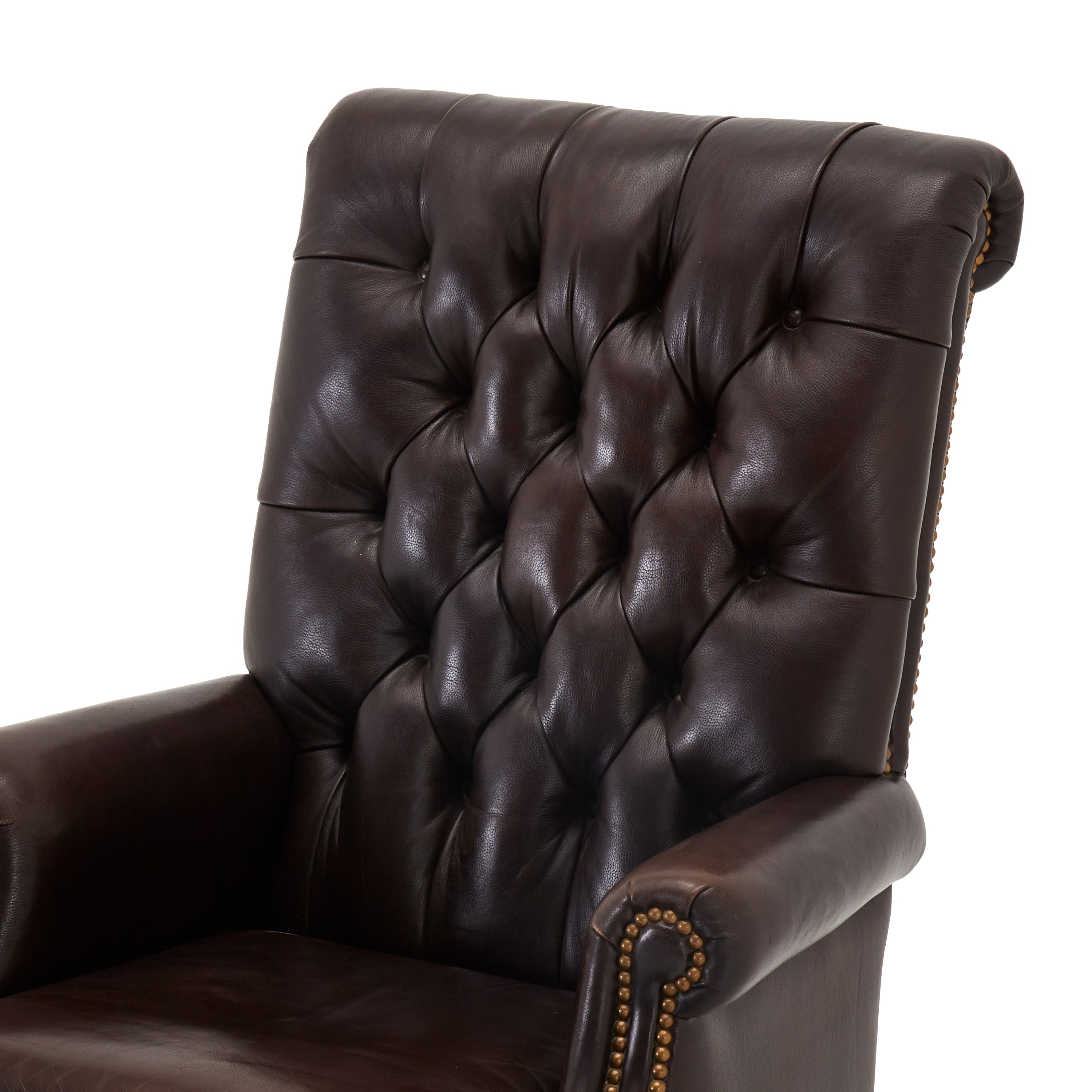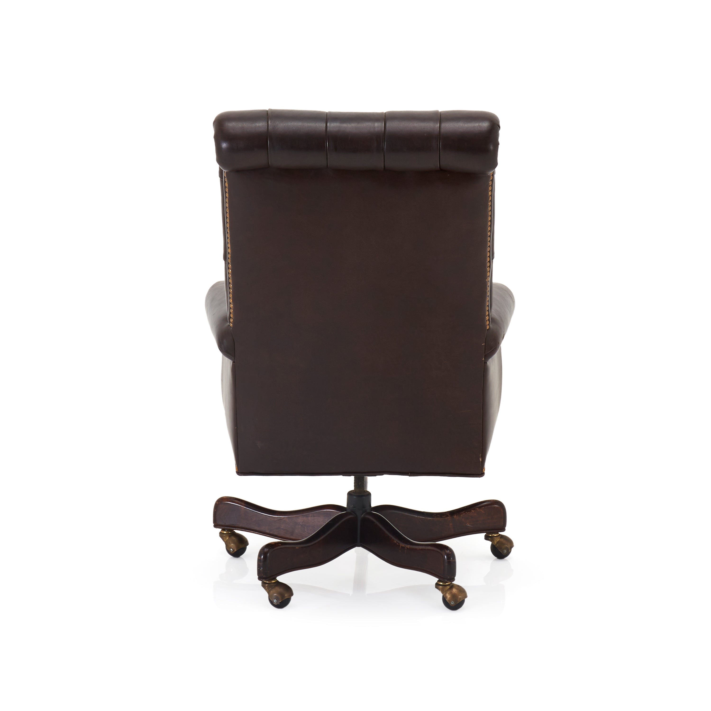 Details: Coffee brown leather office chair with studded border, wood frame, and brass casters Dimensions: 44" H x 27" W x 24" D