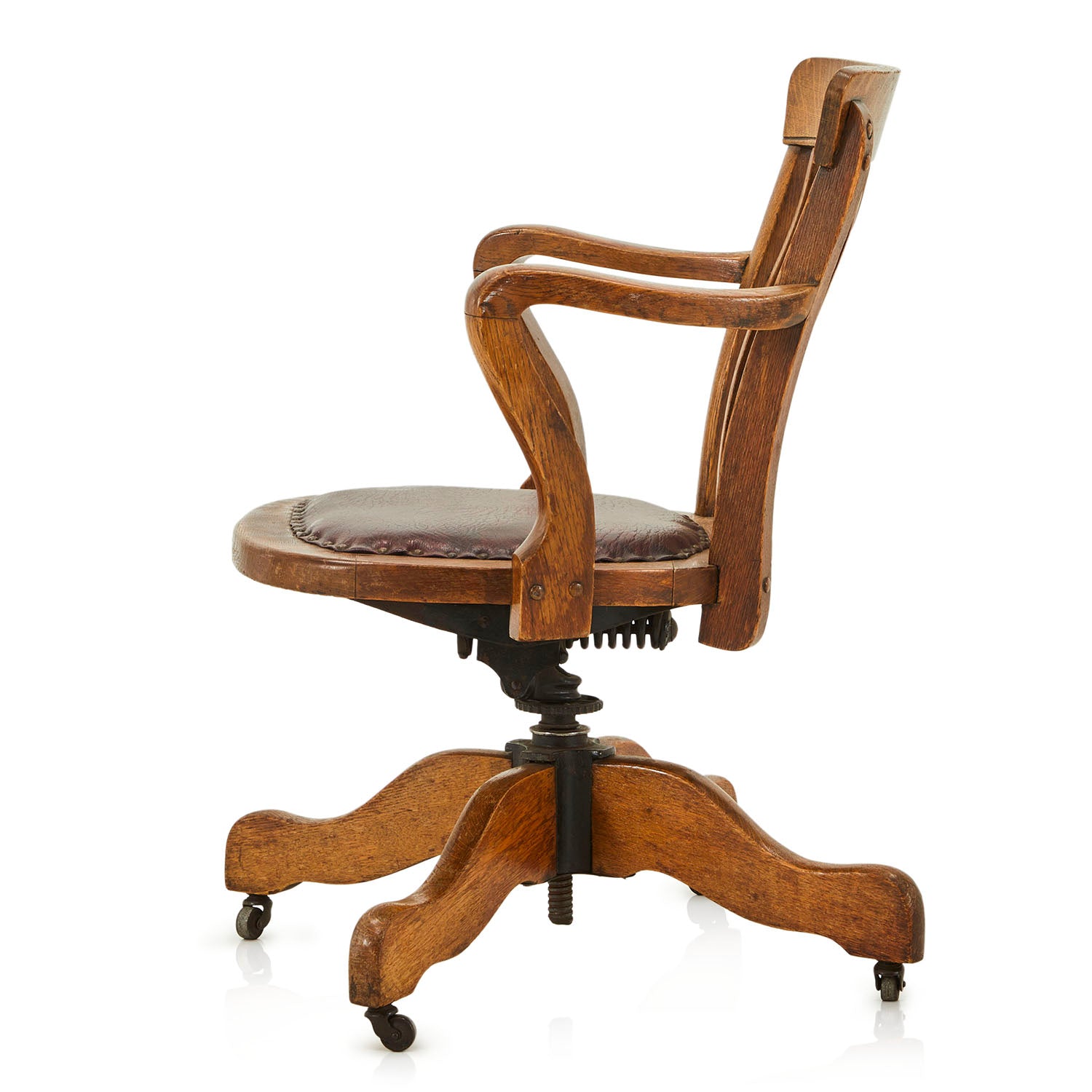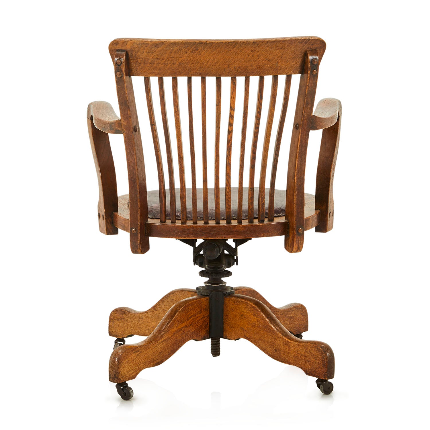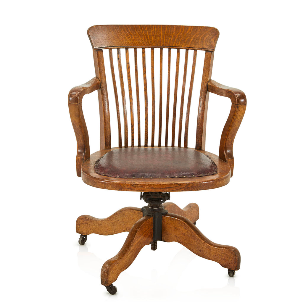 Details: Brown leather office chair with studded border, wood frame, and brass casters Dimensions: 40" H x 24" W x 26" D