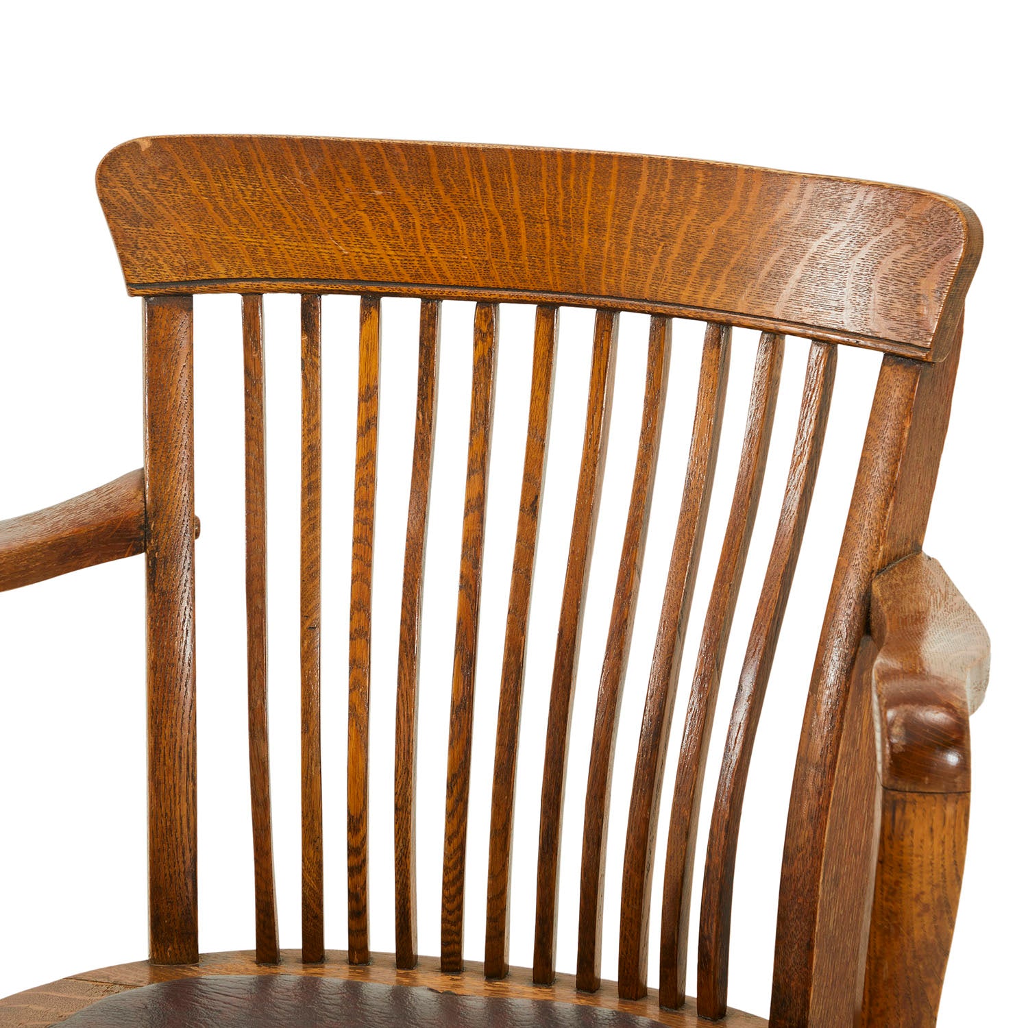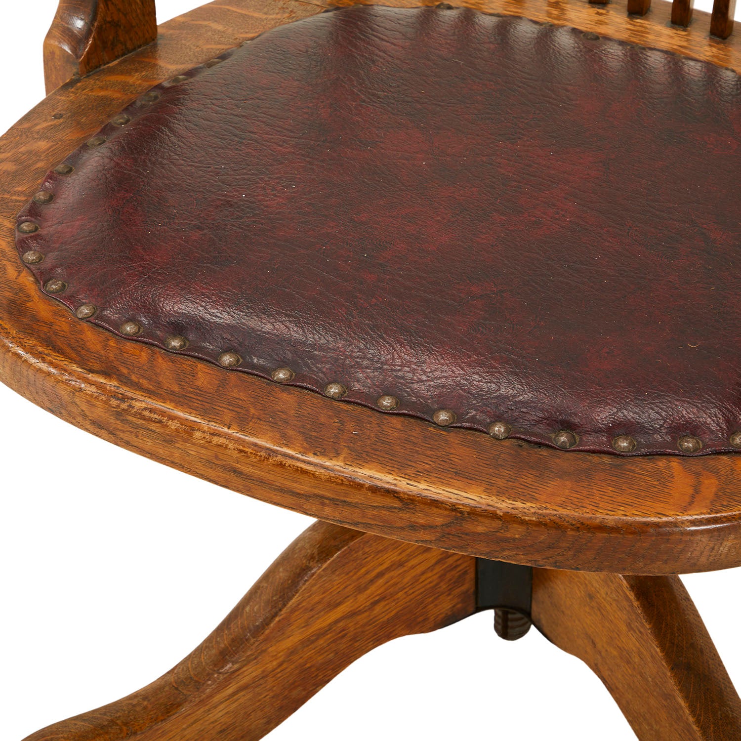 Details: Turn of the century style chair with black leather cushion and antique wood Dimensions: 33" H x 25" W x 23" D
