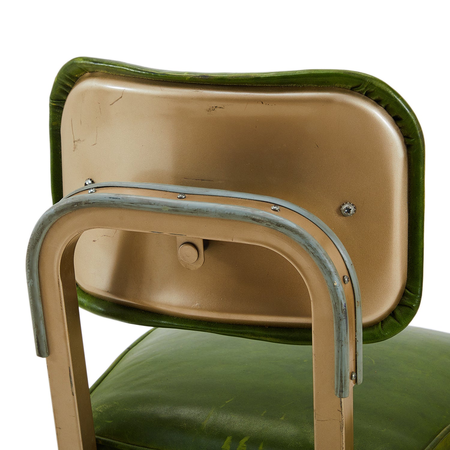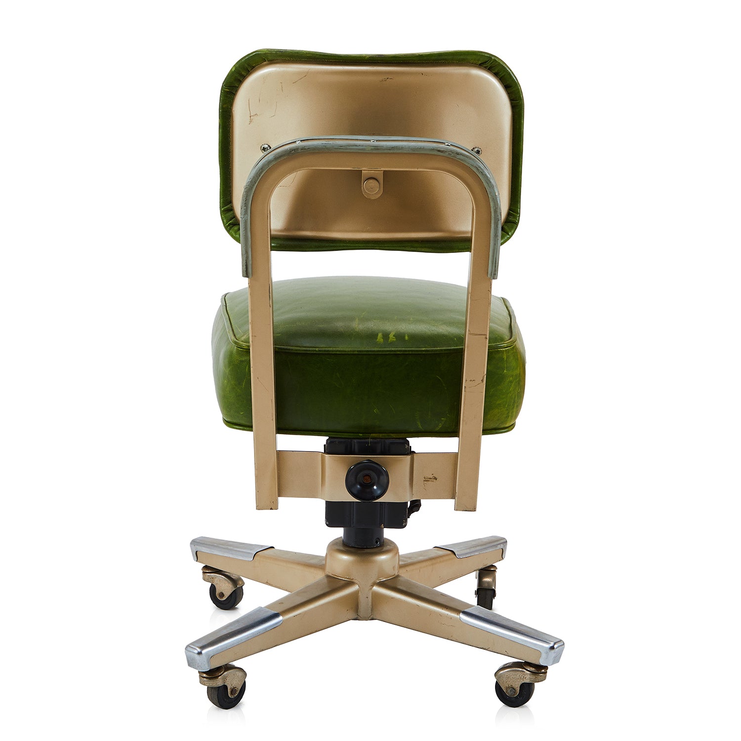 Details: Green vinyl rolling office swivel chair with leather upholstery Dimensions: 33" H x 16" W x 18" D Quantity: 1