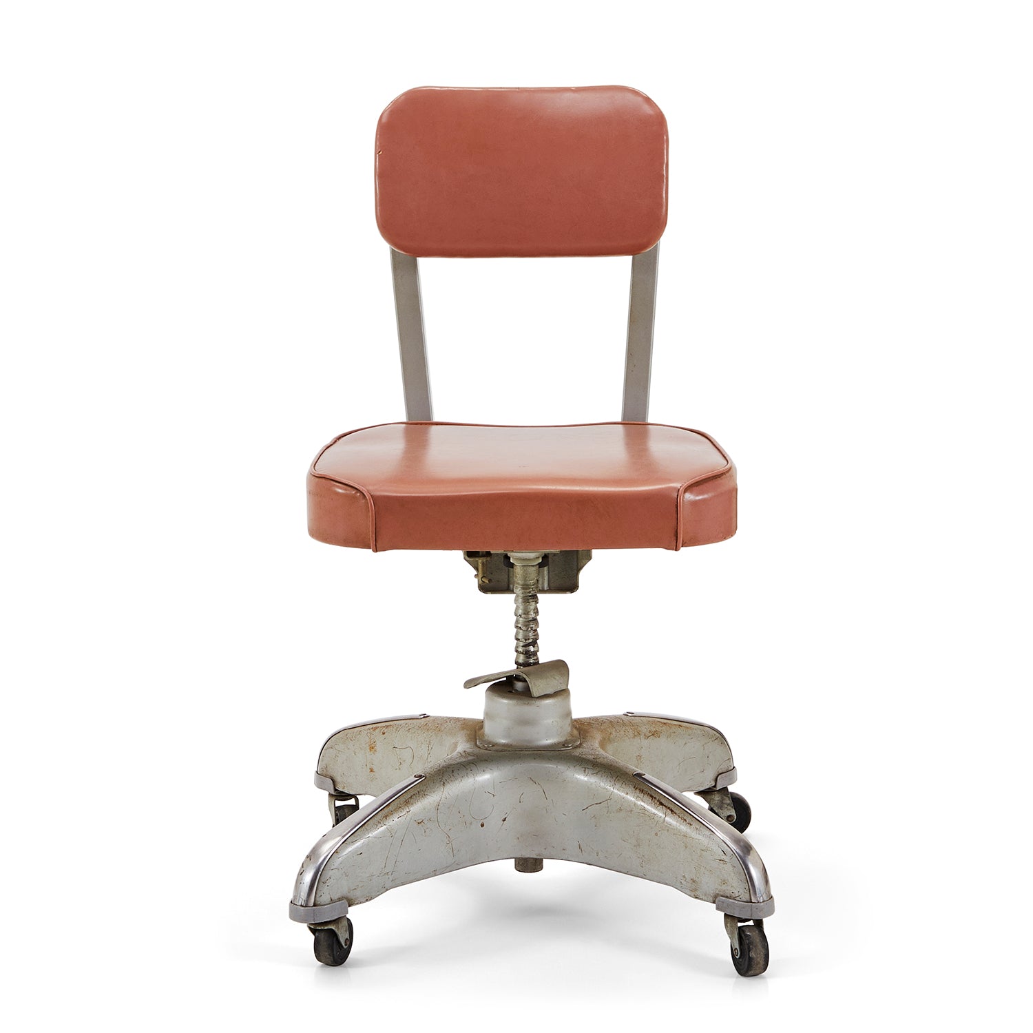 Details: Rolling office or medical chair with pink upholstered seat and back and adjustable height Dimensions: 30" H x 25" W x 25" D